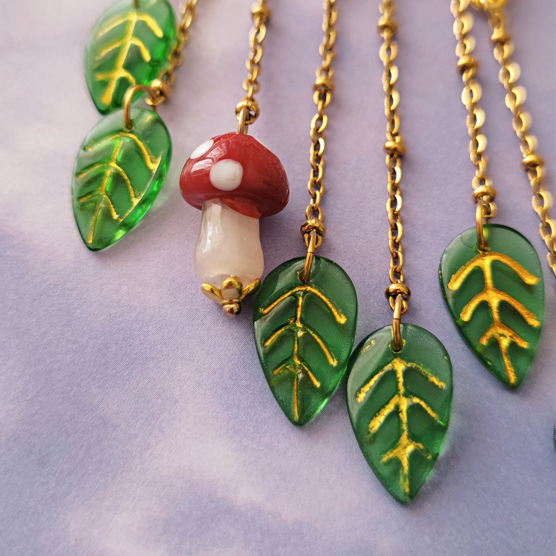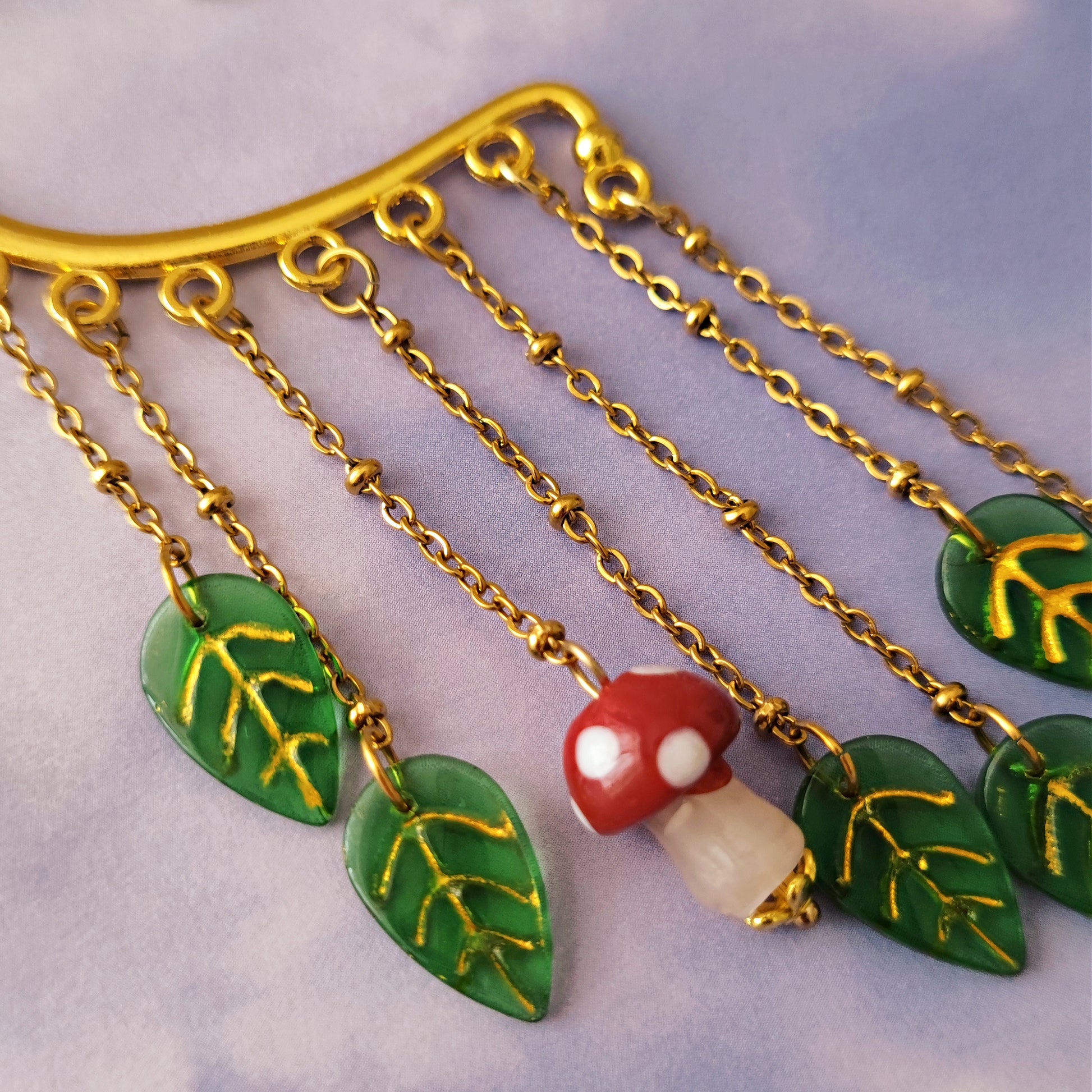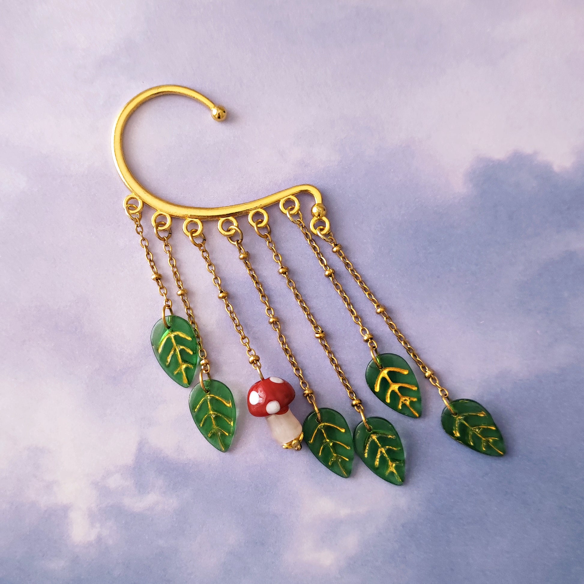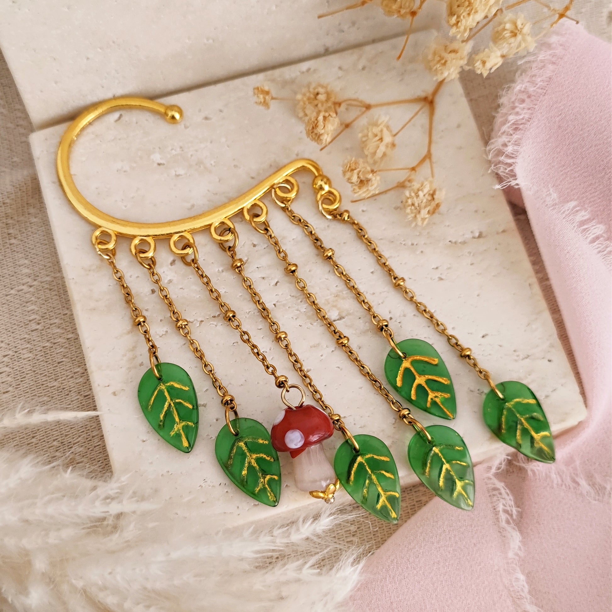 Made of a gold plated copper ear cuff, it is embellished with green glass leaves and a cute glass amanita mushroom, all dangling from gold plated stainless steel satellite long chains.