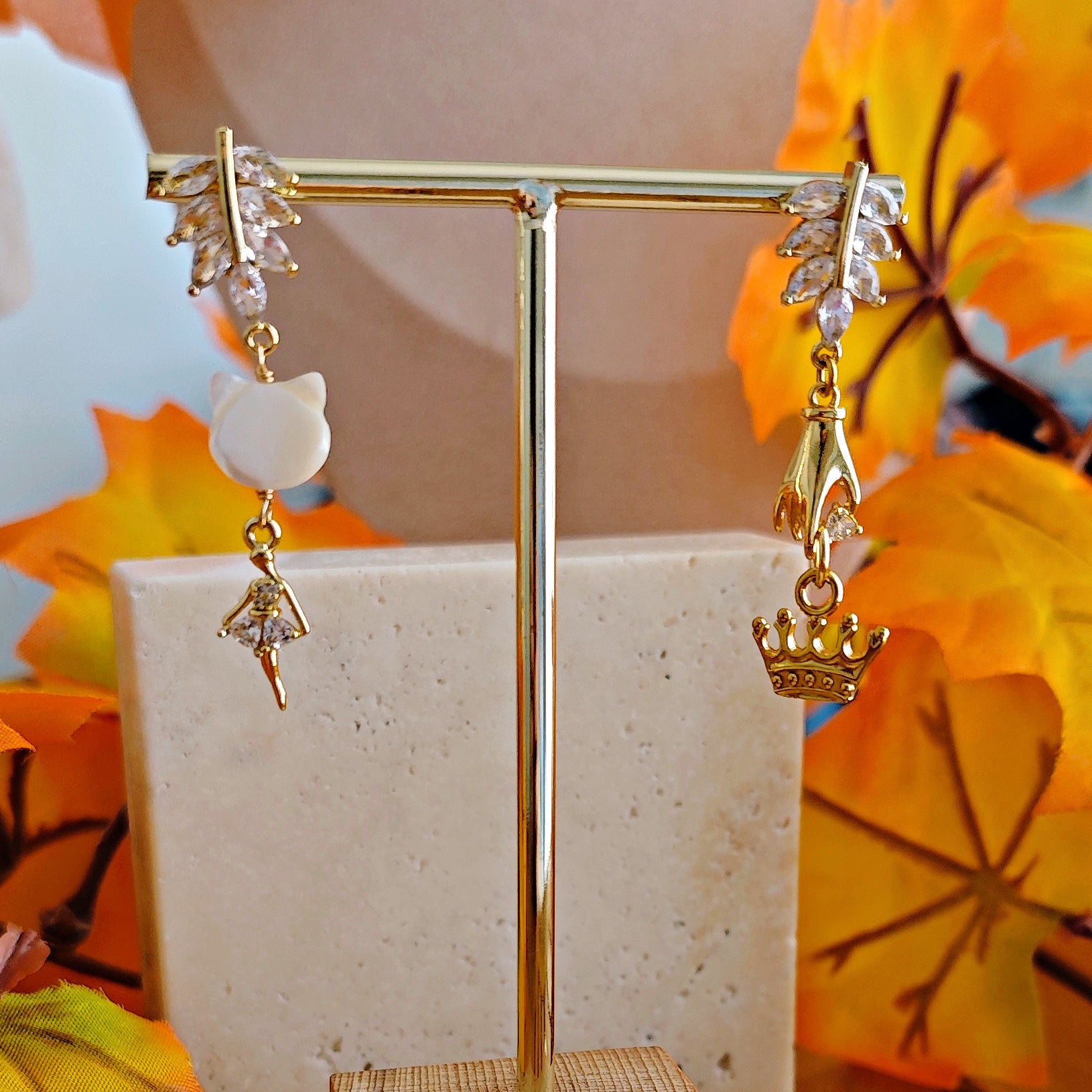 Transforming Love...Asymmetric earrings inspired by the fairy tale The White Cat by Marie-Catherine d’Aulnoy, celebrating love, transformation, and magic. On one side, a white mother-of-pearl cat holds a young girl, symbolizing the fairy tale's metamorphosis and grace. On the other, a hand holds a heart from which a crown hangs, evoking the prince and the bond of love that unites the protagonists. The leaf-shaped posts studded with crystals complete the design, making it elegant and poetic.