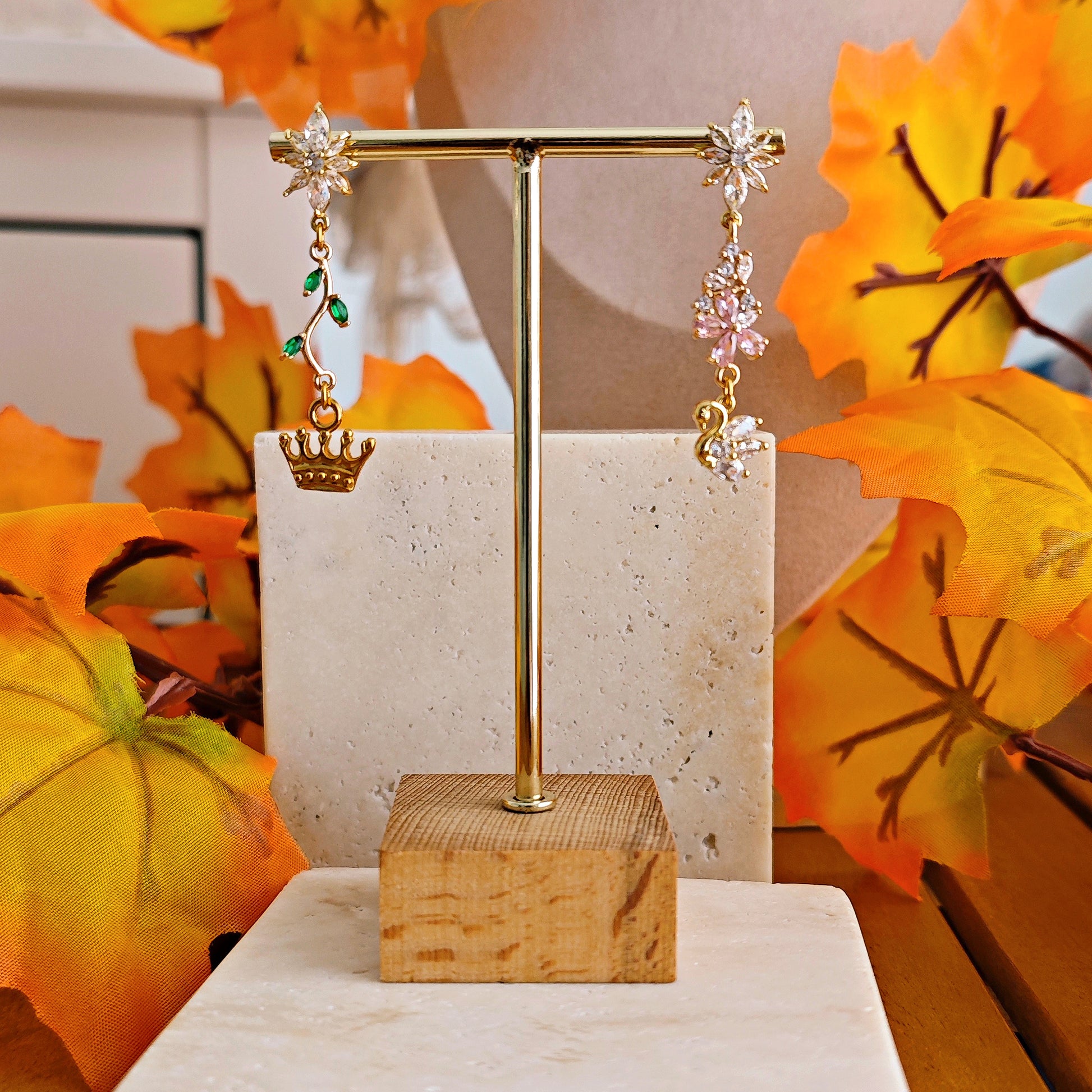Between enchantment and courage, the heart leads to transformation... Asymmetric earrings that capture the poetry of Hans Christian Andersen's fairy tale The Wild Swans. On one side, a branch of green crystal leaves, symbolizing nettles and sacrifice, supports a crown representing Princess Elisa. On the other, a branch of pink crystal flowers holds a swan, a symbol of transformed siblings and brotherly love. Crafted from 14k gold-plated brass with glass and cubic zirconia crystal details, these earrings intertwine courage, magic, and fairytale enchantment.