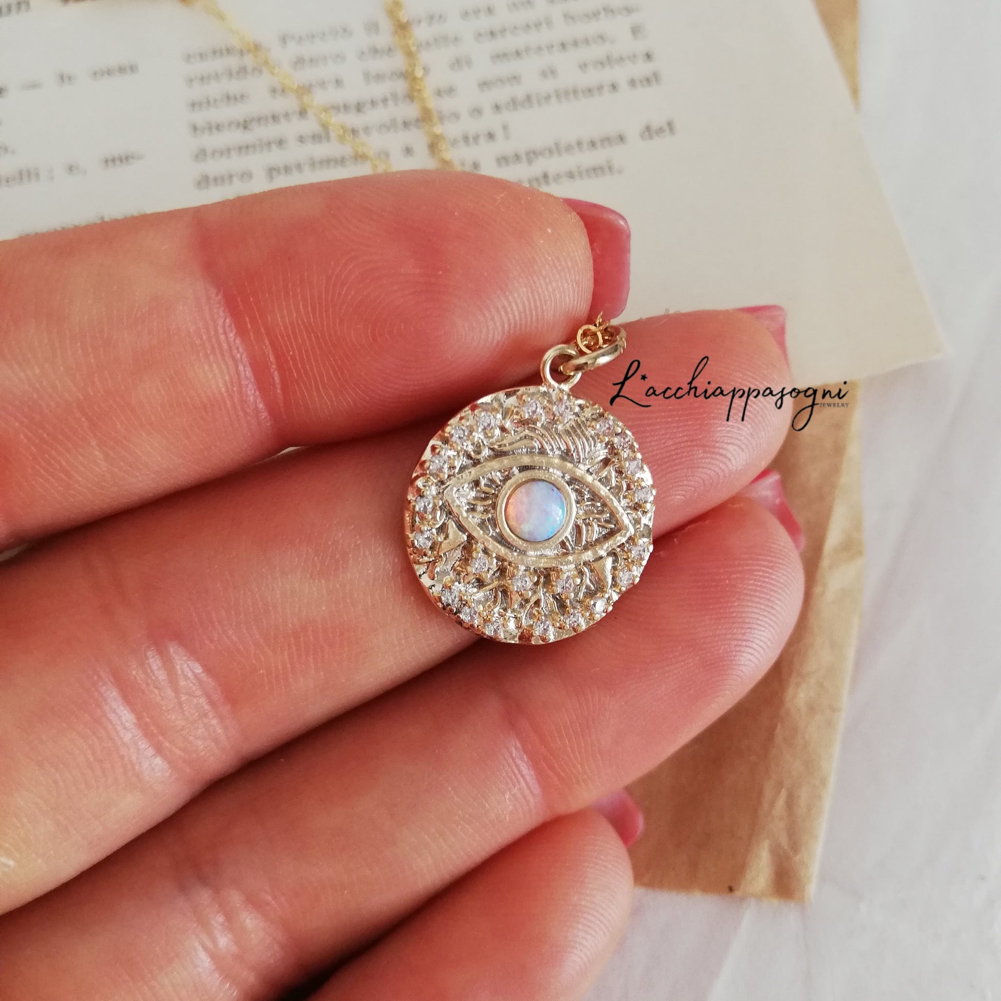 This evil eye necklace is made of 16k gold plated brass evil eye coin pendant of 17mm with white opal thiny cabochon in the center of the eye and cubic zirconia rhinestones.