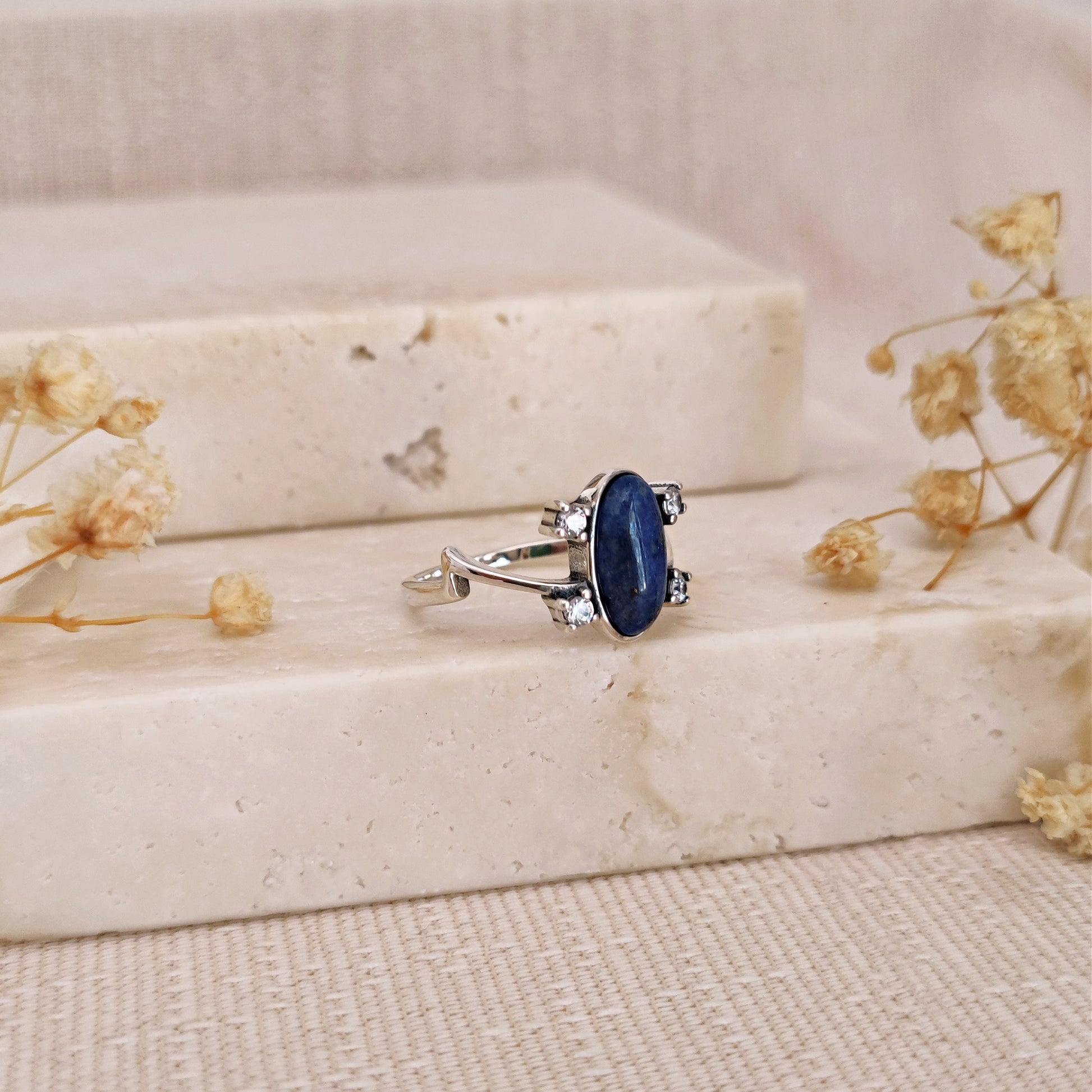 This ring is made of 925 Sterling Silver for the setting, a real Lapis Lazuli cabochon and four zirconia cubica.
