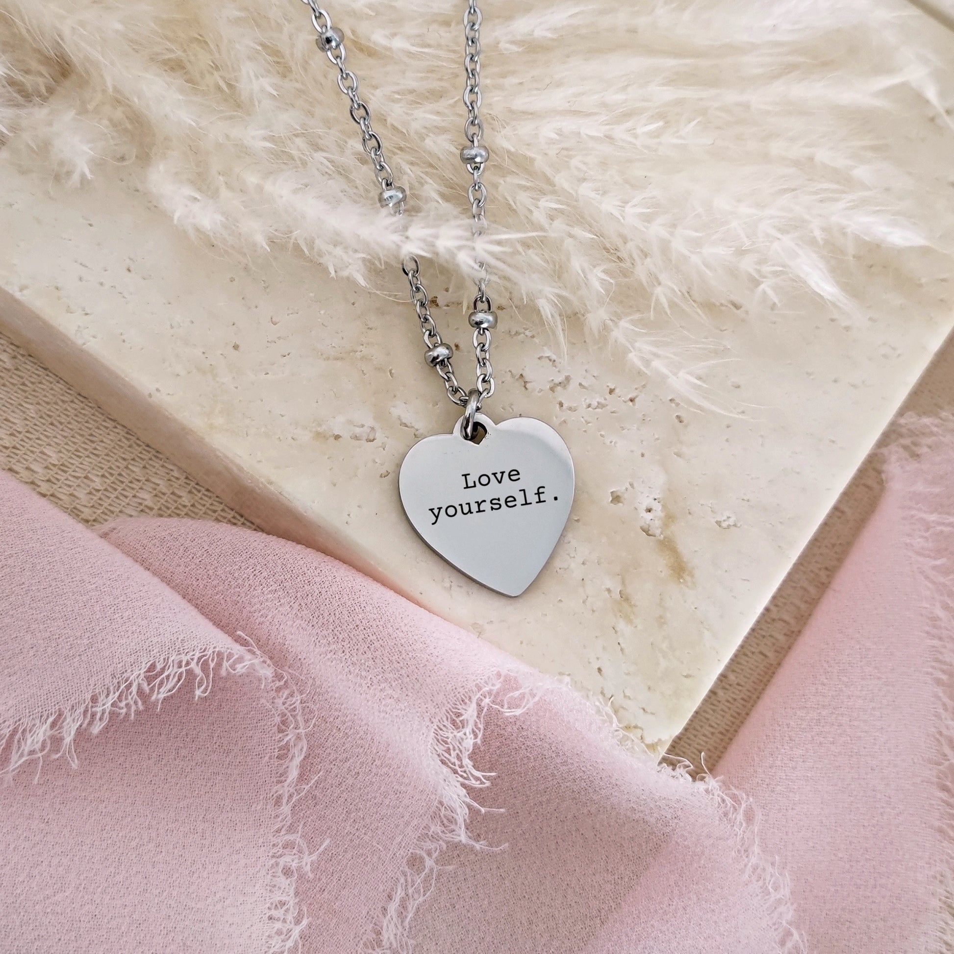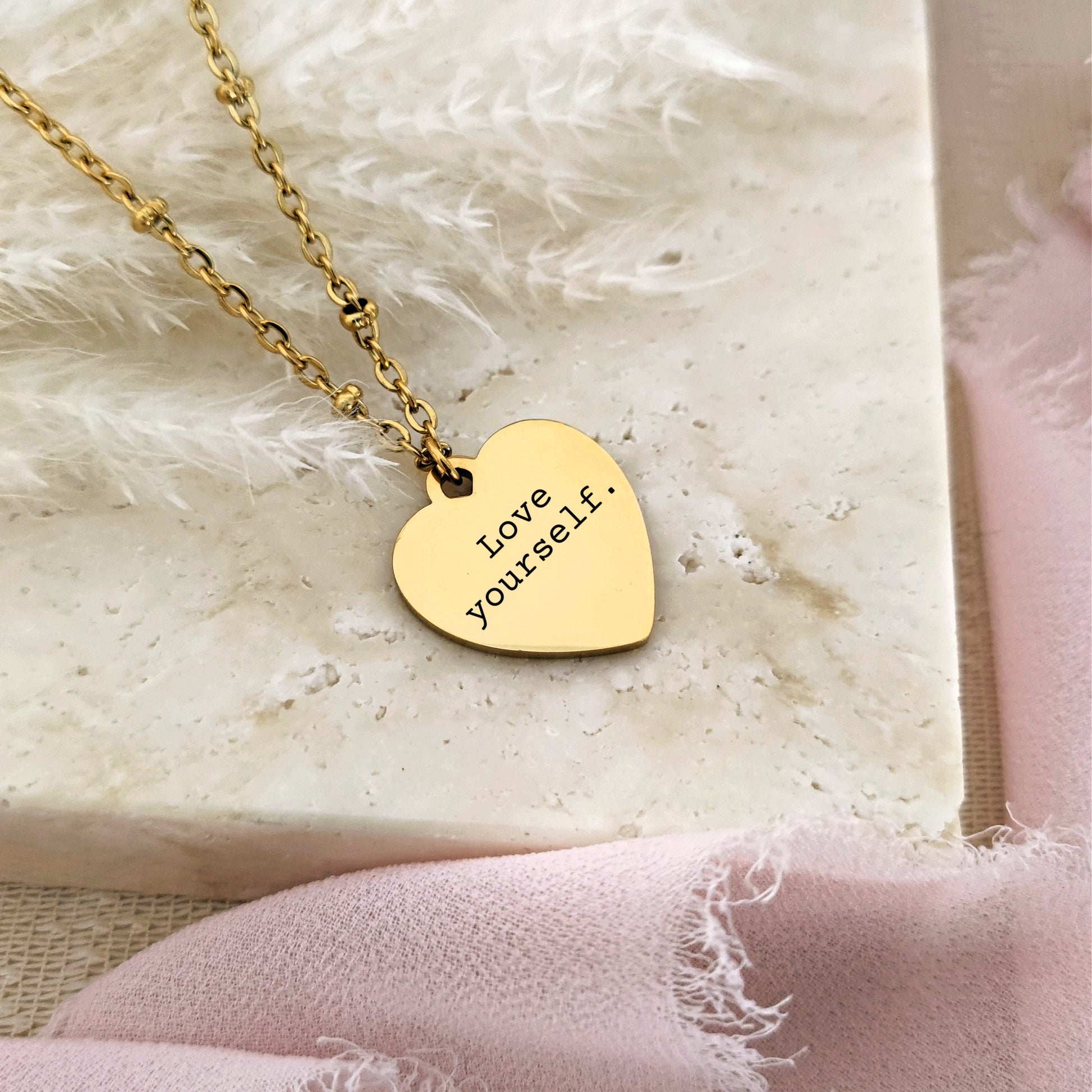 The back of the pendant features a powerful message, Diode laser engraved, "Love yourself", and can also be personalized with a special phrase by your choice!