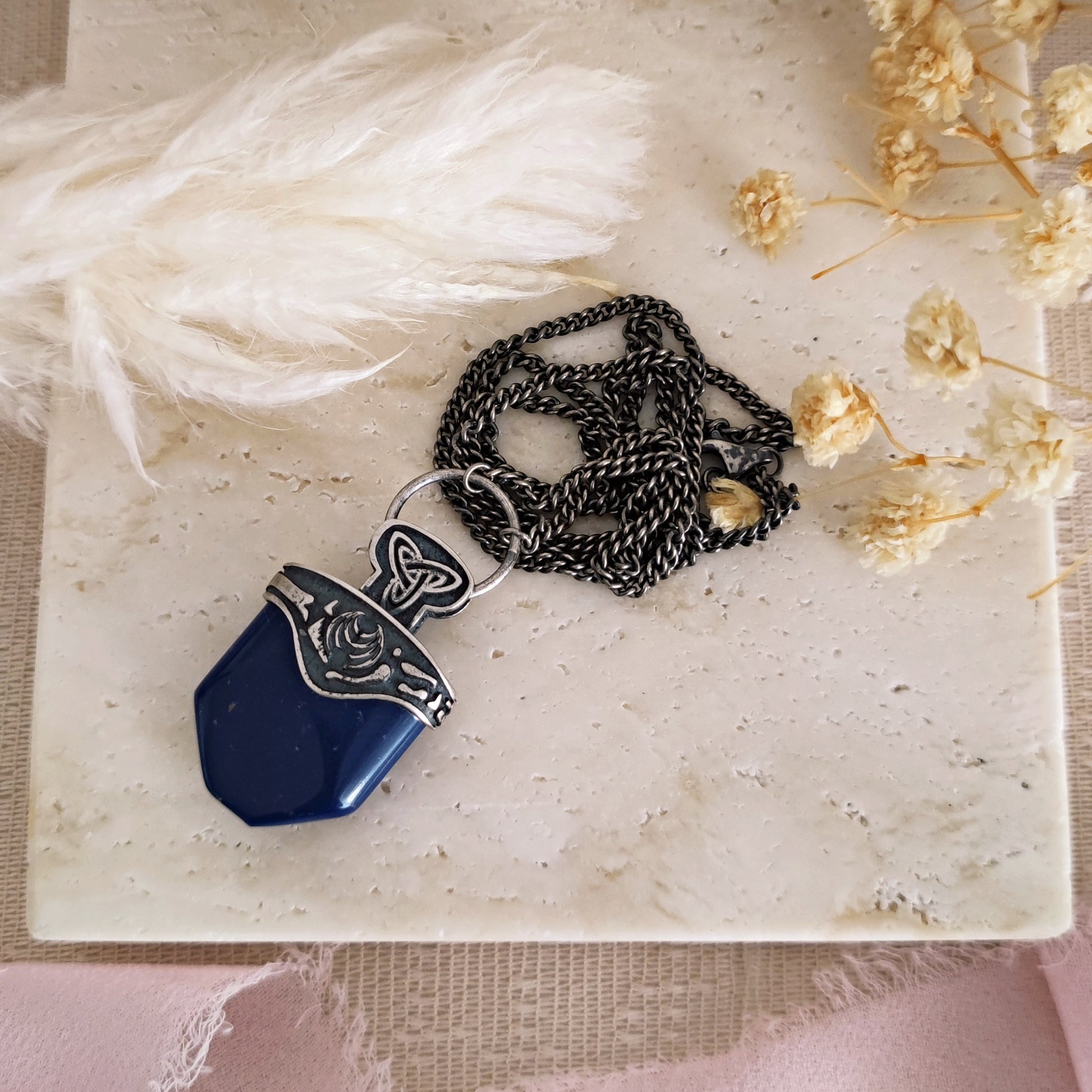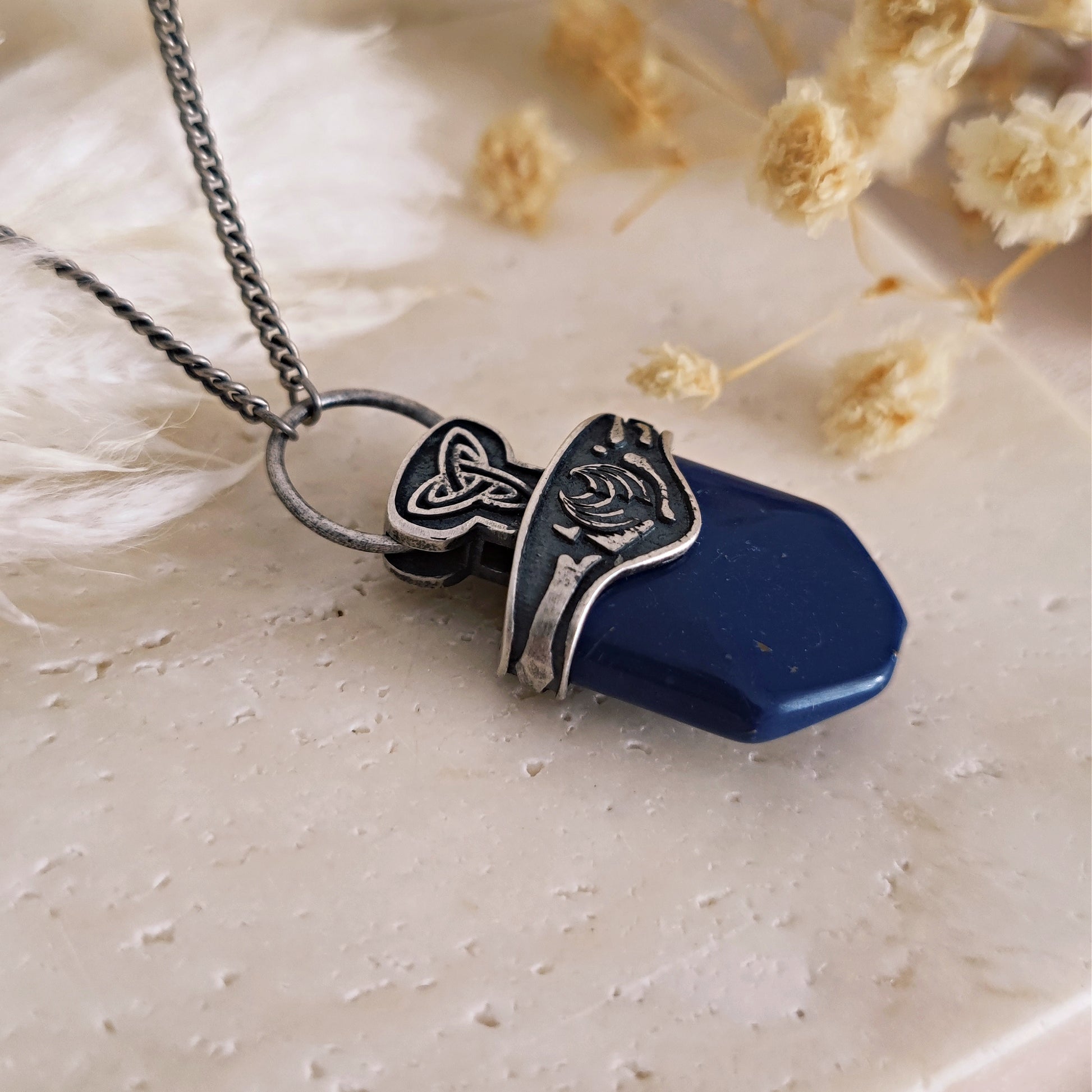 This necklace is entirely made of antiqued 925 silver, with a blue resin stone.