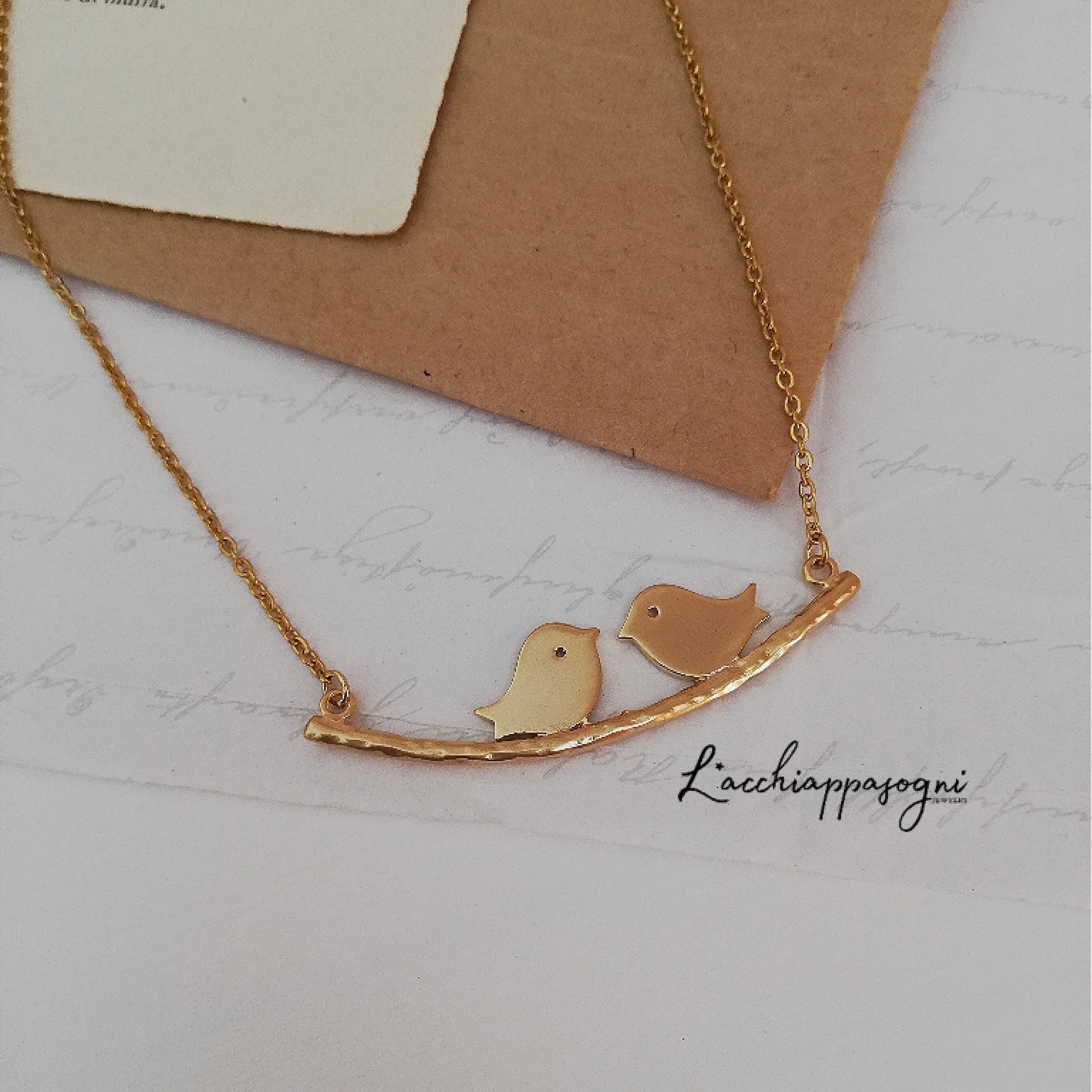 I realized it with a matte gold 16k plated gold brass birds on a branch pendant connector and a 14k gold plated stainless steel chain (customizable length).