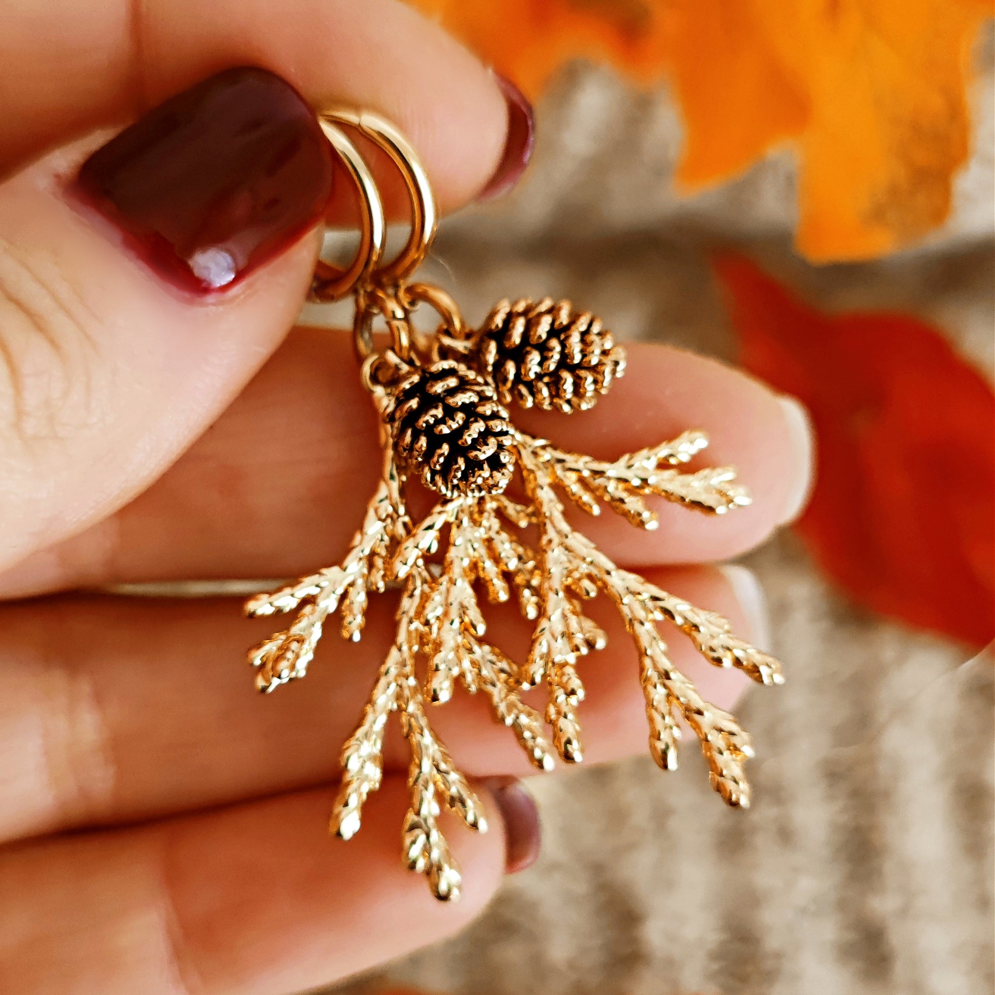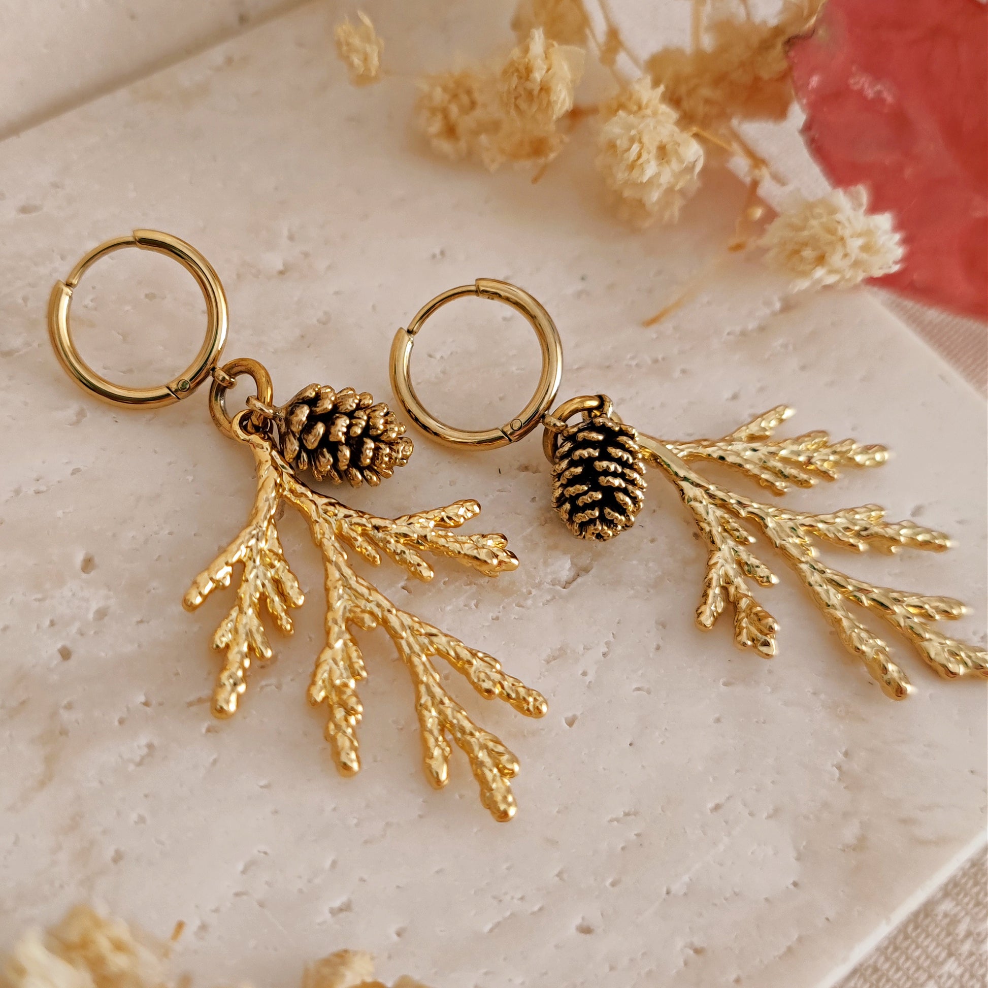 The earrings are composed of 14k gold-plated stainless steel hoops, 16k gold-plated brass pine branches and antique gold-plated brass pine cones, and are the quintessence of the warm and welcoming atmosphere that only nature can offer.