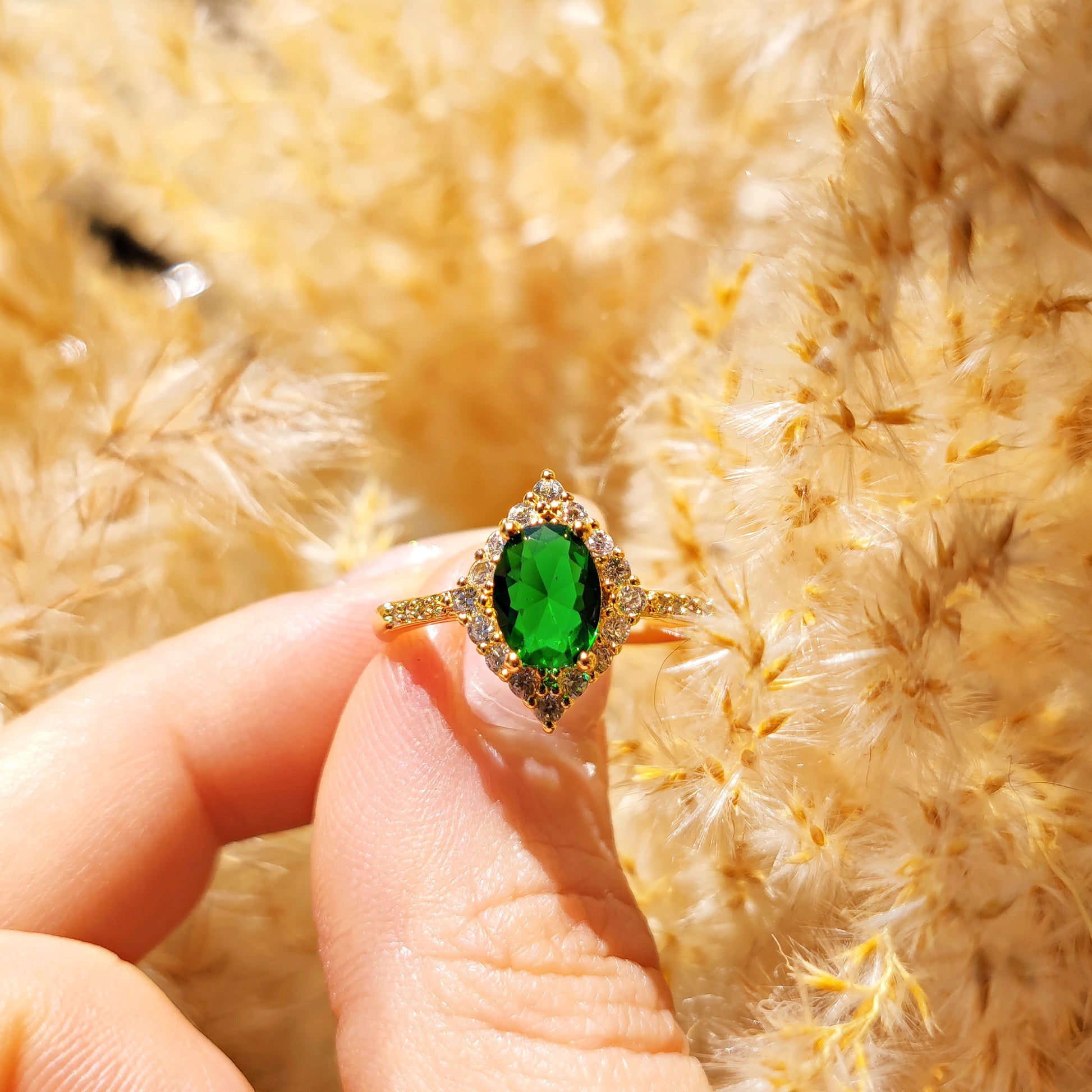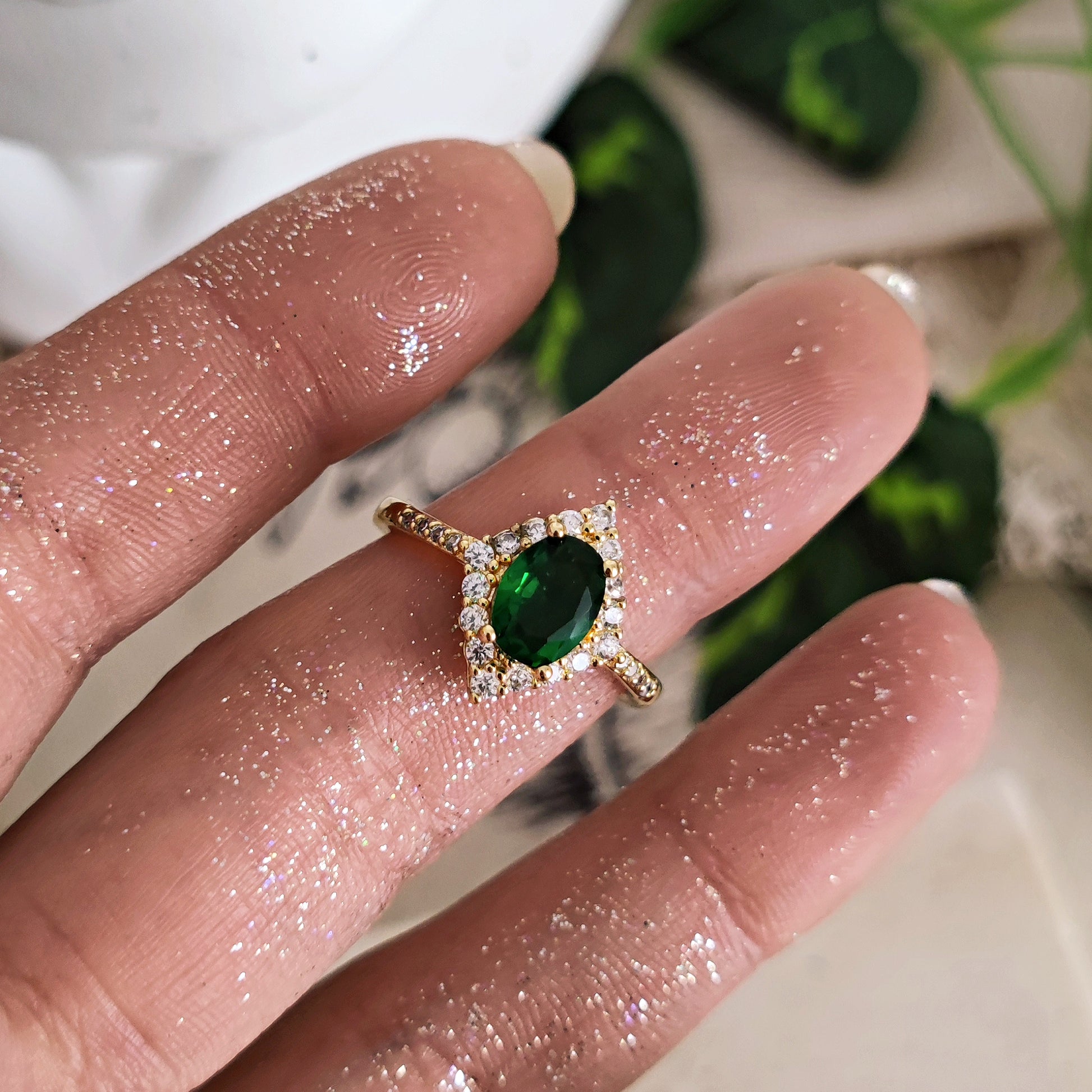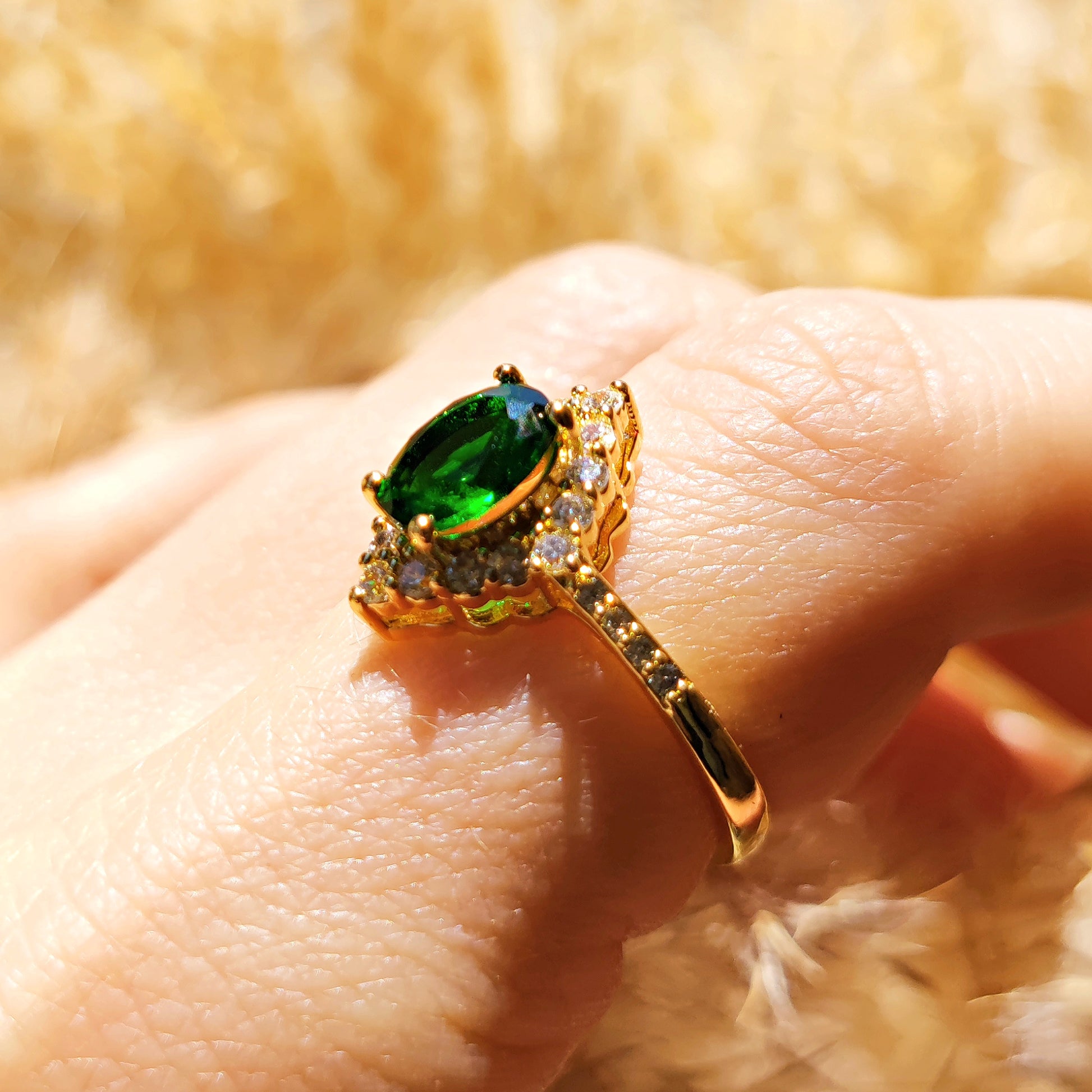 The warm and enveloping tones of gold blend with the intense forest green of this oval cubic zirconia crystal to give life to a ring with a regal flavor, inspired by the goddess Demeter, the Greek goddess daughter of Cronos and Rhea who presided over the Natgura, the crops and crops.