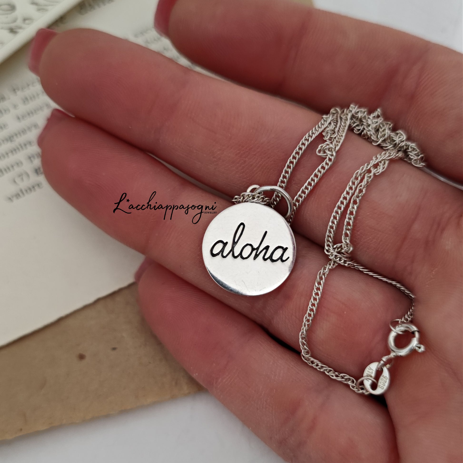 The "Aloha" necklace is entirely made of 925 sterling silver, and it is composed by a coin pendant of 20 mm approx. with the hawaiian word "Aloha" engraved, connected with love and friendship and used to say hello or goodbye.