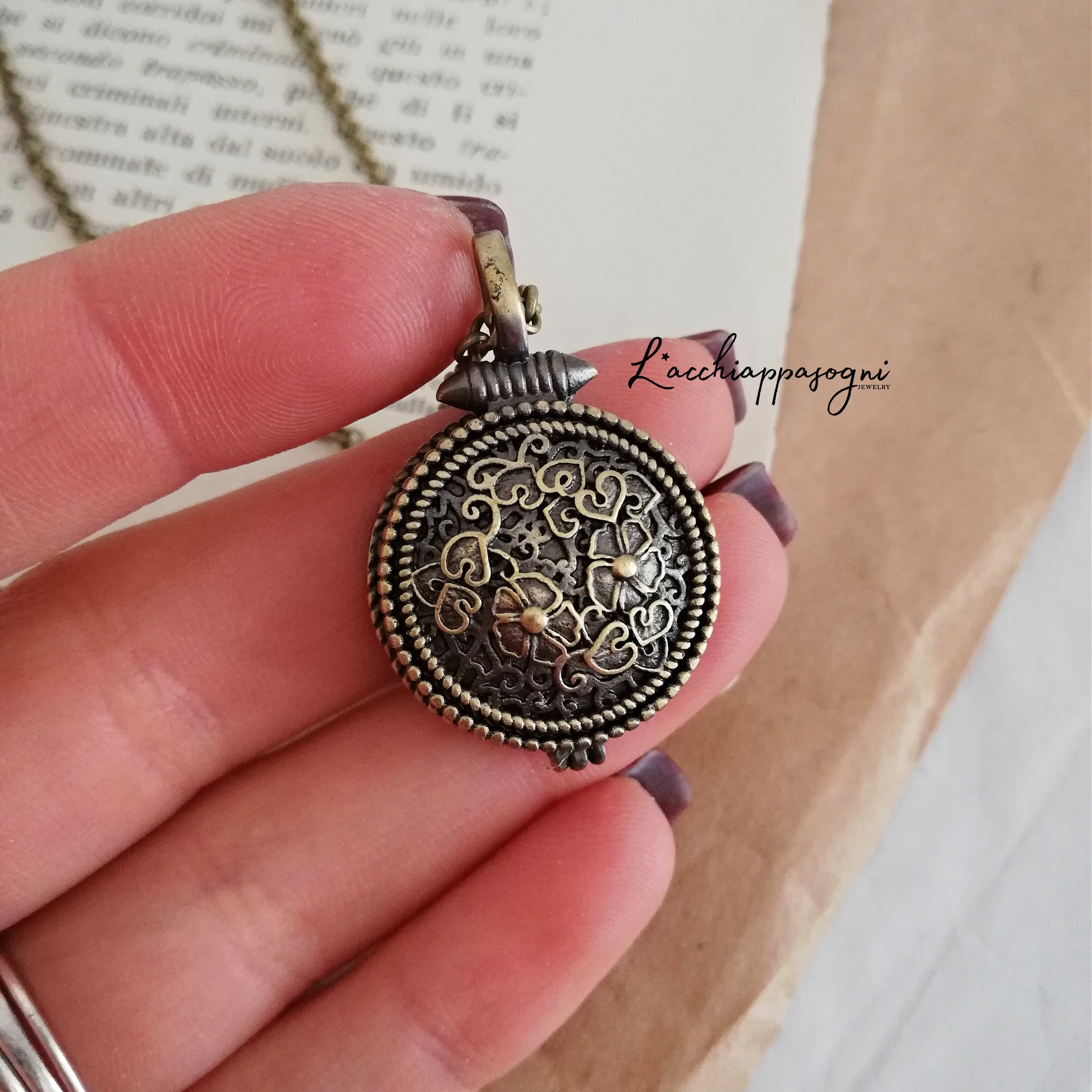 Consisting of a bronzed brass locket with splendid floral motifs and an antiqued brass chain, it holds dried flower petals inside.