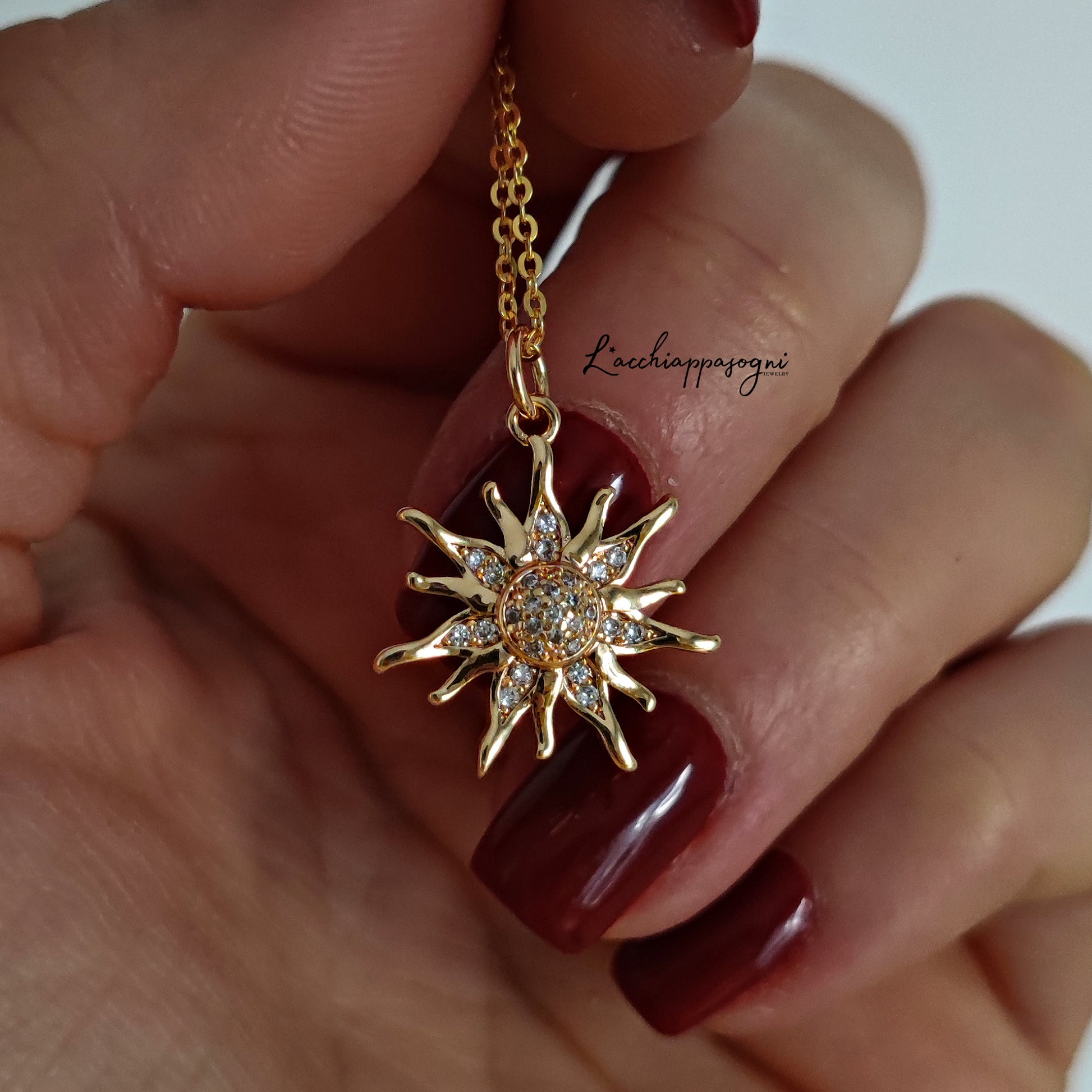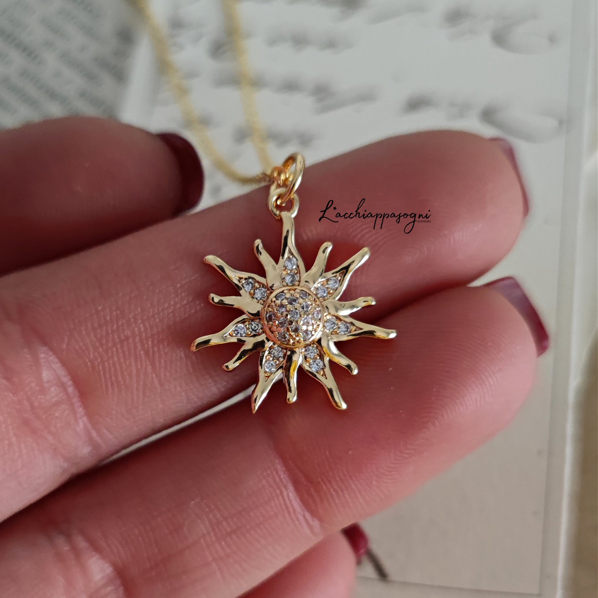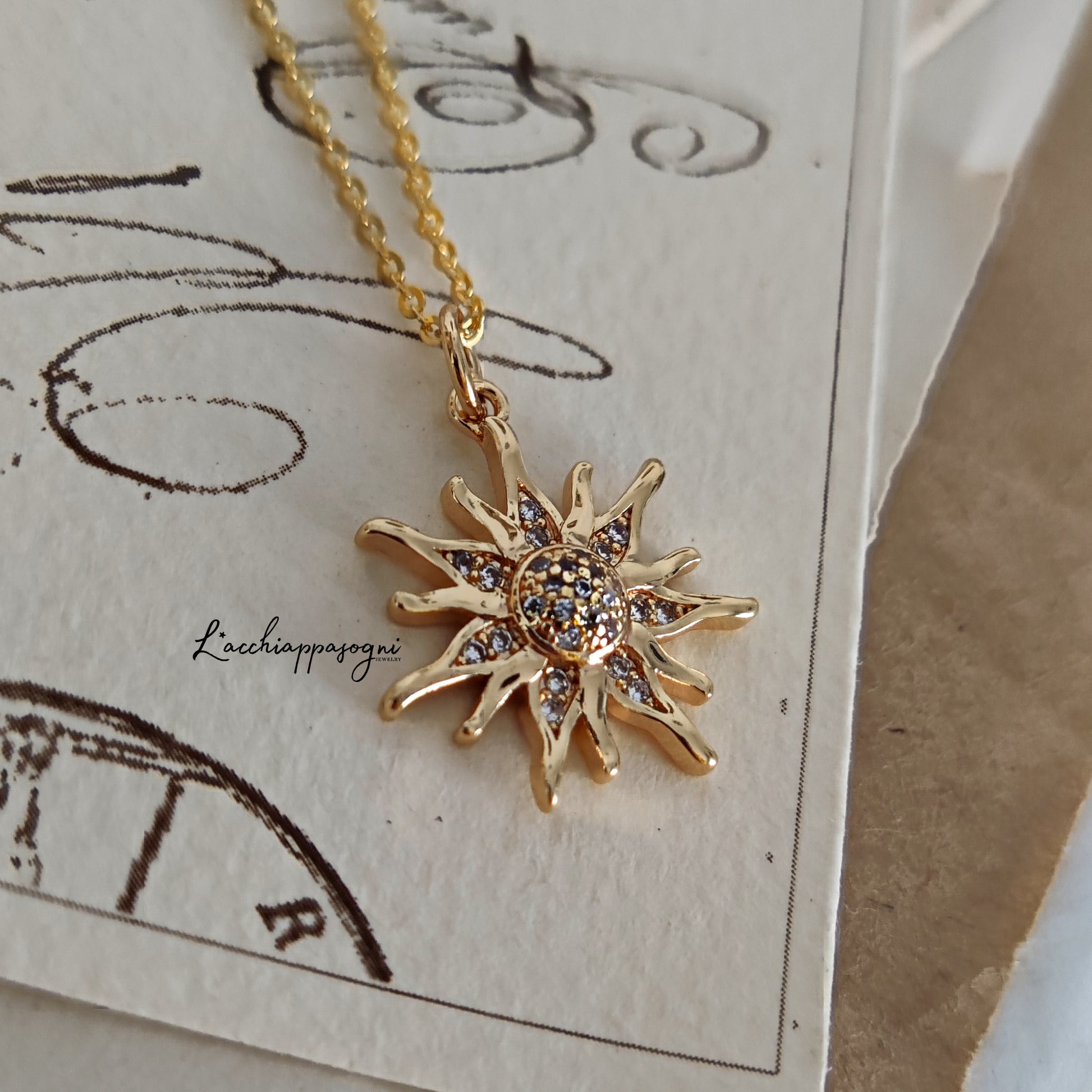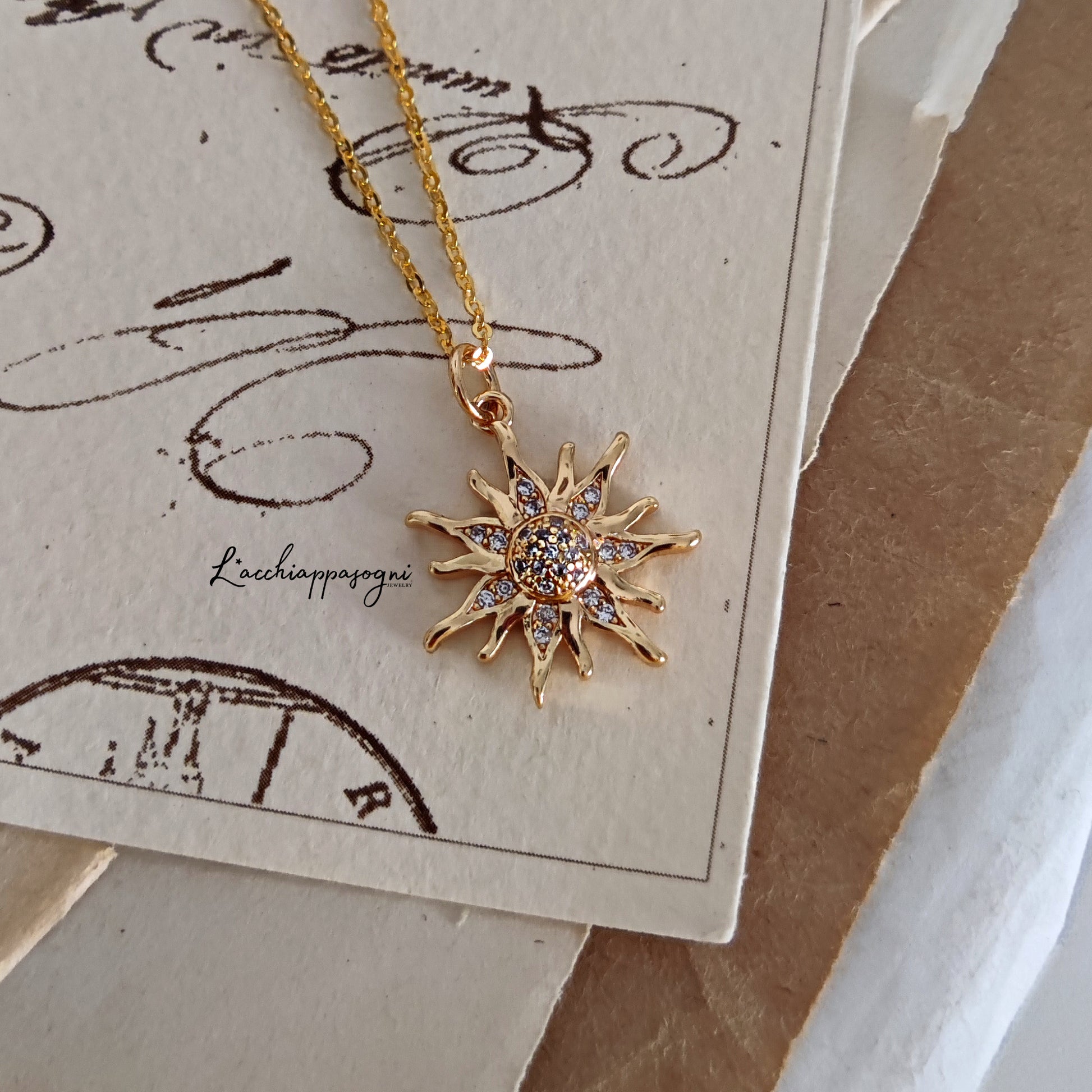 La collana "Suburst" è costituita da un ciondolo a forma di sole in ottone placcato oro 18k tempestato da piccoli cristalli di zirconia cubica con la tecnica pavè.