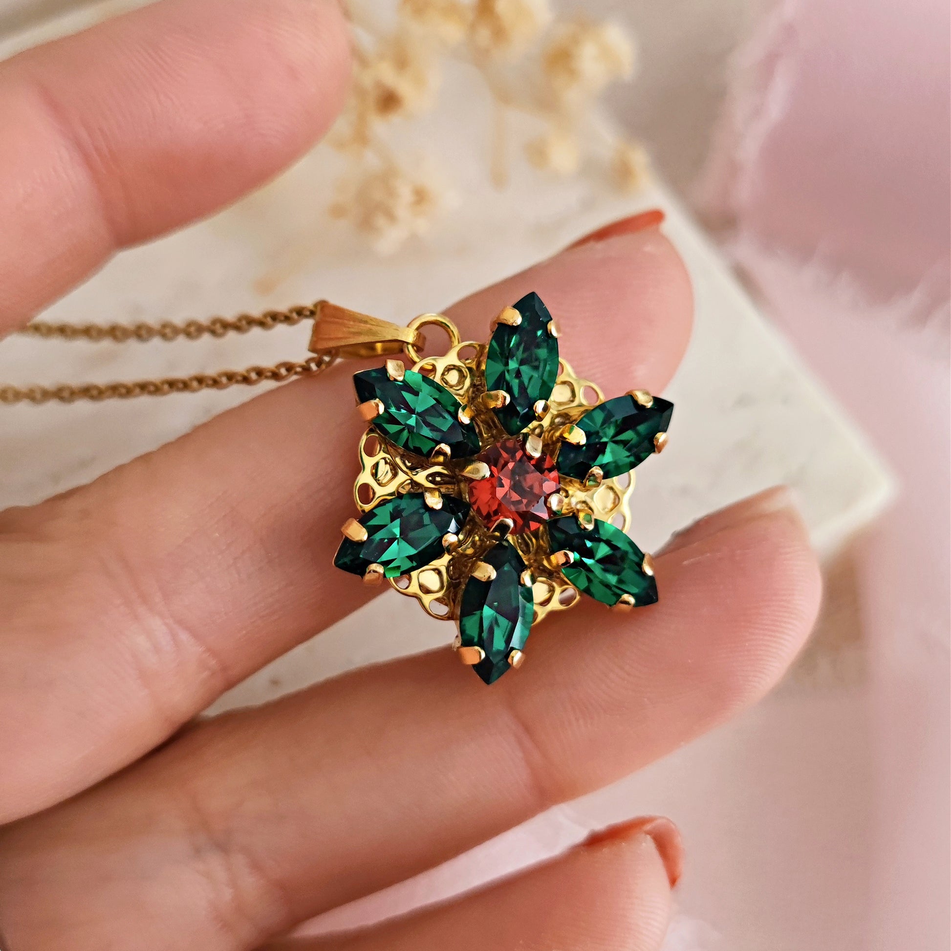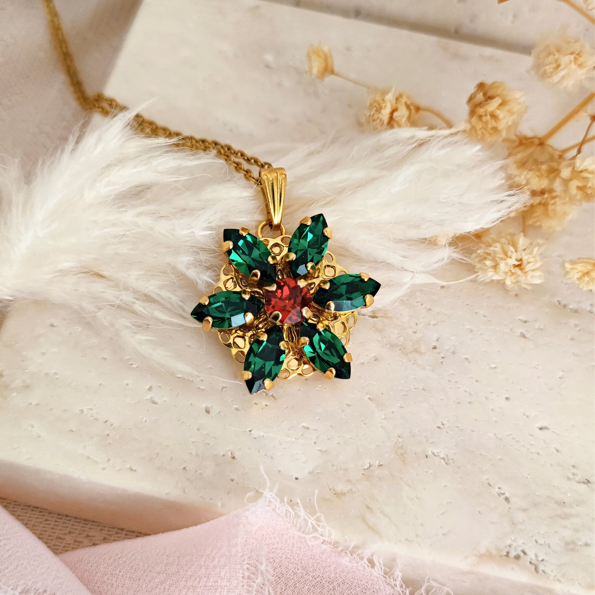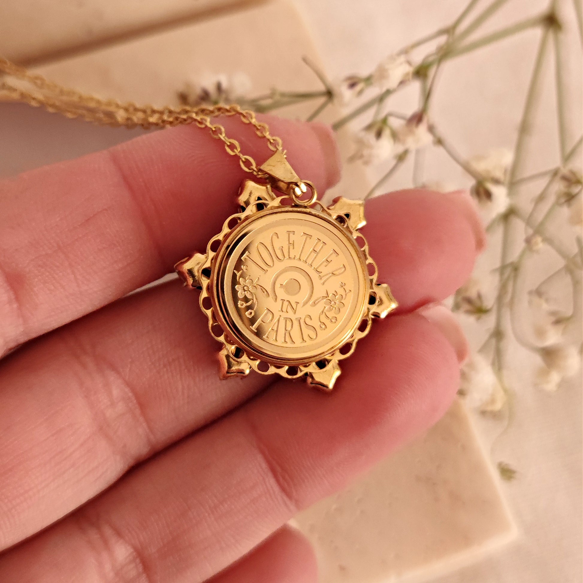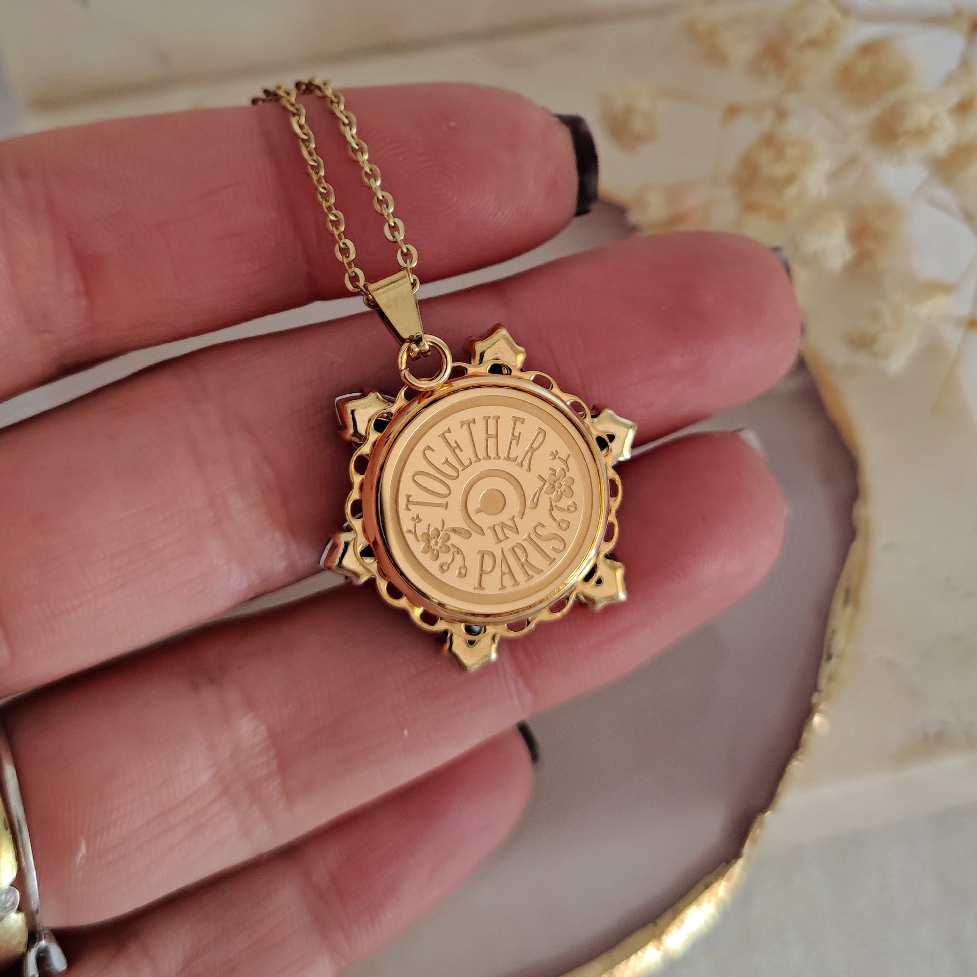 It features 14k gold plated stainless steel round setting, 14k gold plated brass filigree and bail, premium quality PureCrystal® Scarlet rhinestone and gorgeus new color PureCrystal® Majestic Green navettes. The back side is 14k gold plated stainless steel ENGRAVED with "Together in Paris" quote.