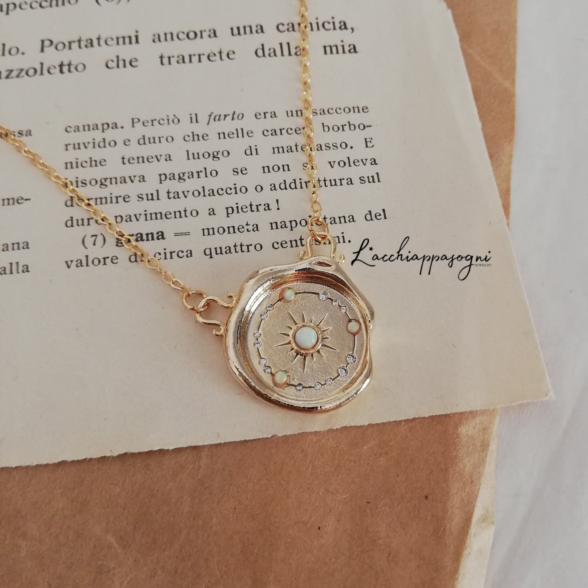 The necklace is made of a 16k gold plated brass was seal styled coin pendant of 20mm. In the middle of the coin there's an Opal stone surrounded by smaller Opal stones and cubic zirconia rhinestones.