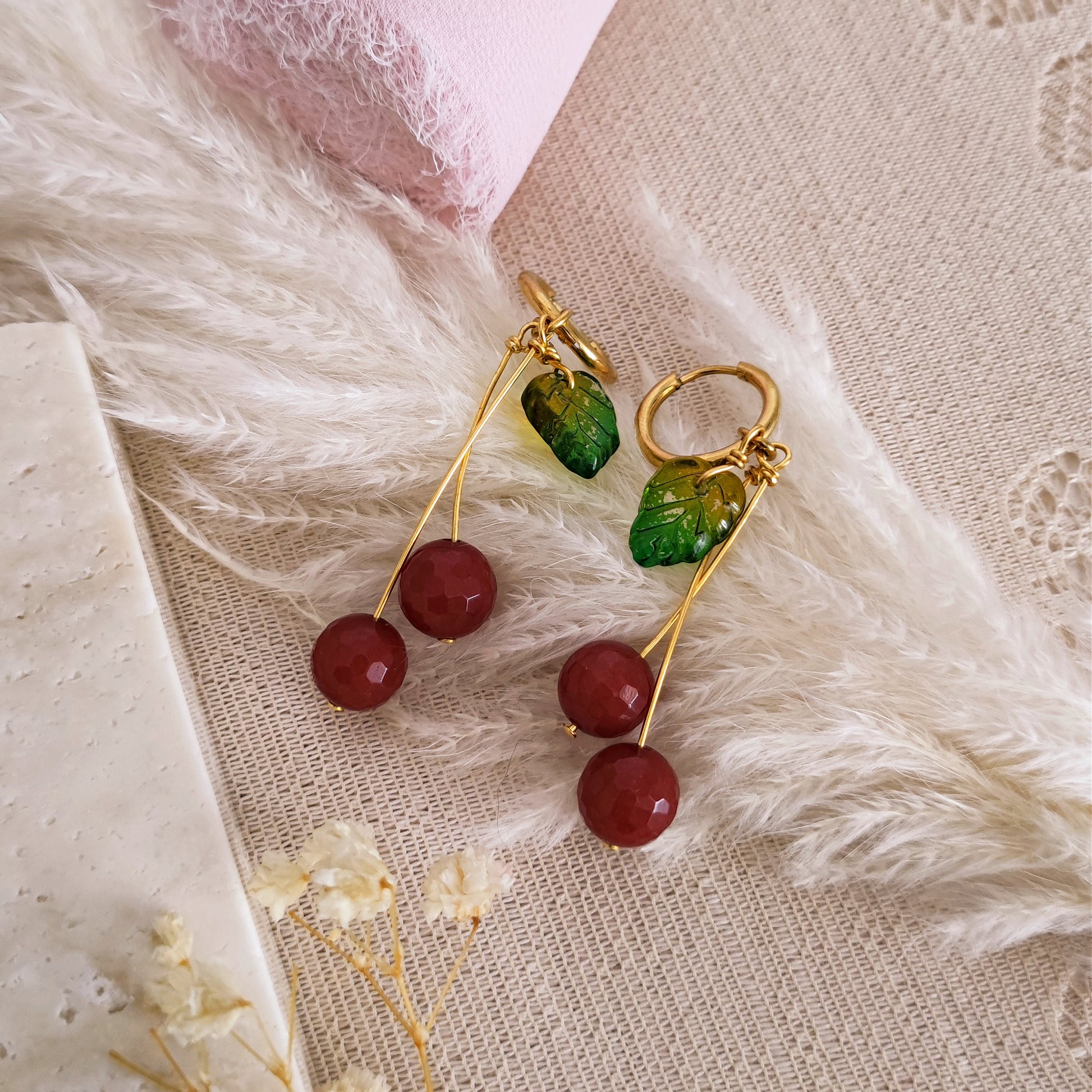 The small hoops are in 14k gold plated stainless steel, the cherries are made from approximately 10mm faceted corundum, and completed by two splendid tourmaline-effect glass leaves.