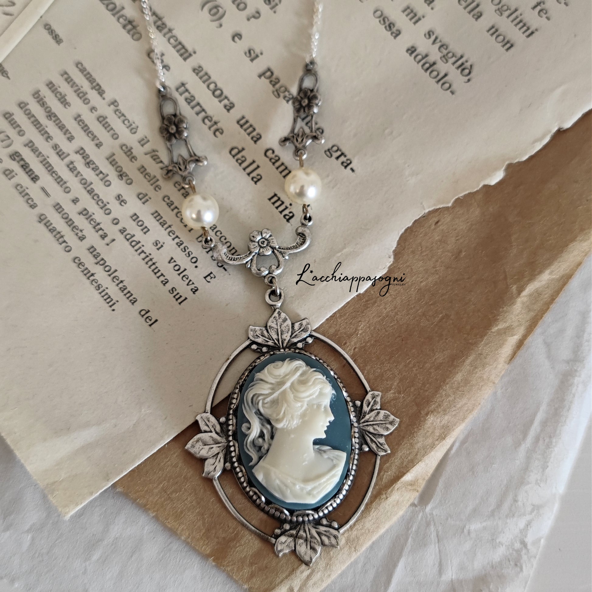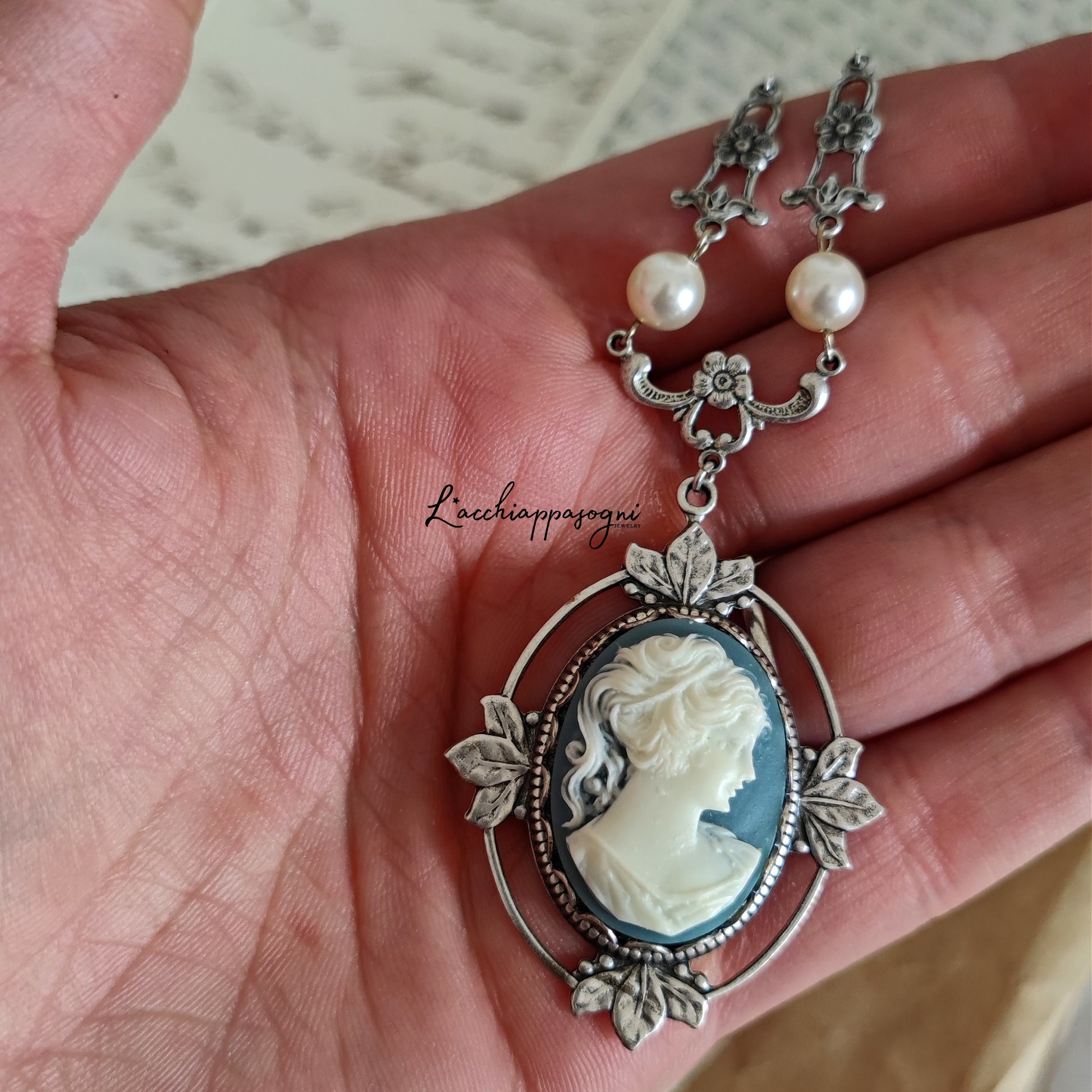 The gorgeous resin light blue cameo is inserted in a crowned antiqued silver plated brass oval setting, connected to a leaf design cameo setting in oxidized silver plated brass and the vintage style is accentuated with art deco and victorian floral oxidized silver plated brass connectors and two Preciosa® pearls.