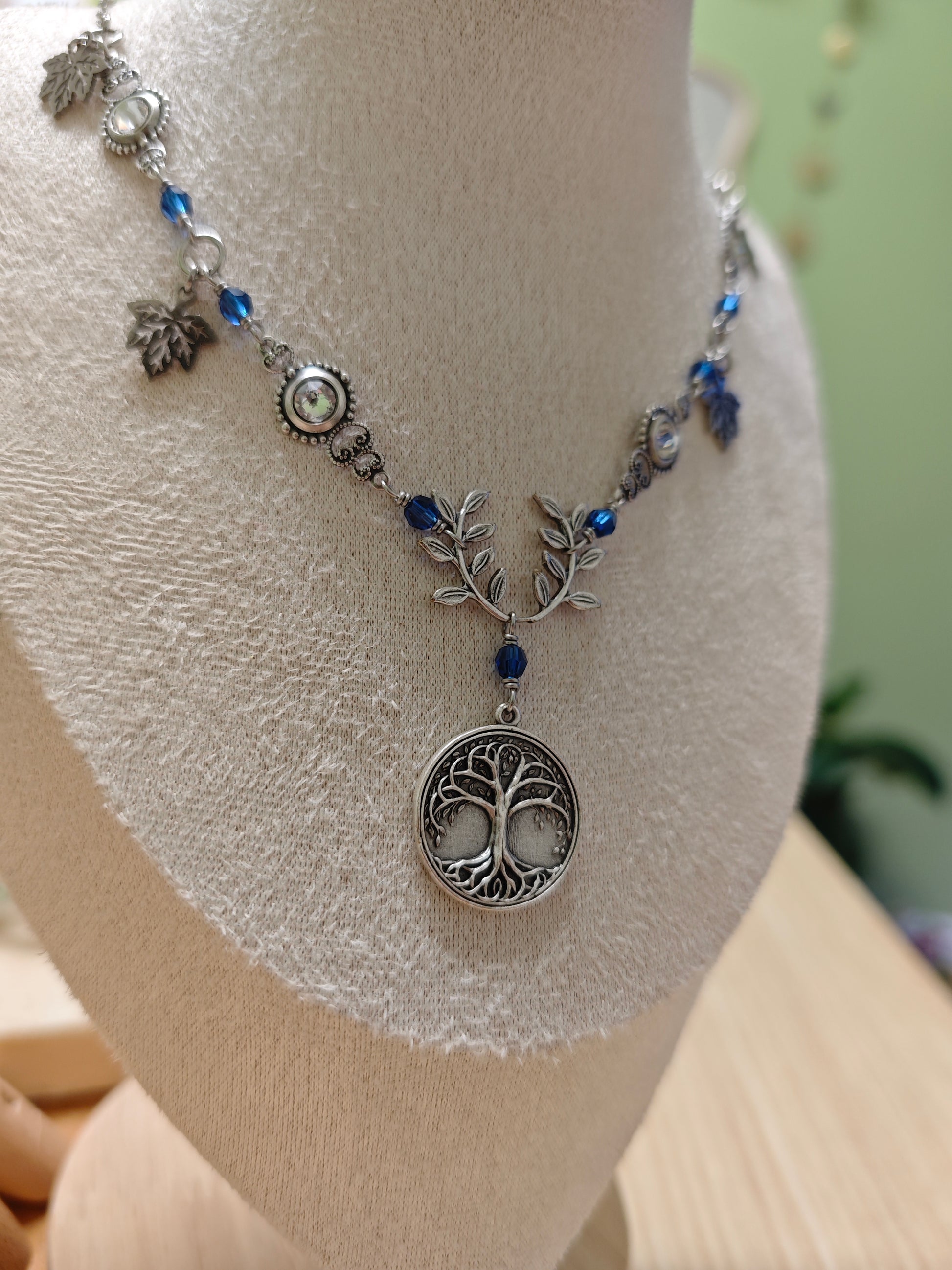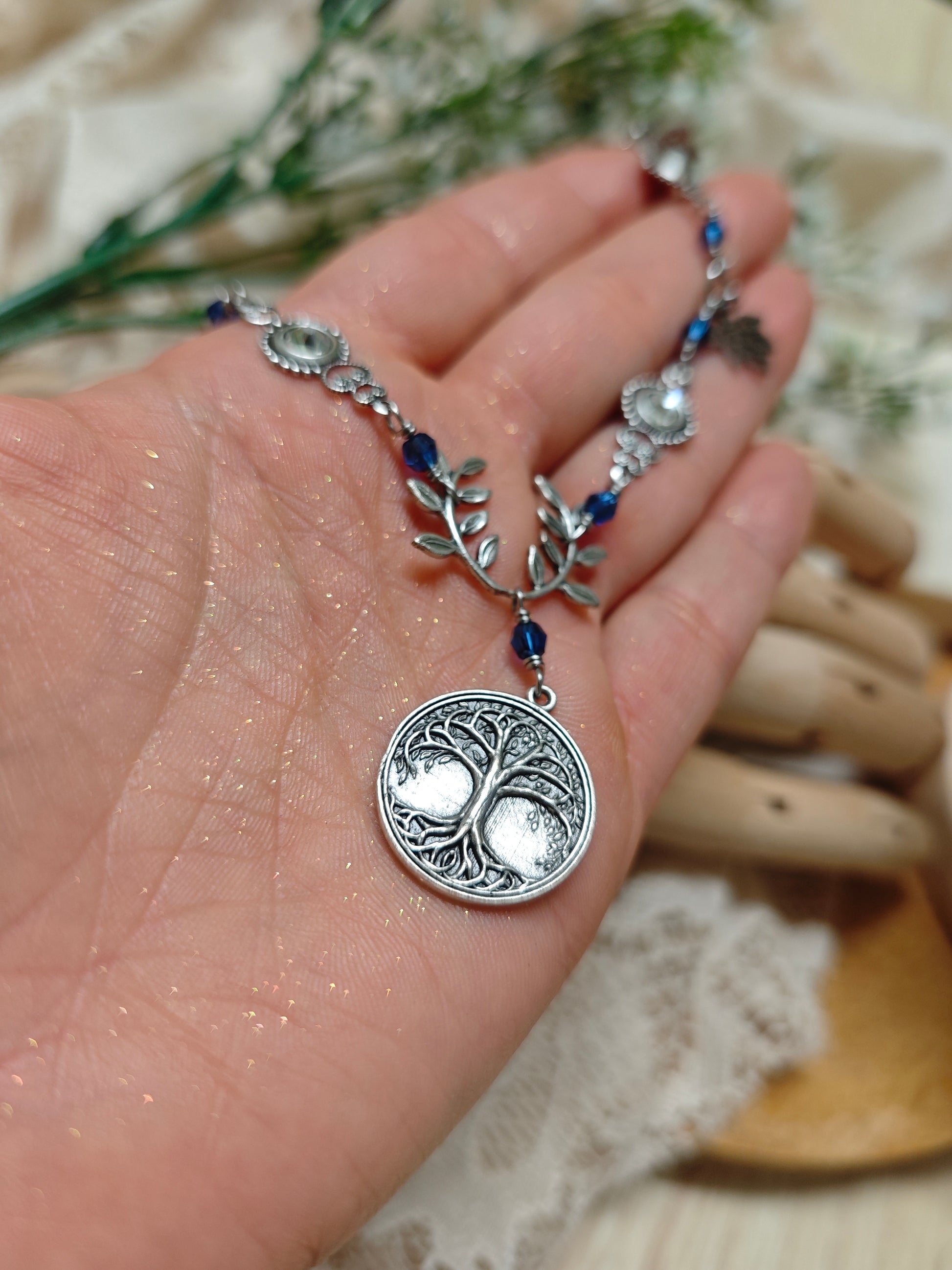 At its center, a finely detailed tree of life hangs from a branching form, surrounded by silver-toned elements and deep sapphire hues. White crystals introduce light and balance, while small leaves extend along the chain, creating a sense of organic movement.