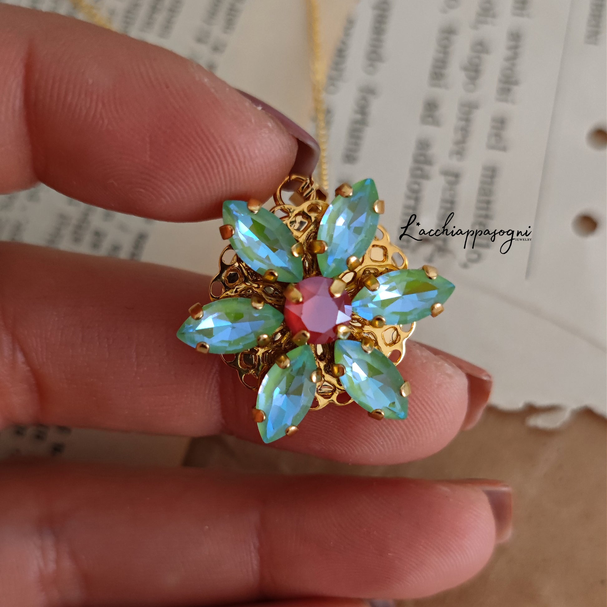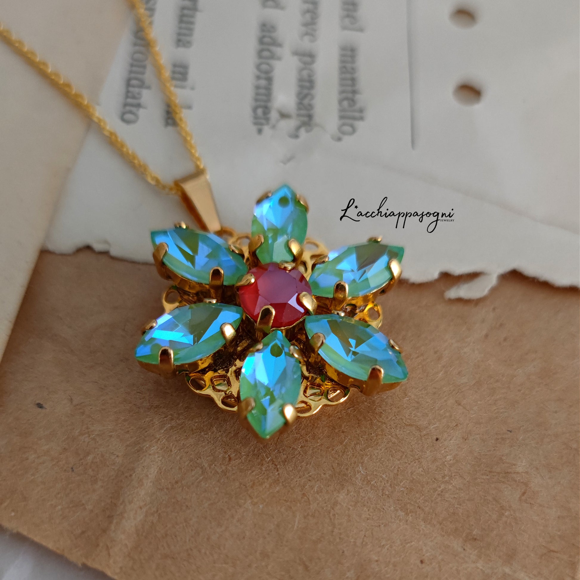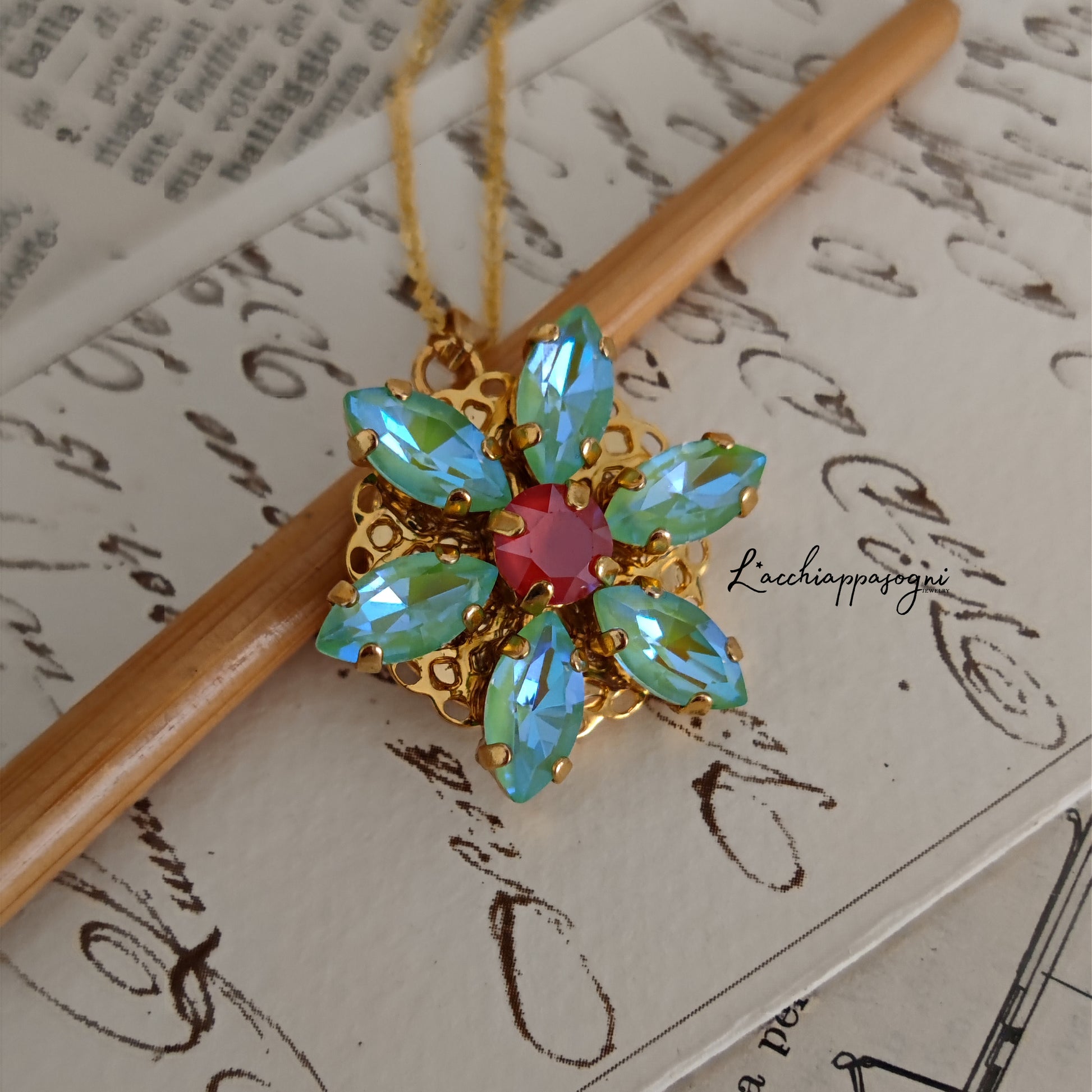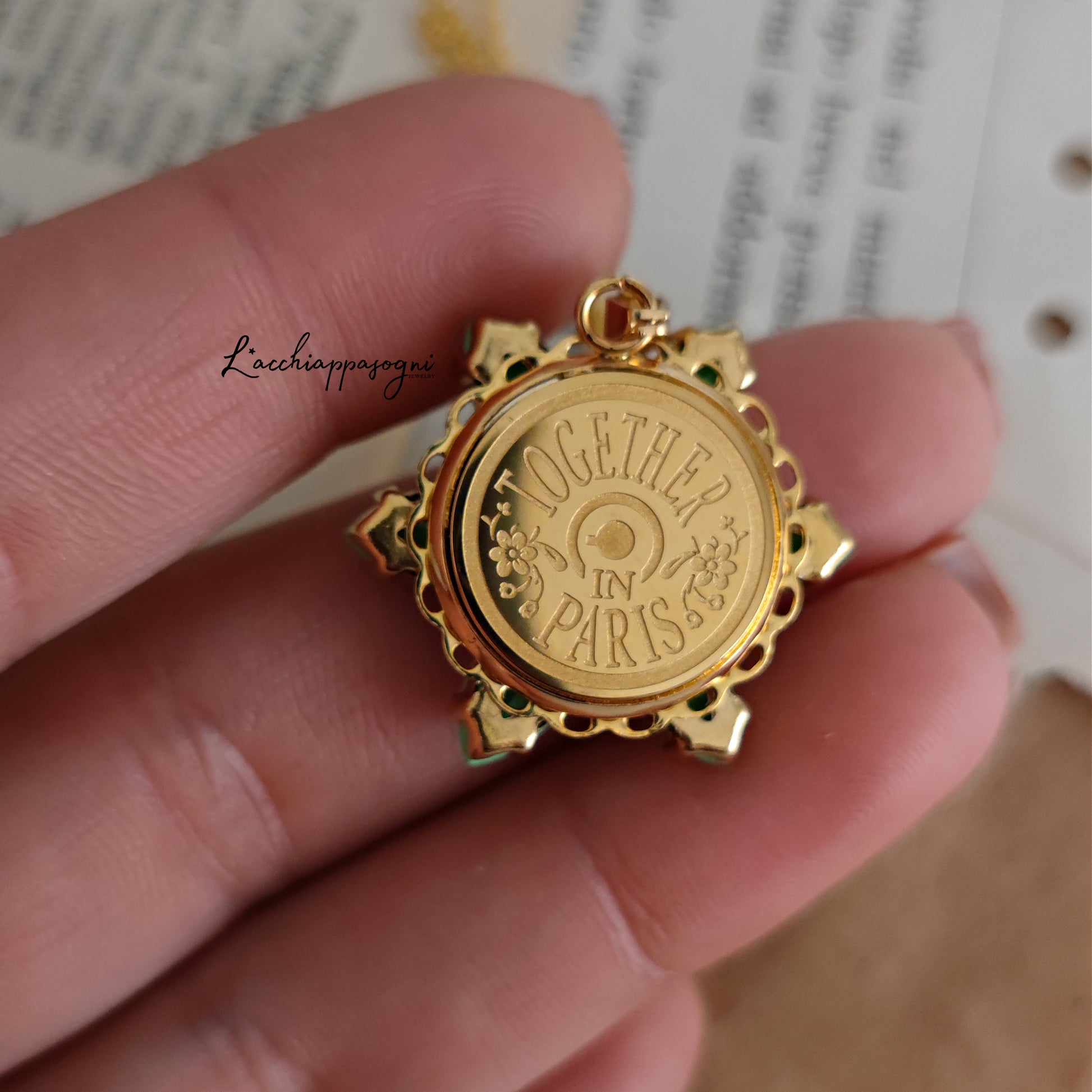 It features 14k gold plated stainless steel round setting, 14k gold plated brass filigree and bail and Aurora® elements: Crystal Mint Green DeLite navettes and a Royal Red rhinestone. The back side is 14k gold plated stainless steel ENGRAVED with "Together in Paris" quote.