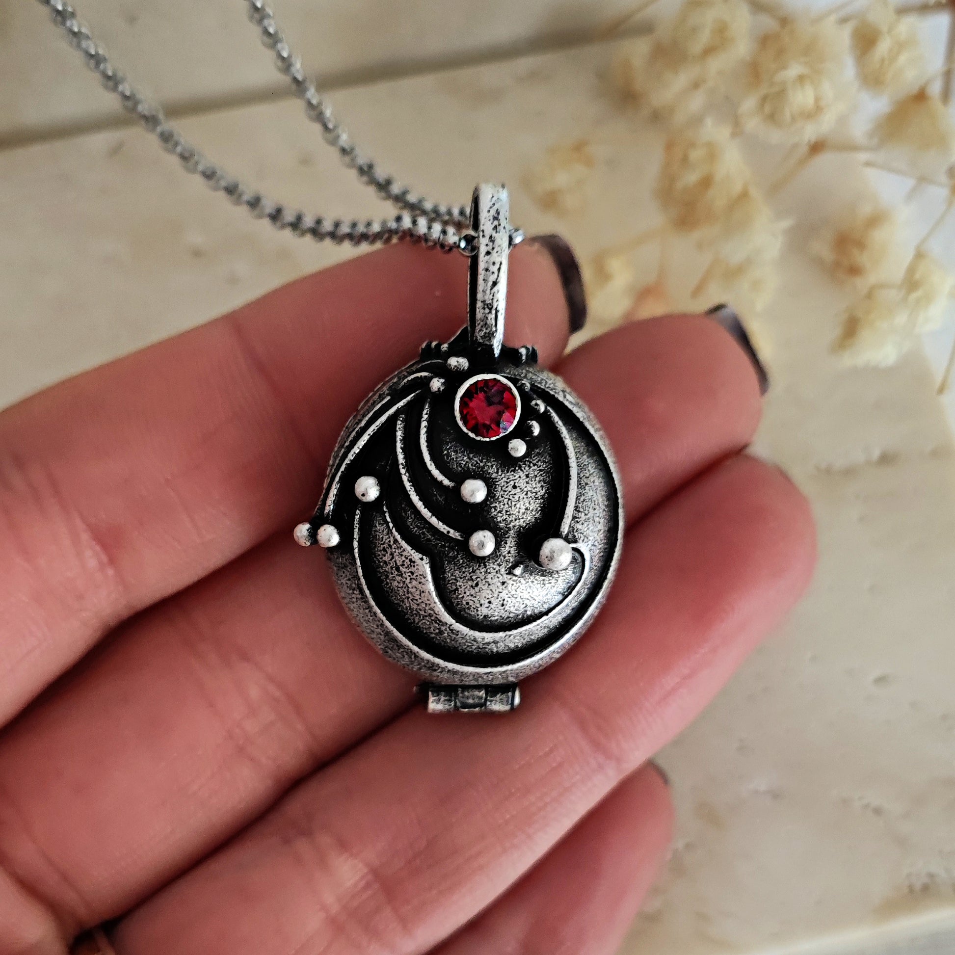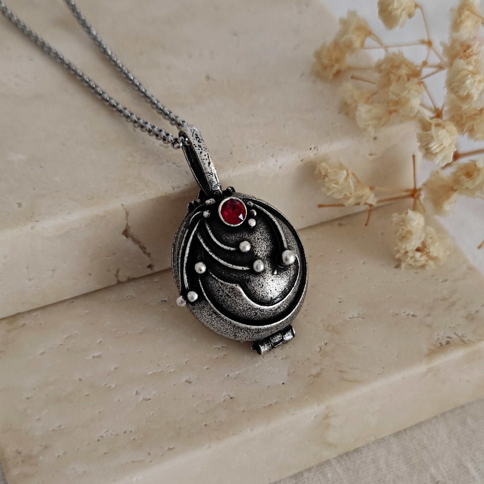 The necklace is made of an antiqued matte silver plated zinc alloy locket.