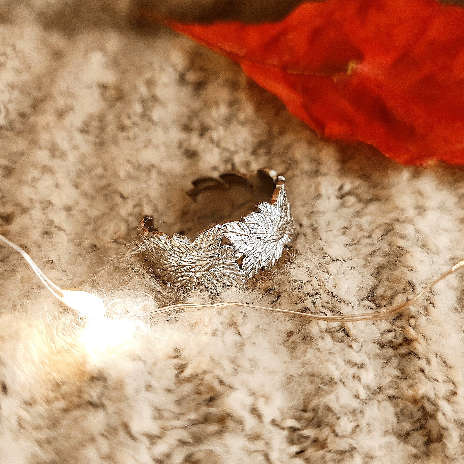 L'autunno è una stagione meravigliosa, piena di calore e colori. L'anello a fascia "Under the Oak Tree" è perfetto per completare il tuo look autunnale, con una banda rigida composta da foglie intrecciate.