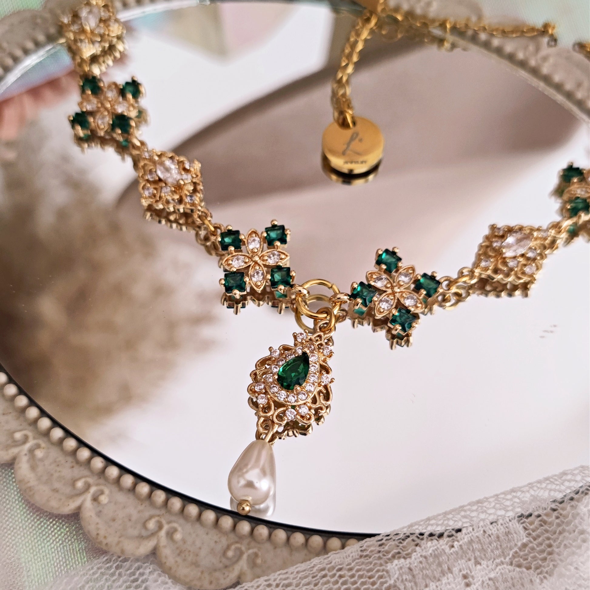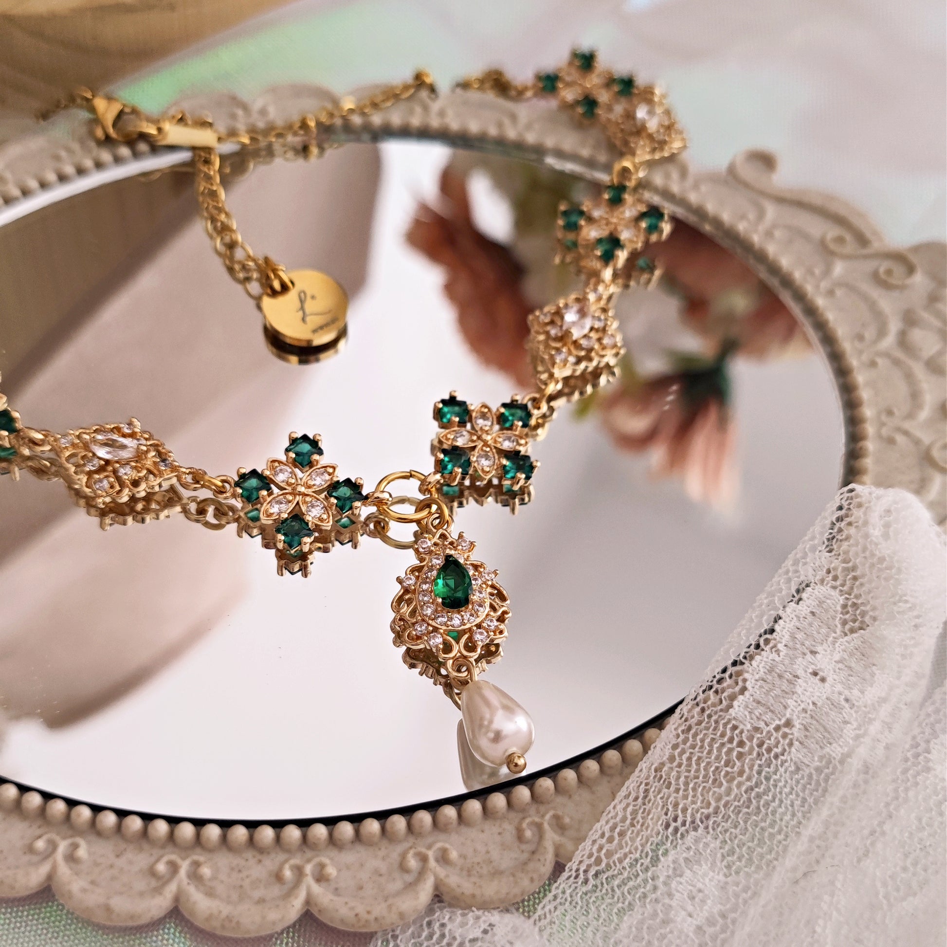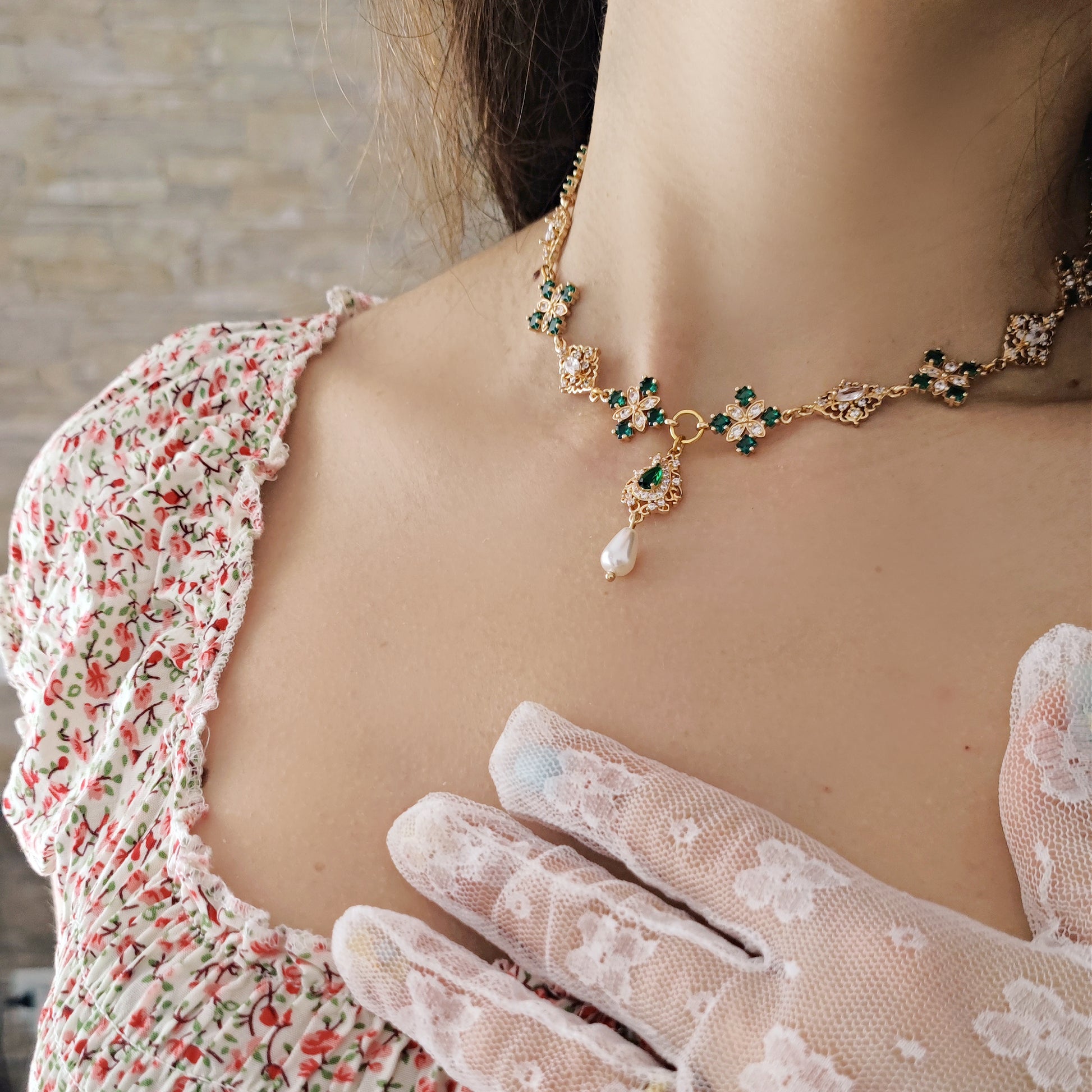 Realizzato con componenti in ottone placcato oro 14k impreziositi da splendidi cristalli cubic zirconia, il verde smeraldo domina la scena e si alterna a cristalli luminosi dalle forme ricercate. Il pendente principale è composto da un connettore a goccia in verde smeraldo e da una perla Maiorca a goccia.