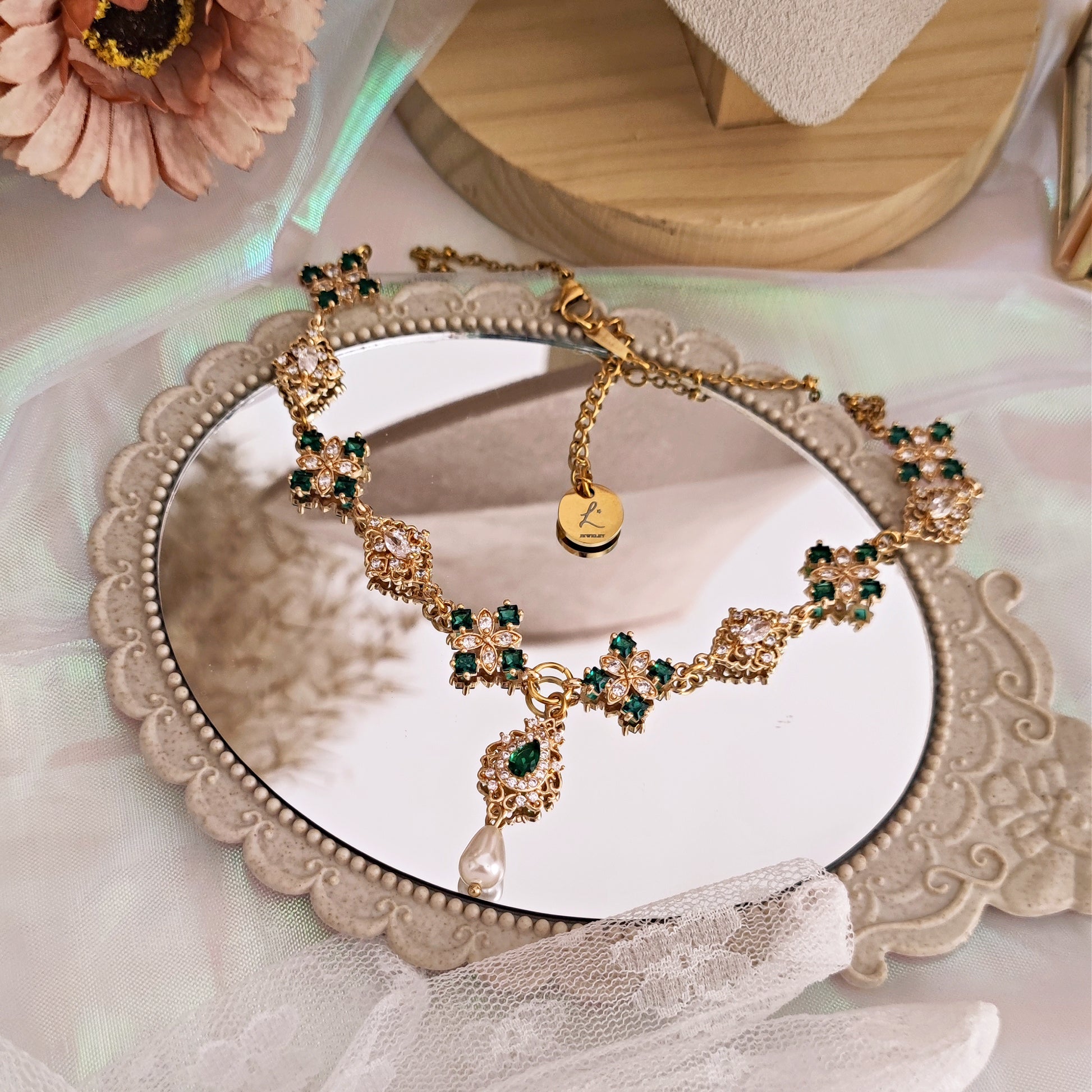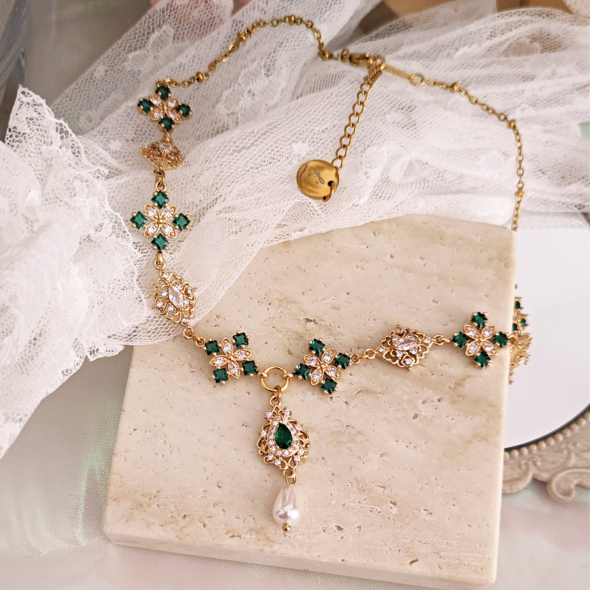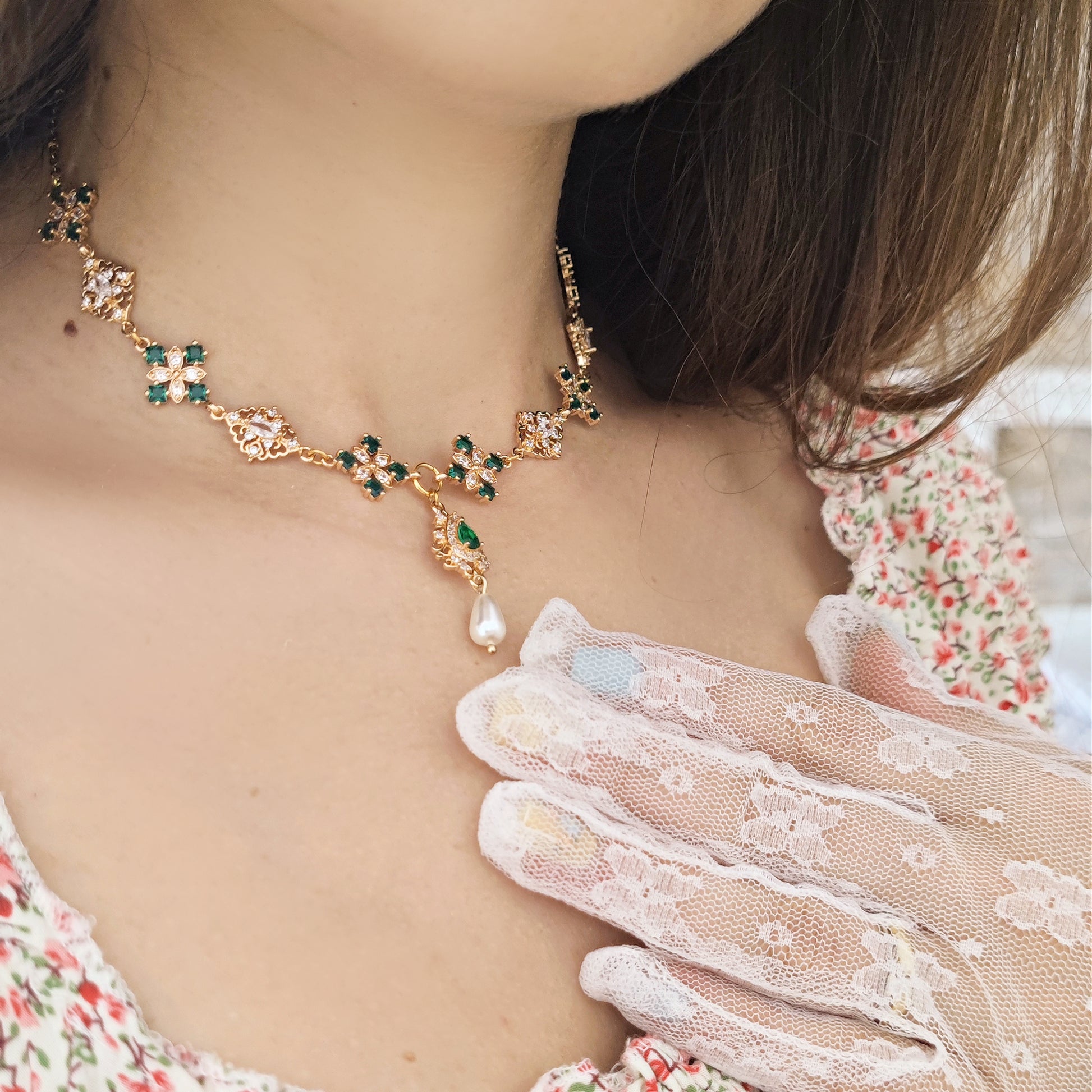 Realizzato con componenti in ottone placcato oro 14k impreziositi da splendidi cristalli cubic zirconia, il verde smeraldo domina la scena e si alterna a cristalli luminosi dalle forme ricercate. Il pendente principale è composto da un connettore a goccia in verde smeraldo e da una perla Maiorca a goccia.