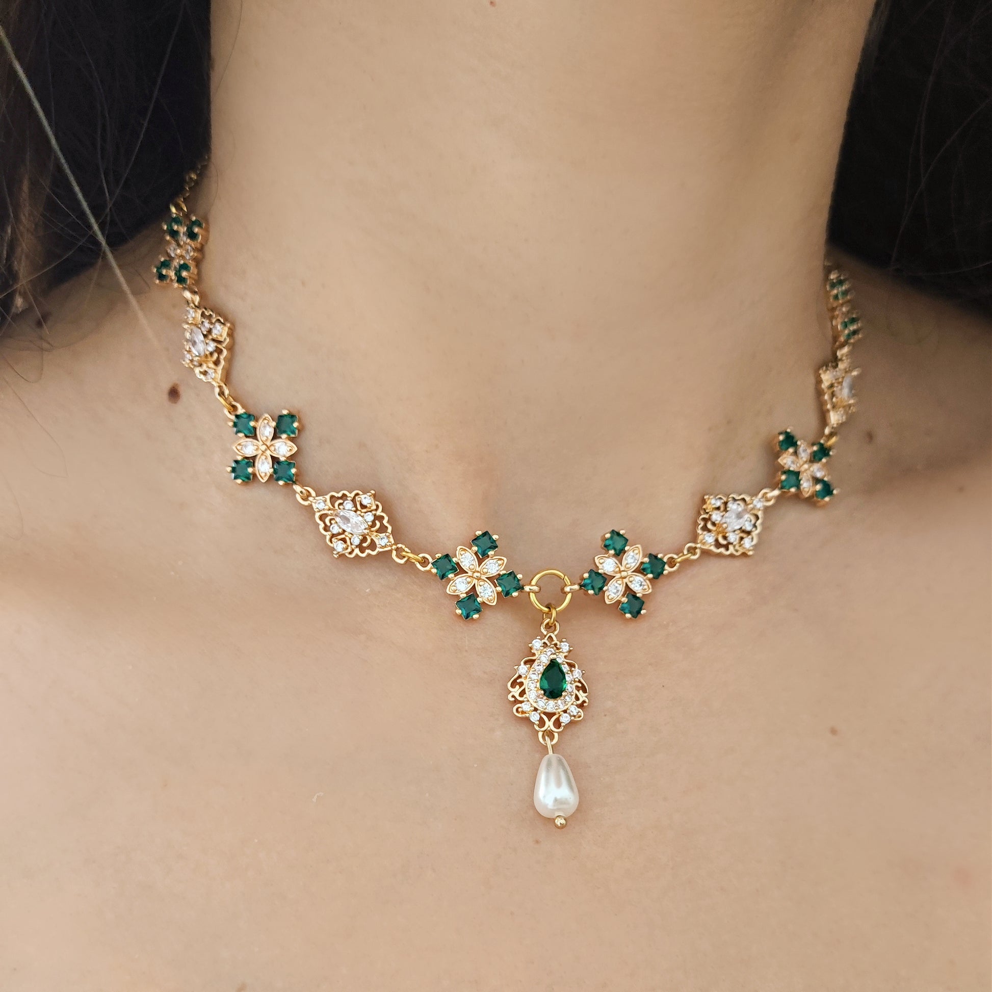 Collana girocollo "Penelope" con cristalli verde smeraldo