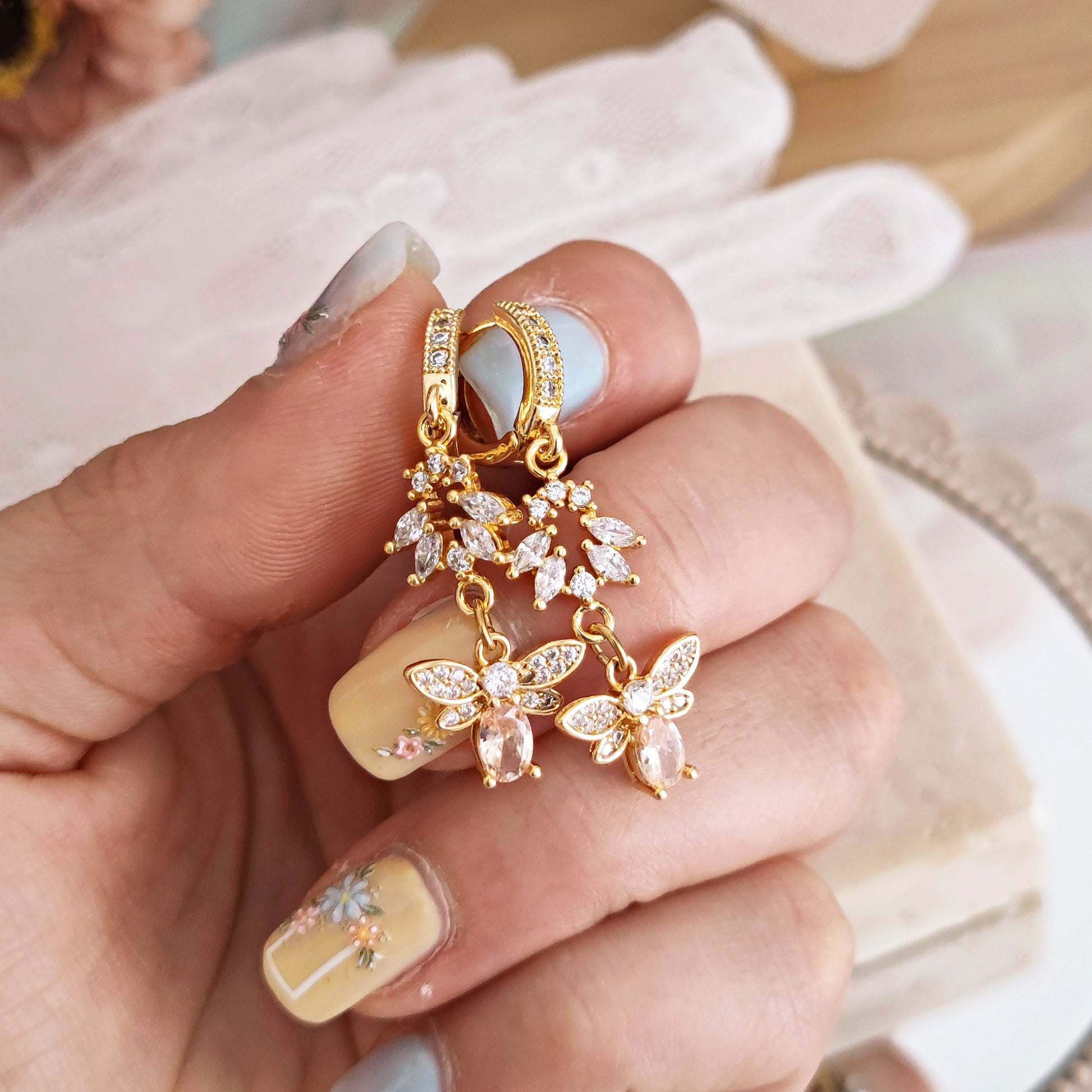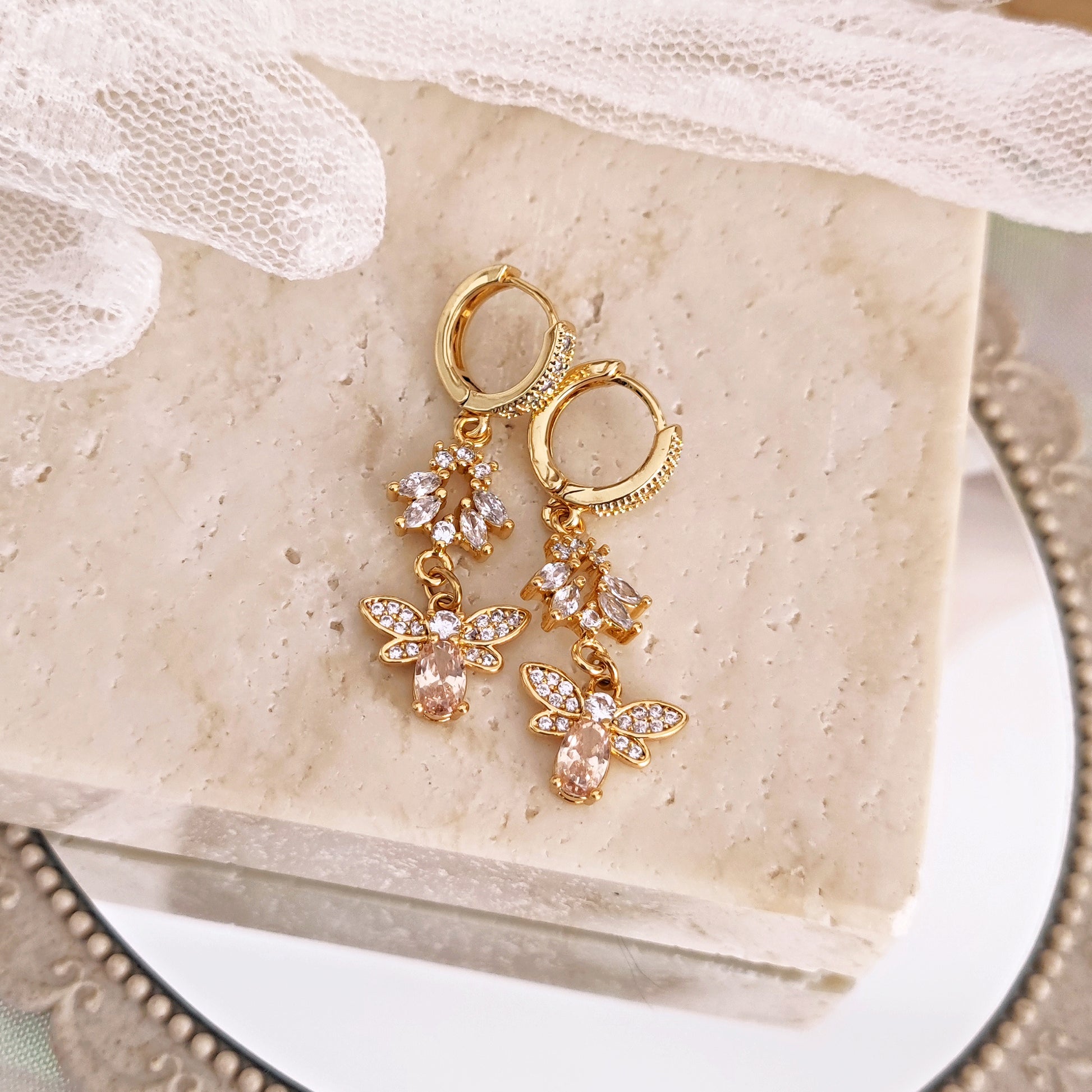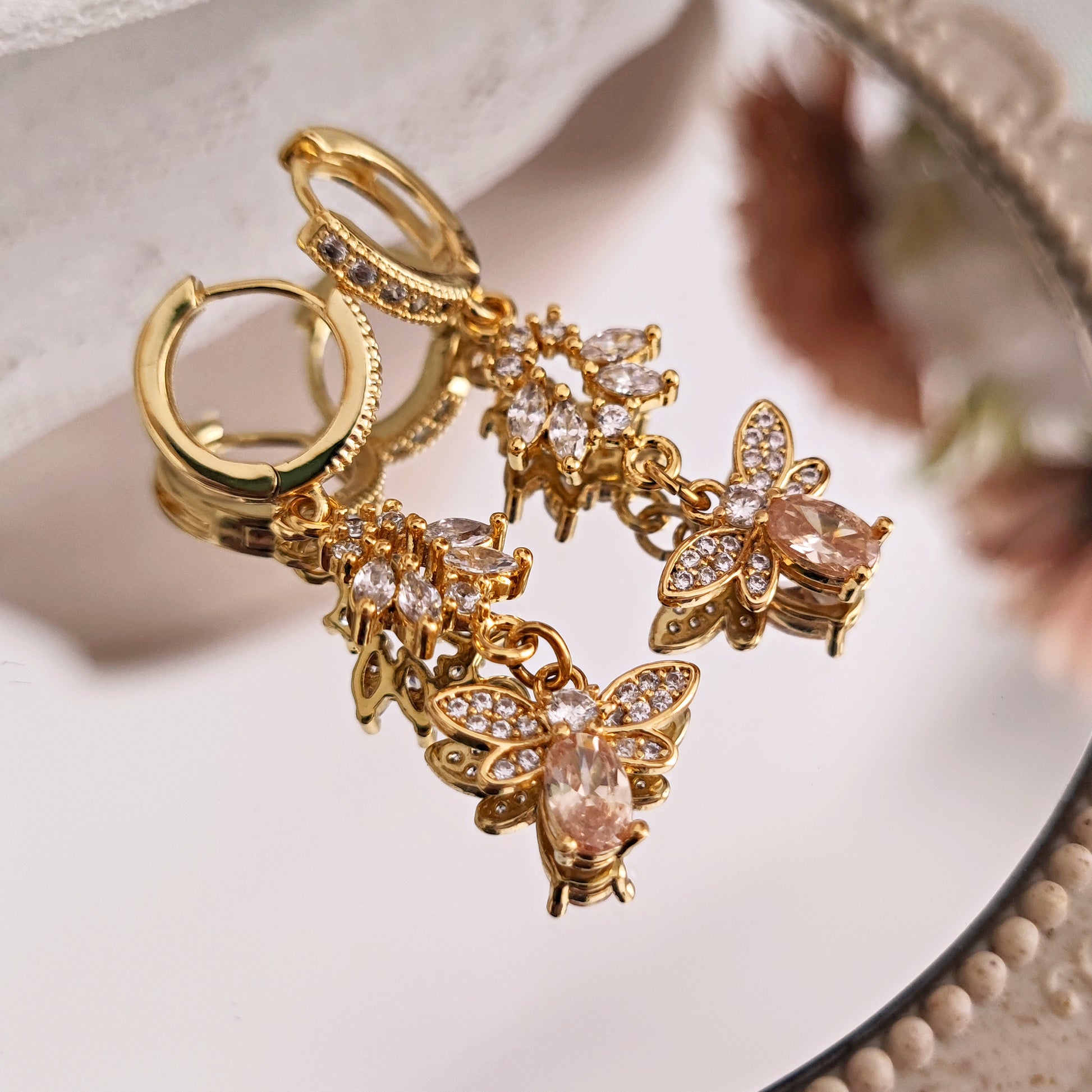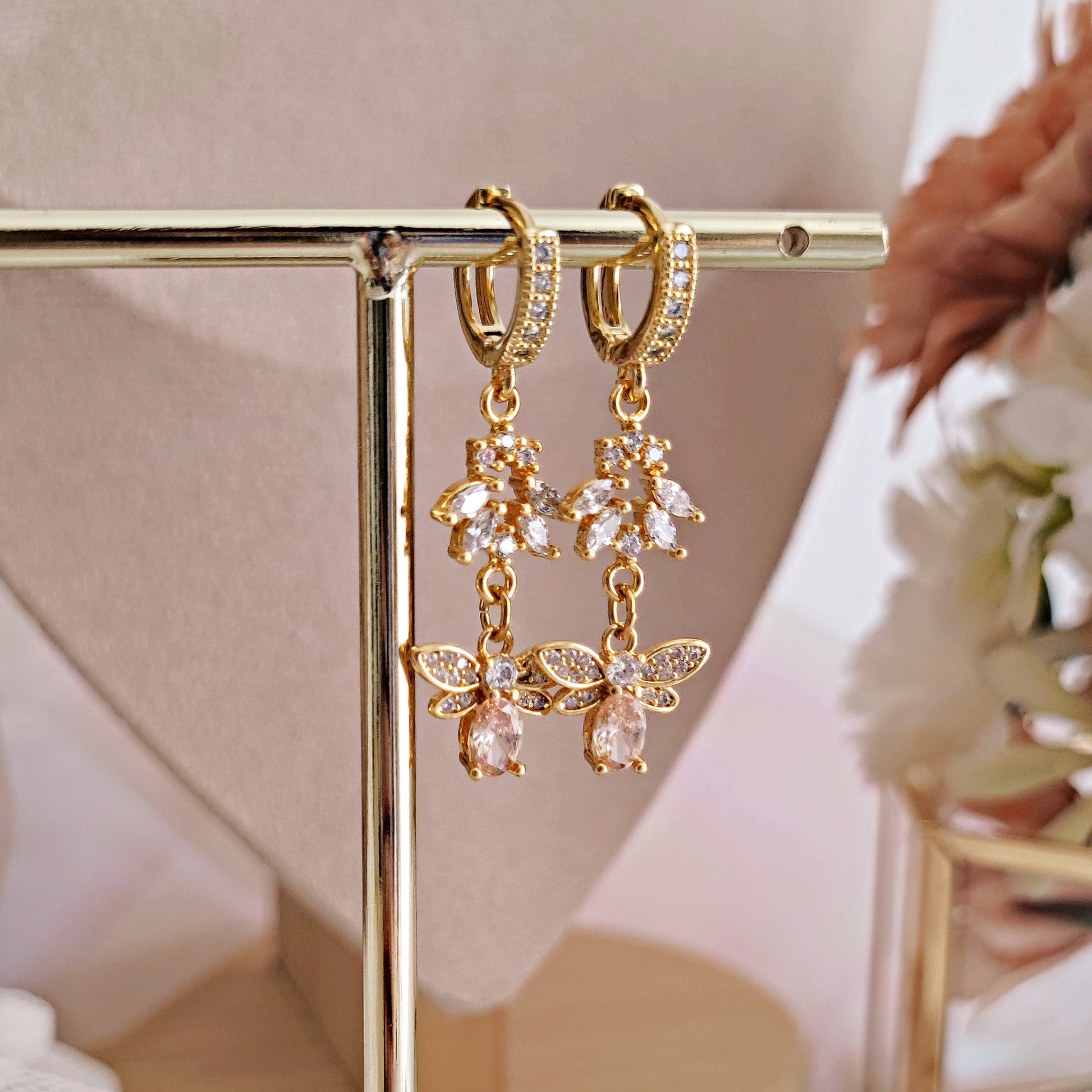 Realizzati con componenti in ottone placcato oro 14k, sono composti da cerchietti tempestati da cristalli cubic zirconia da cui pendono due connettori in cristallo cubic zironia e due piccole api con cristalli champagne.