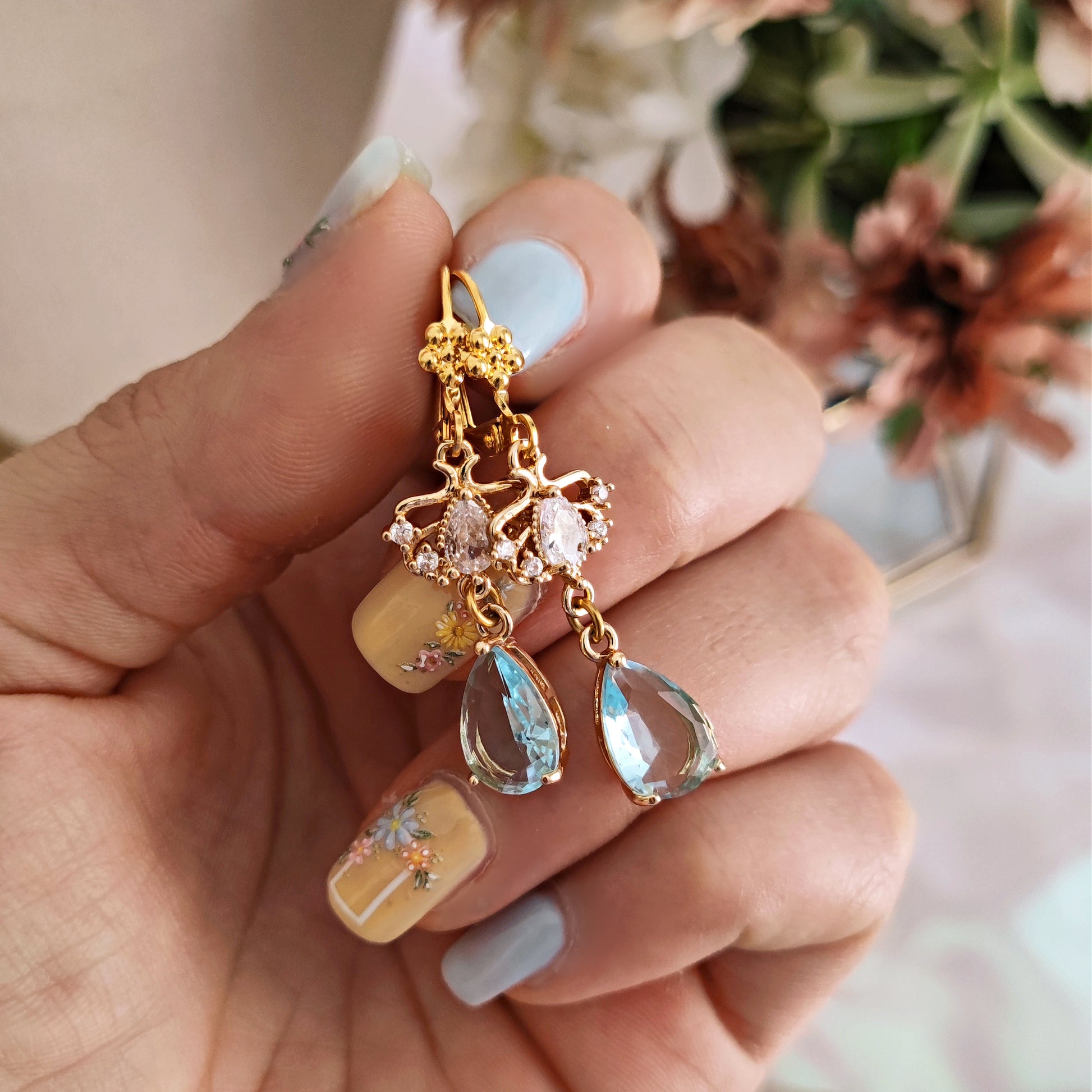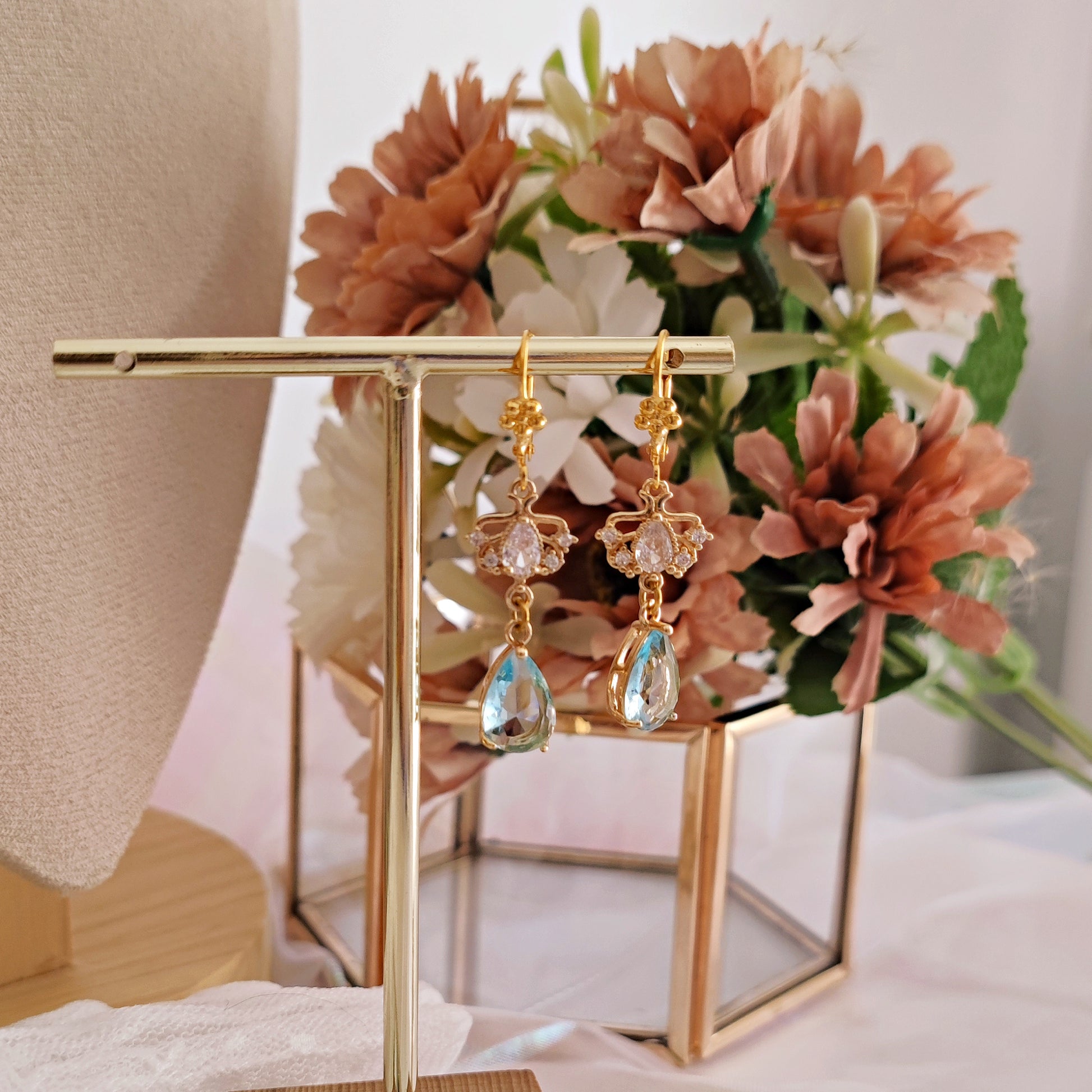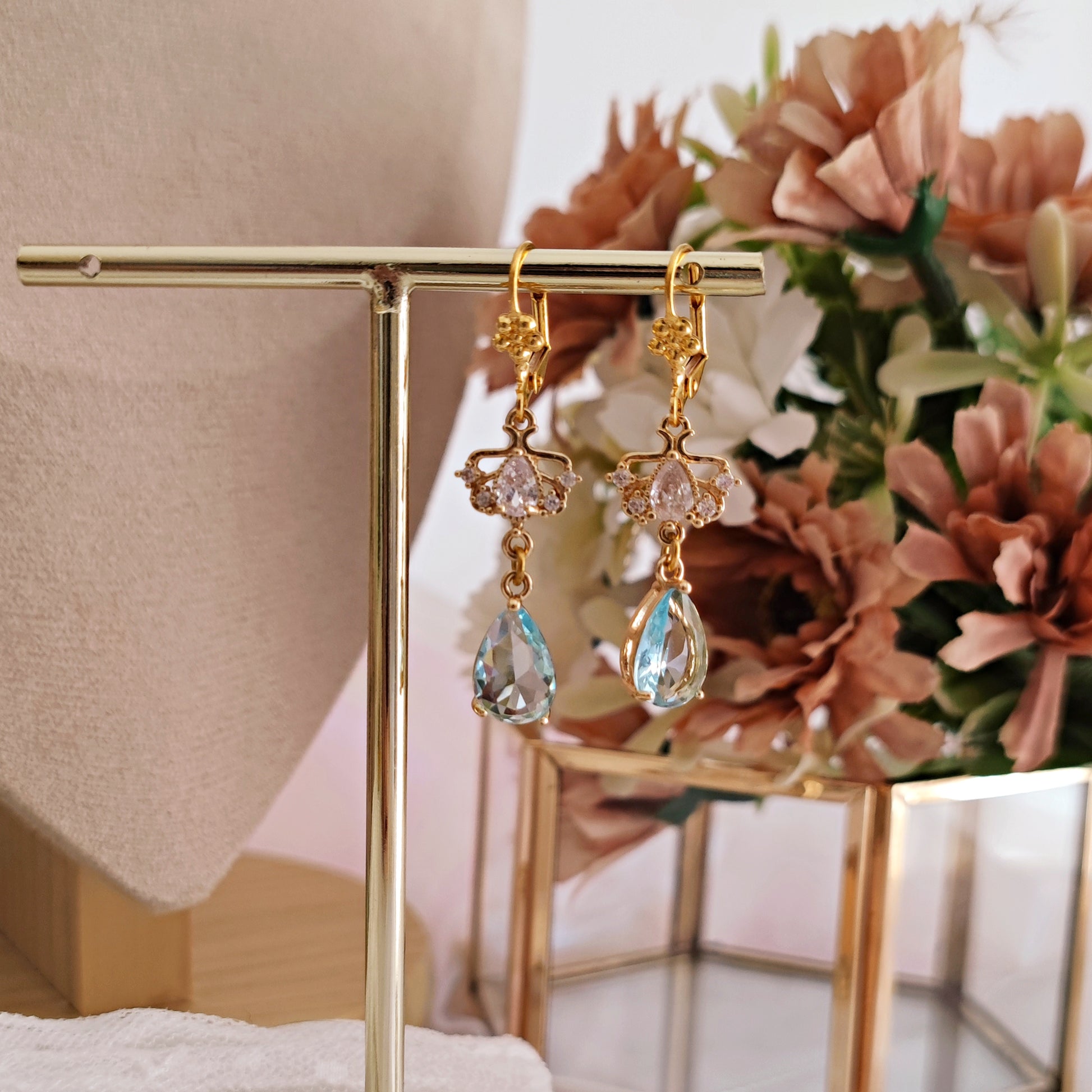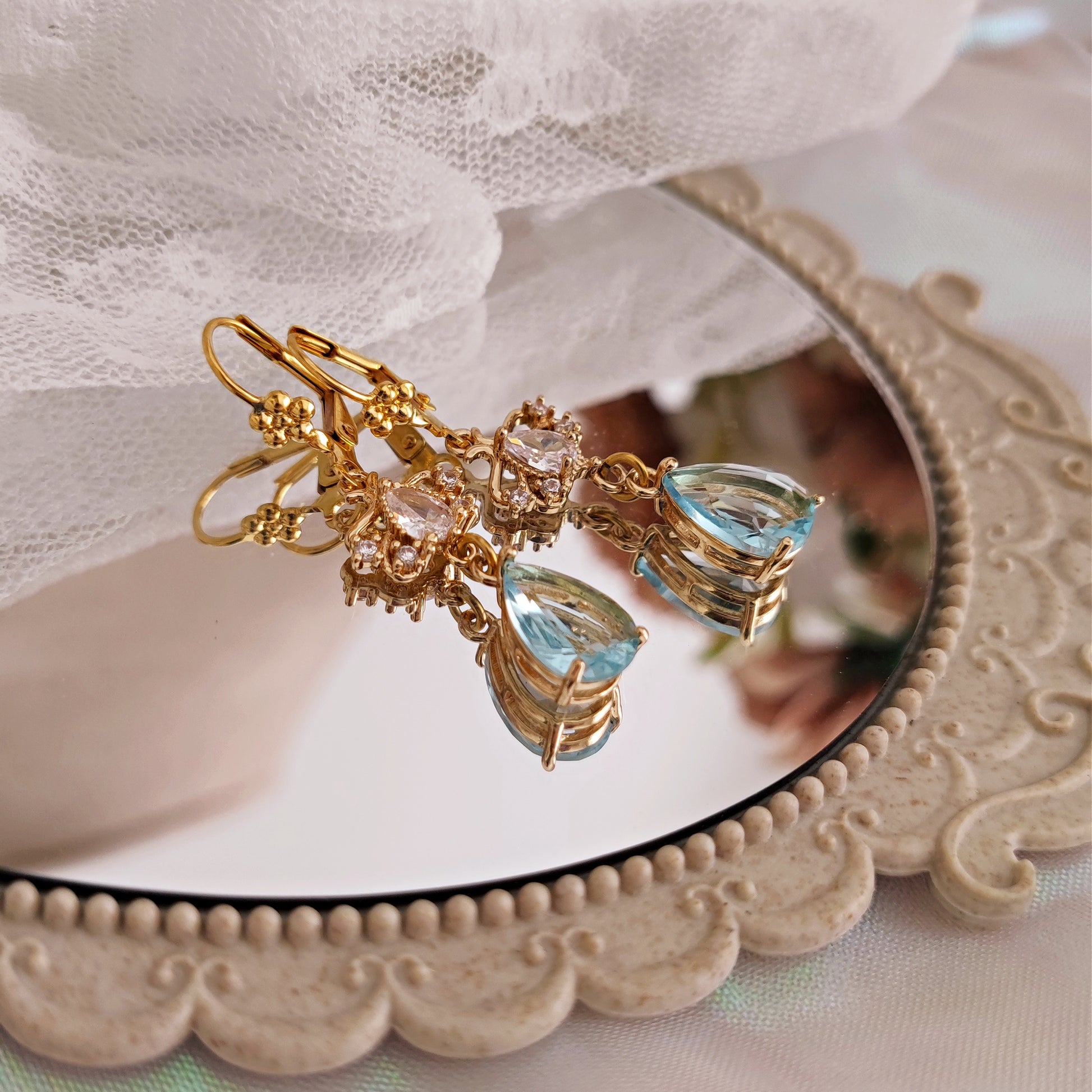 Realizzati con componenti in ottone placcato oro 14k, a partire dai gancini lever back. I cristalli cubic zironia brillano luminosi, le gocce azzurre color acquamarina aggiungono eleganza senza tempo e raffinatezza, degne del Diamante della Stagione.