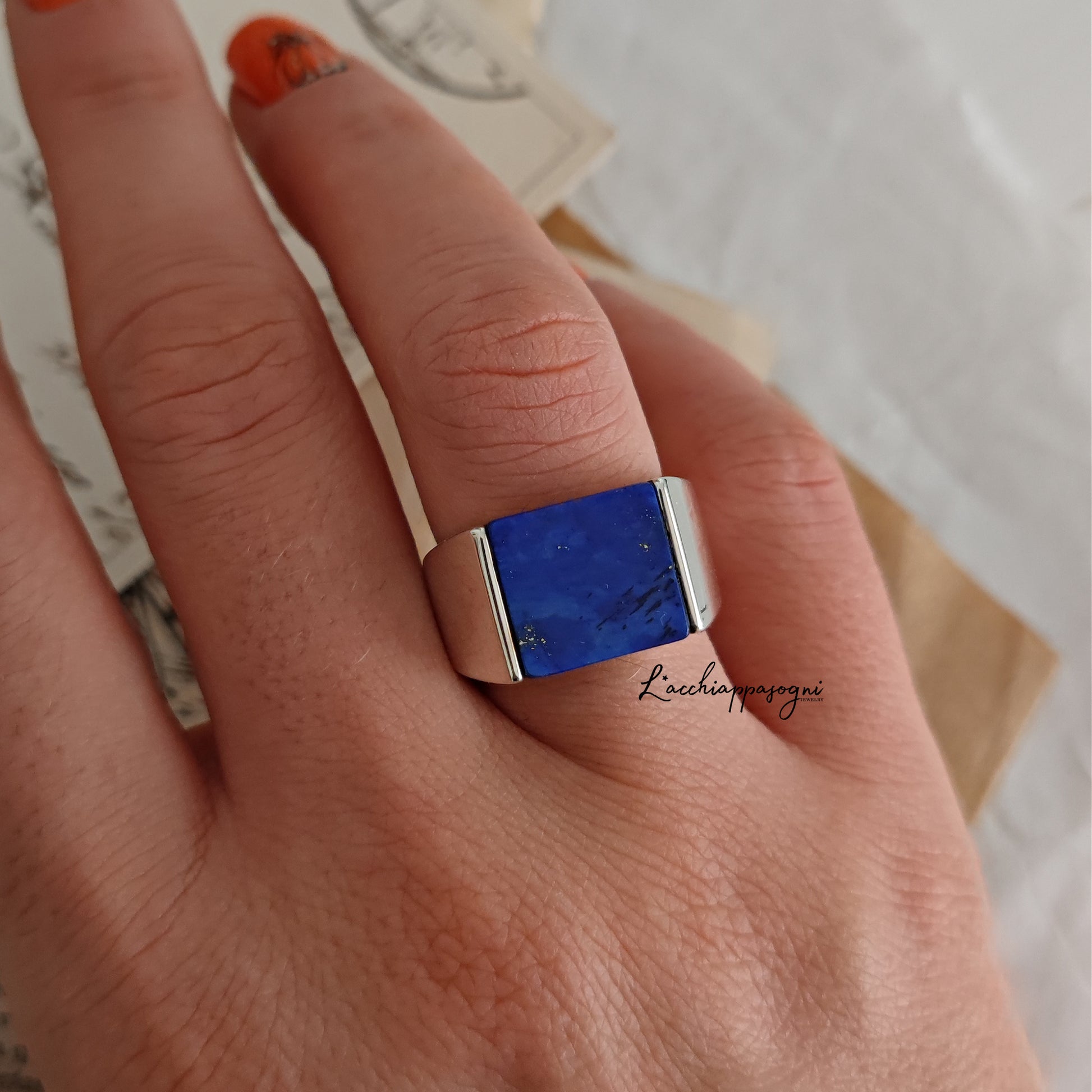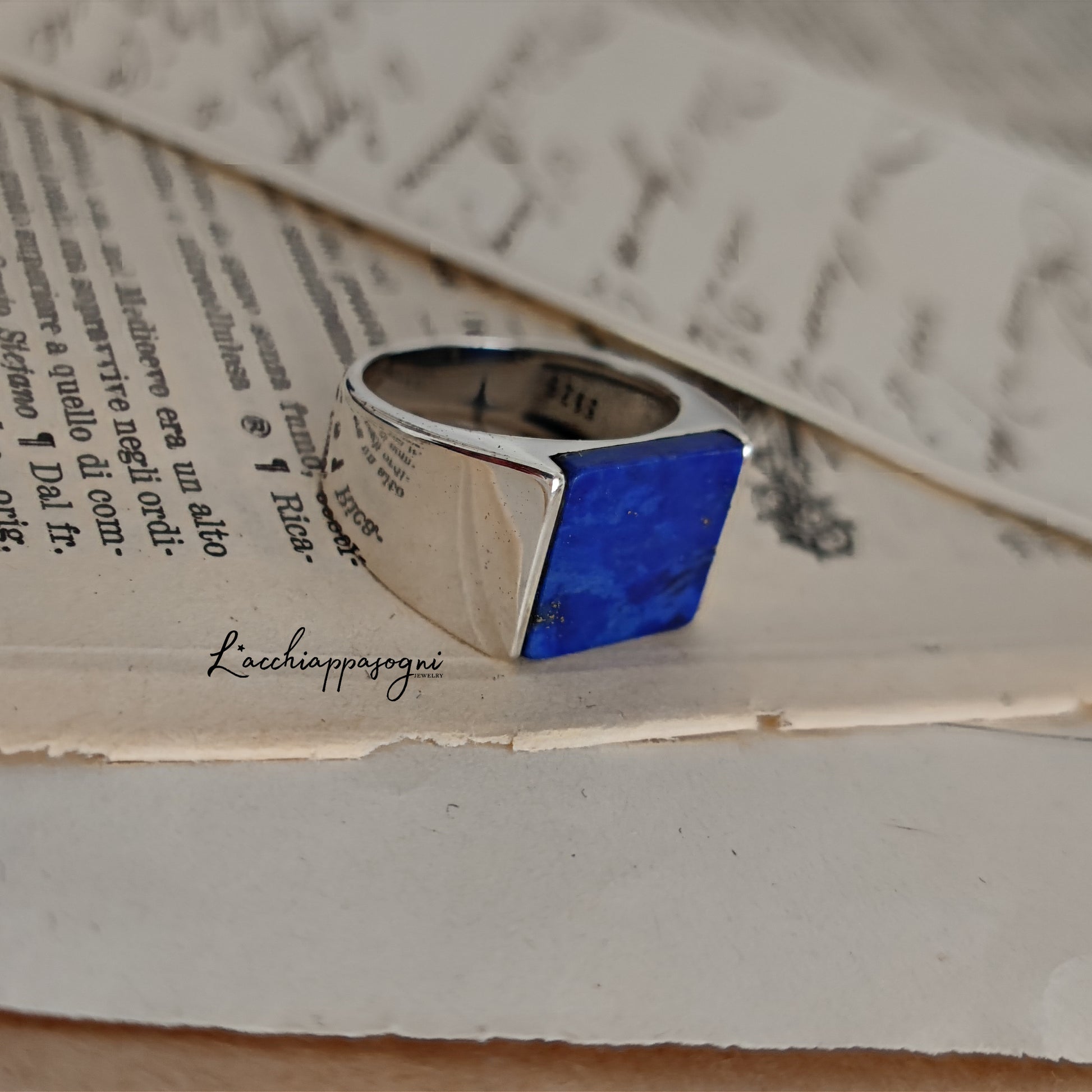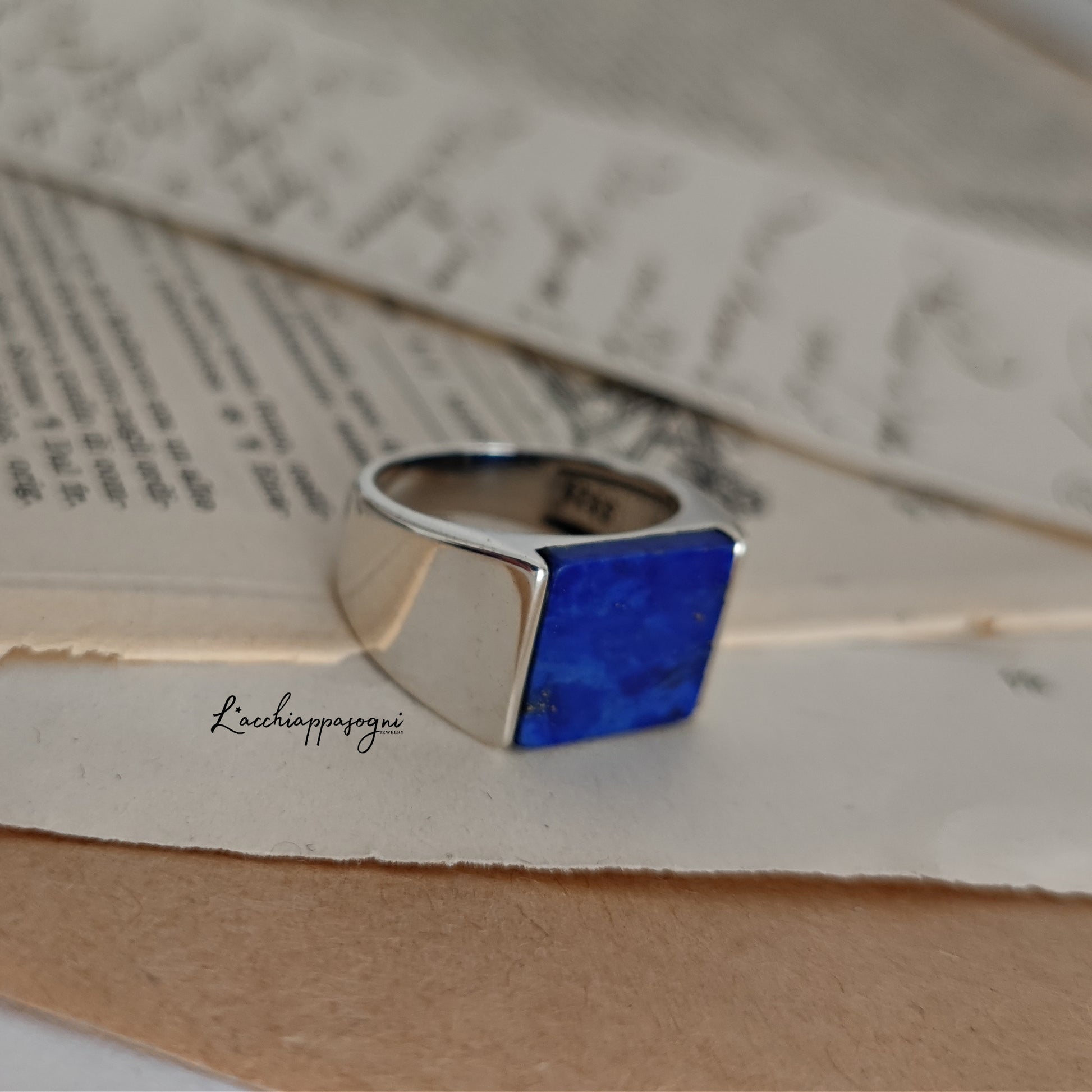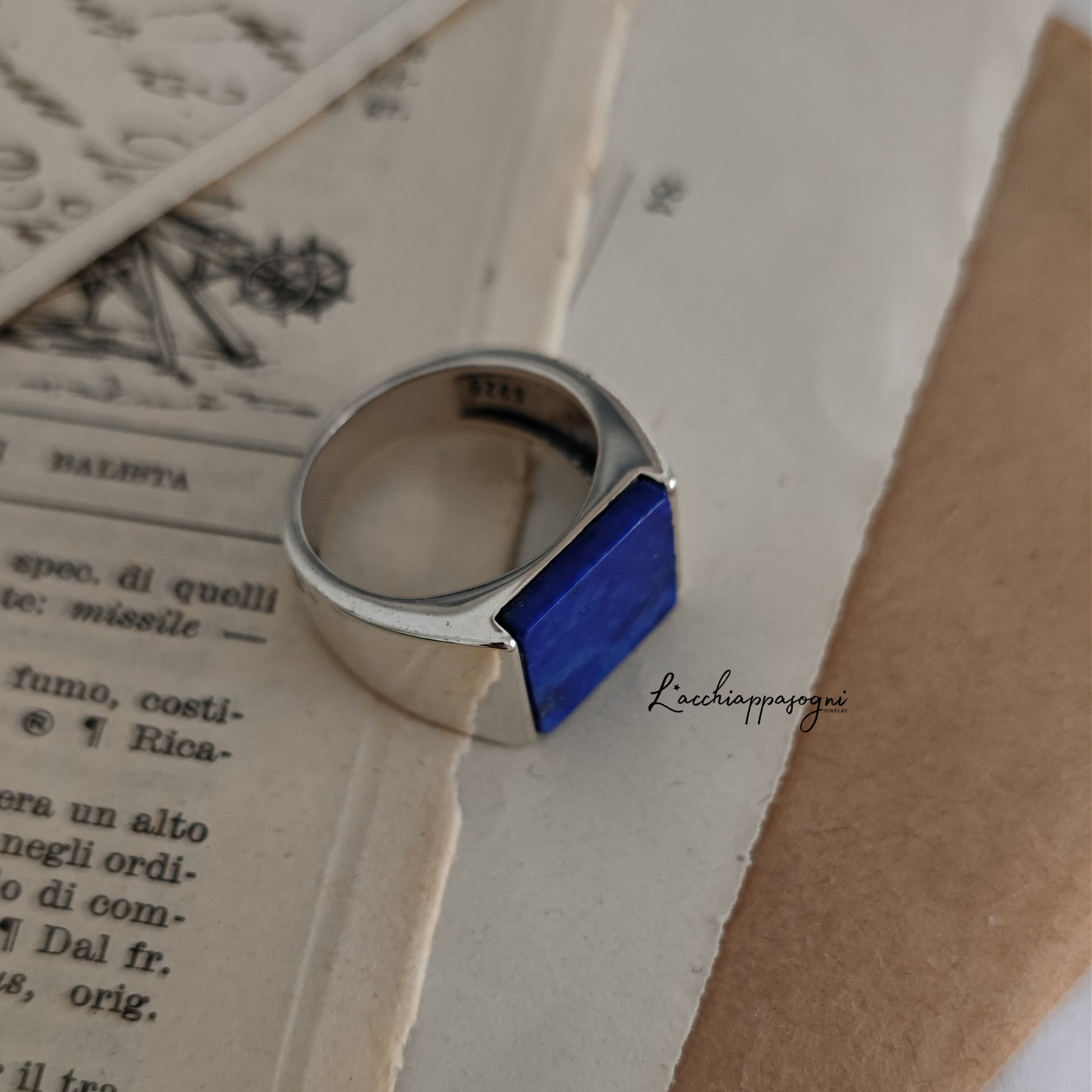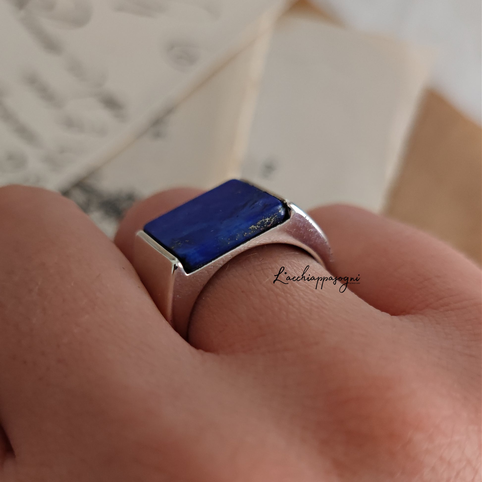 Questo gioiello dal design solido e minimale è realizzato interamente in argento 925 sterlin con cabochon in Lapislazzuli dalla forma rettangolare.