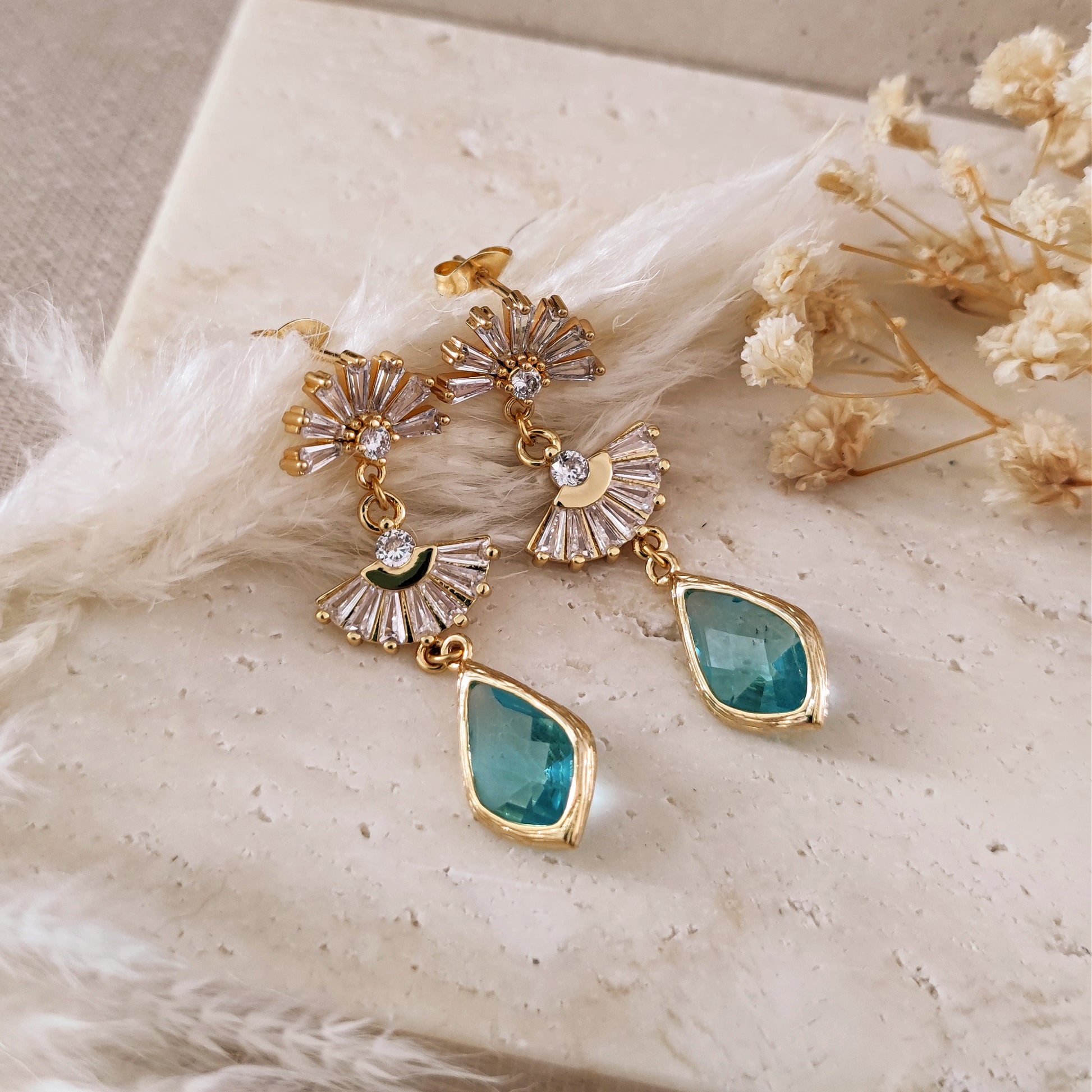 Questi orecchini pendenti a goccia sono realizzati con elementi in ottone placcato oro 14k e splendide gocce azzurre esaltate da ventagli geometrici di zirconi.