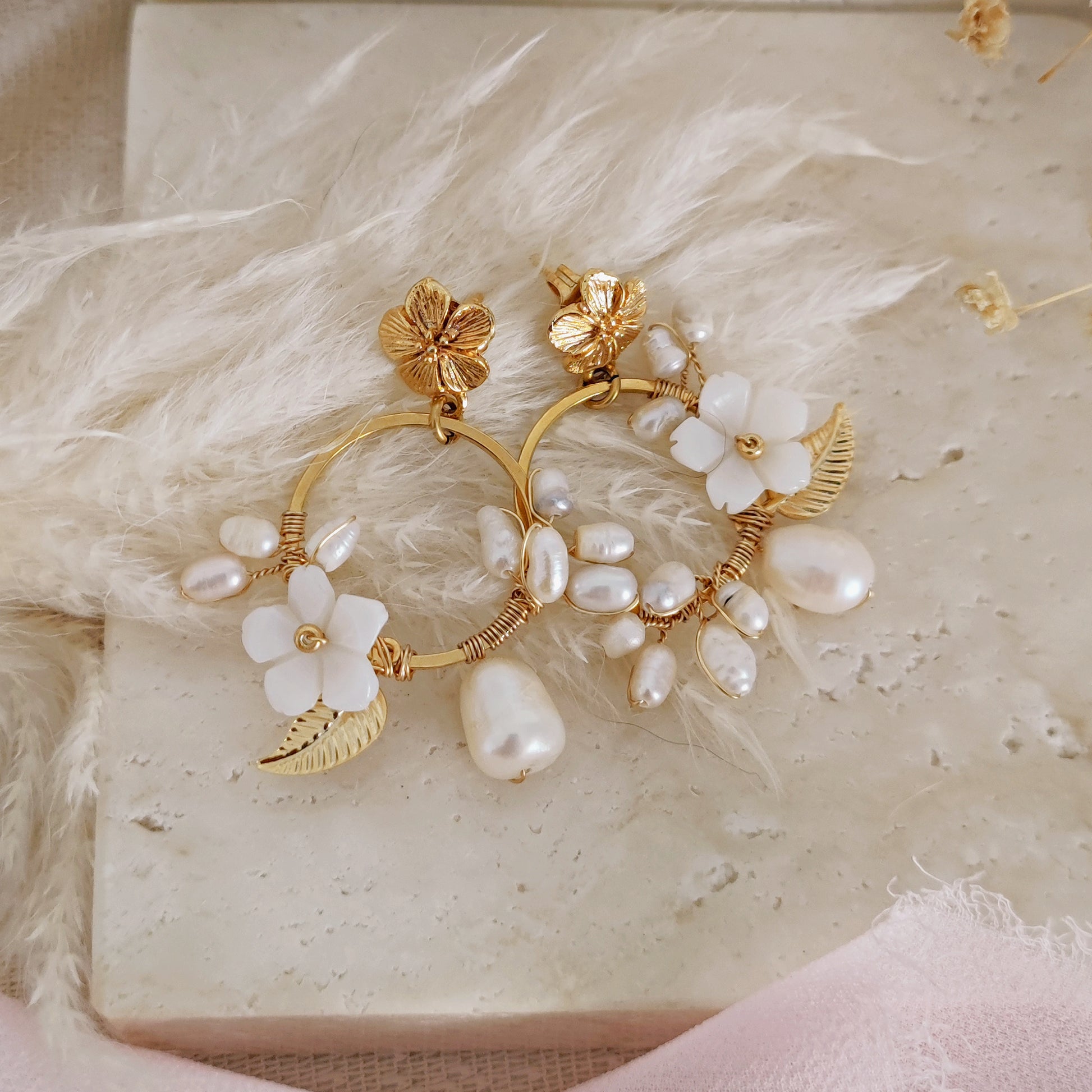 Orecchini Boho da sposa con girali floreali, perle e fiori in madreperla // CRISALIDE