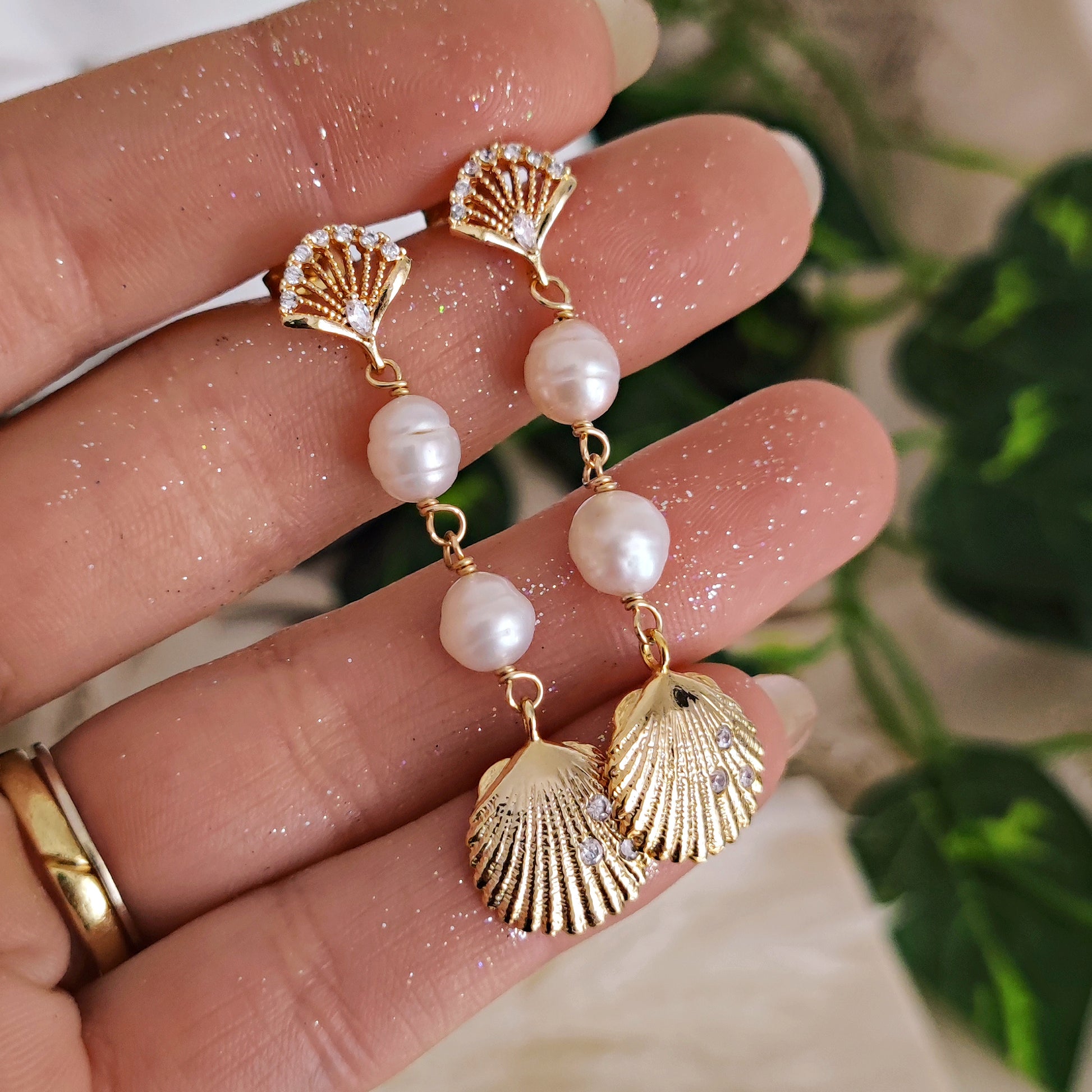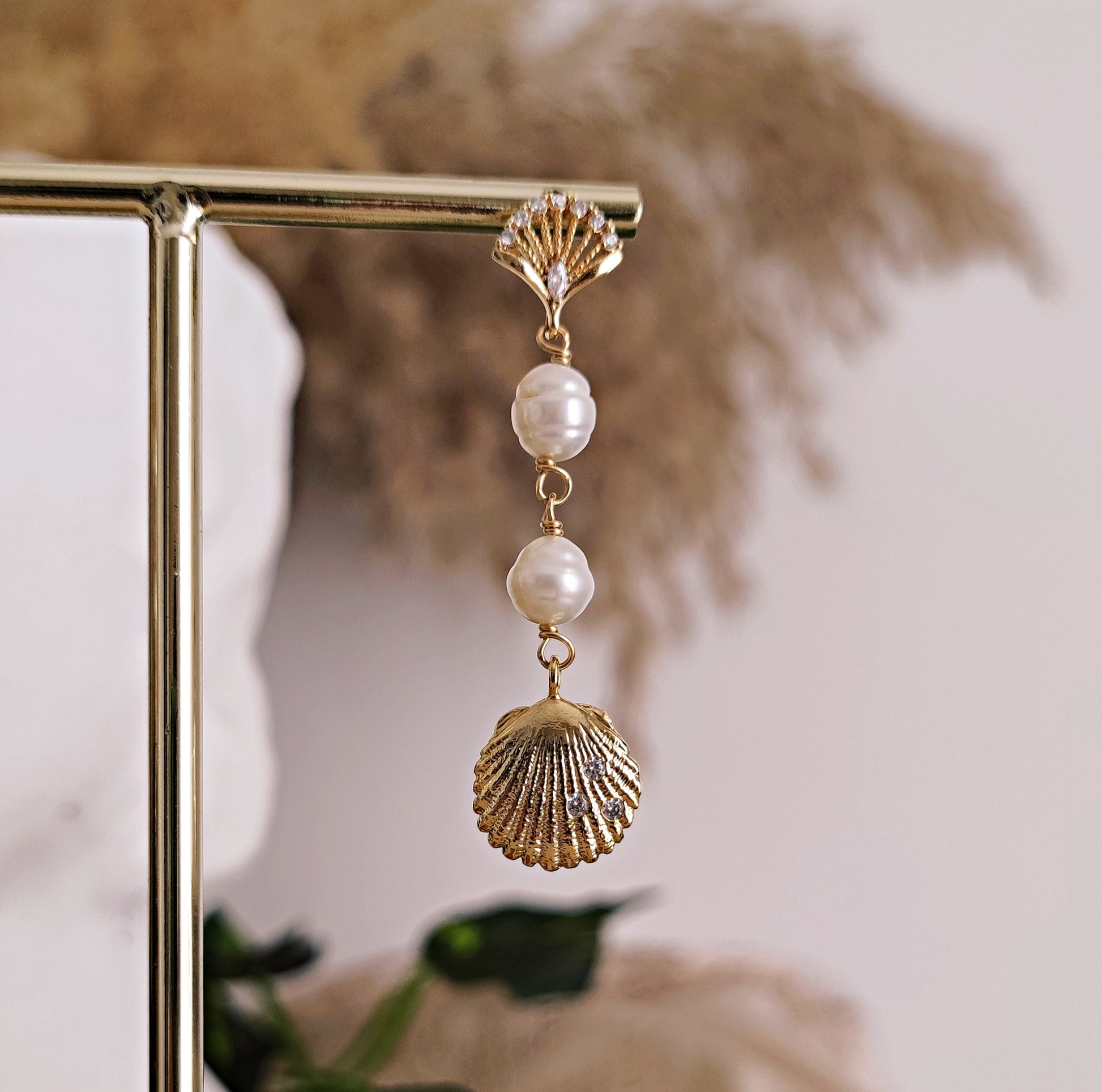 Delle perle d'acqua dolce splendidamente avvolte e un paio di perni a forma di conchiglia completano il design.