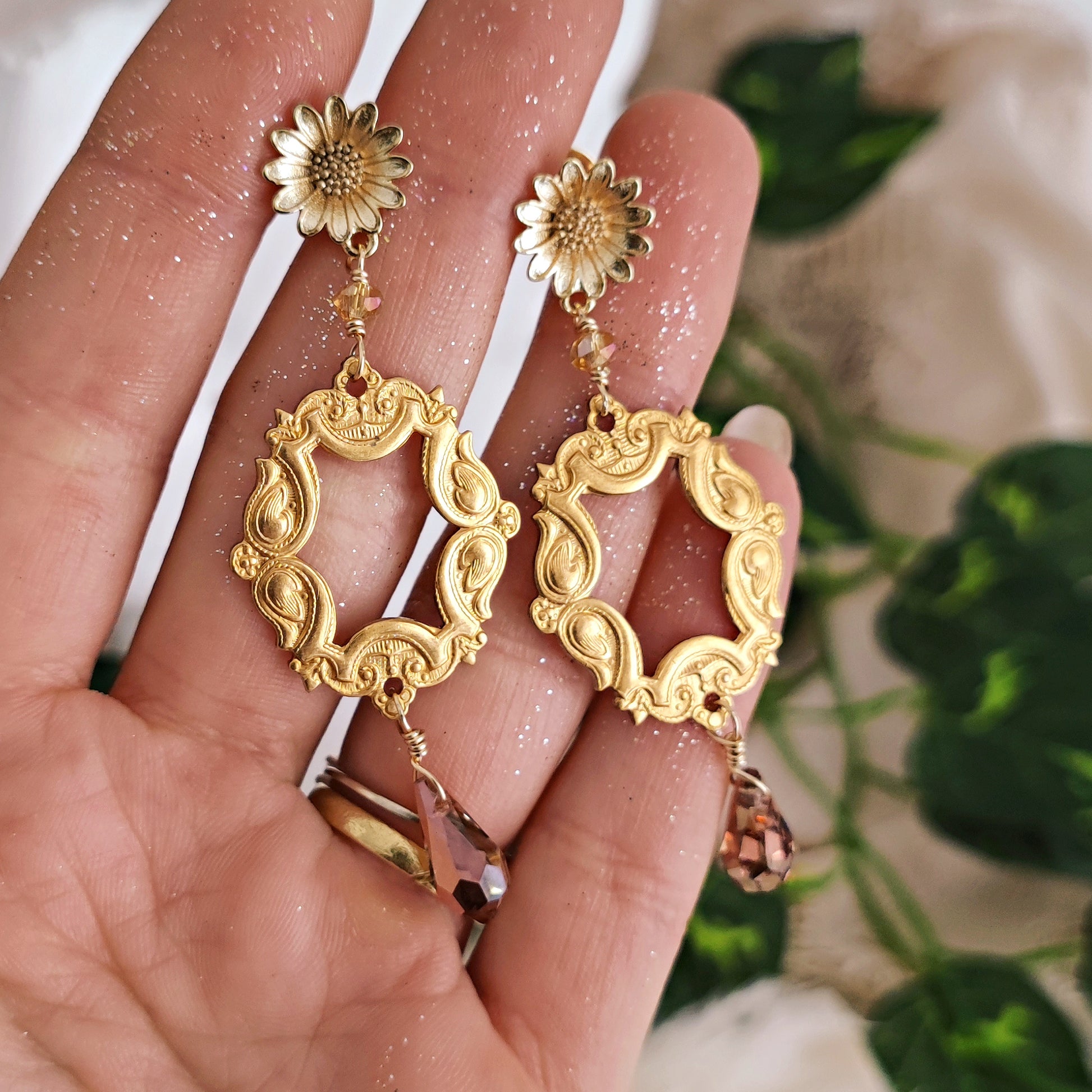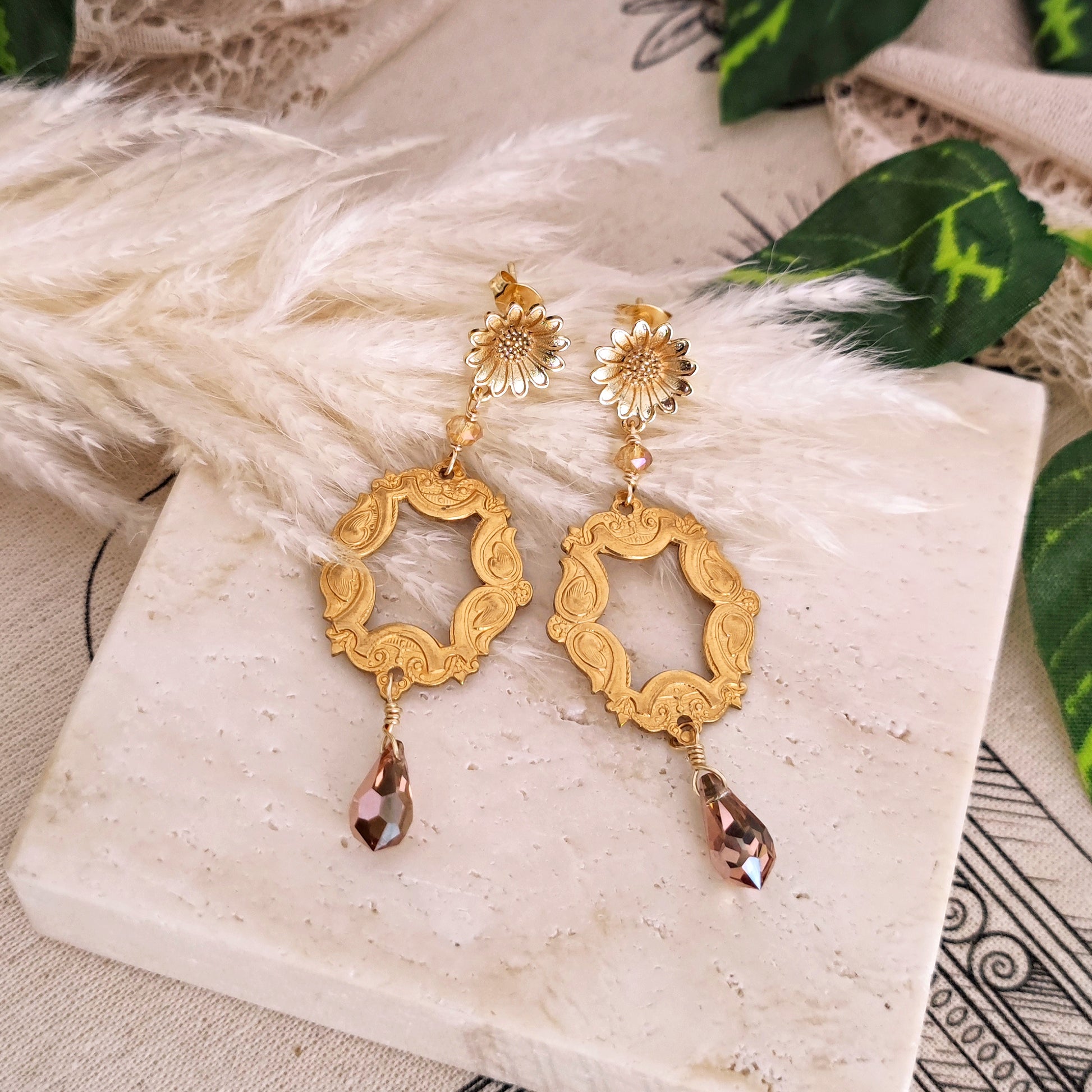Da due perni a forma di fiore si dipartono due cornici in ottone con splendidi cristalli a goccia dal colore conturbante e cangiante.