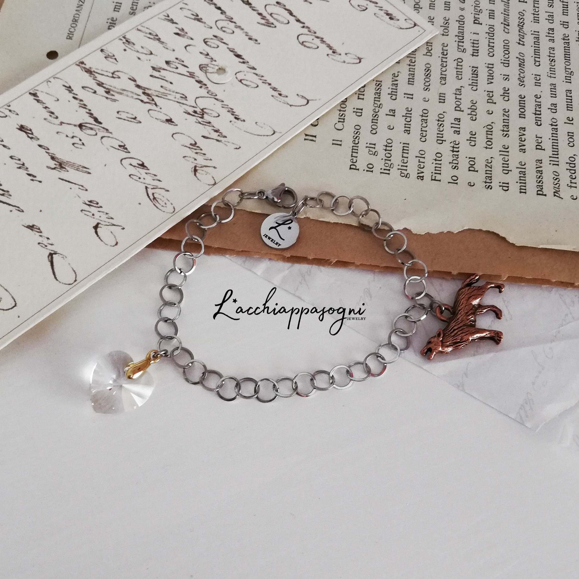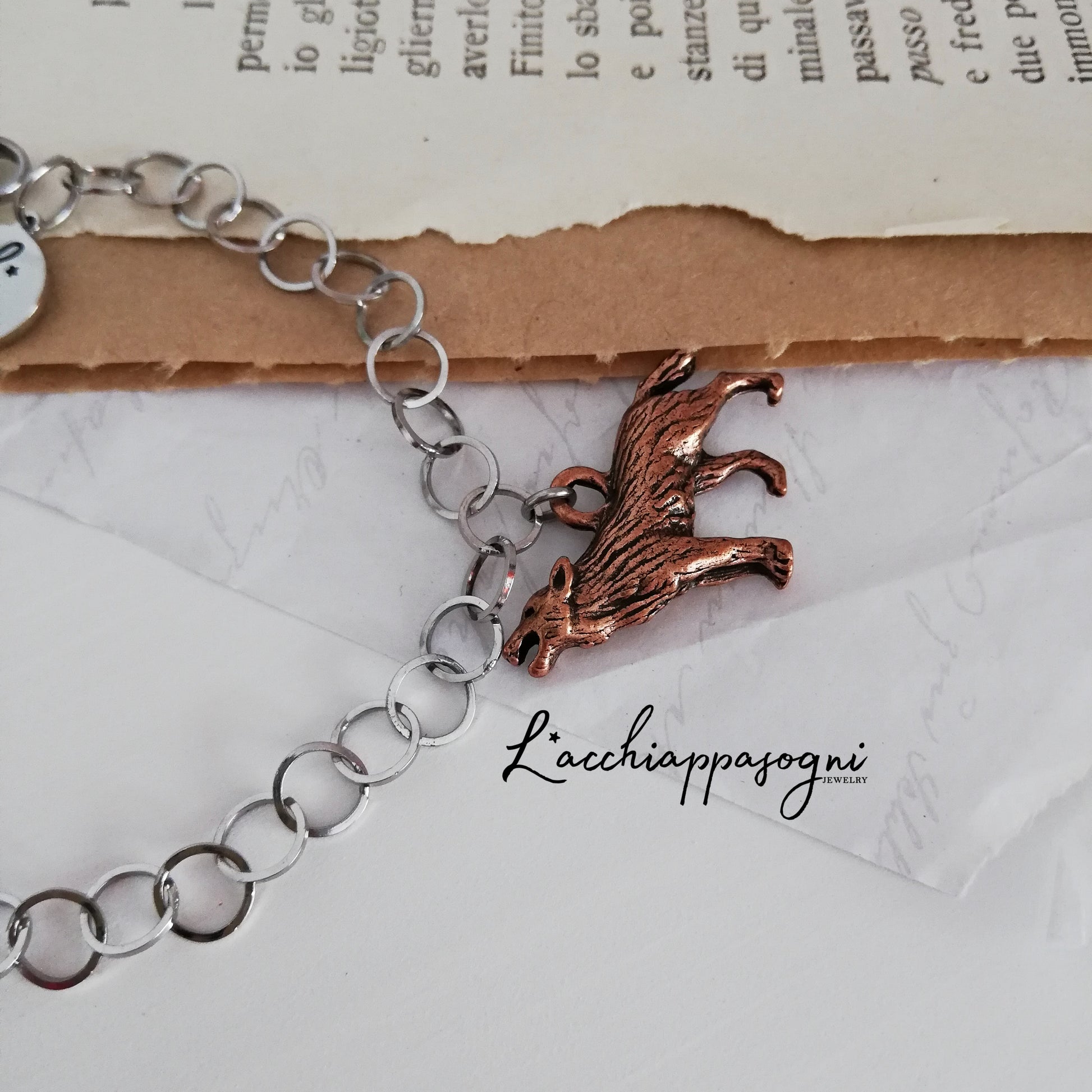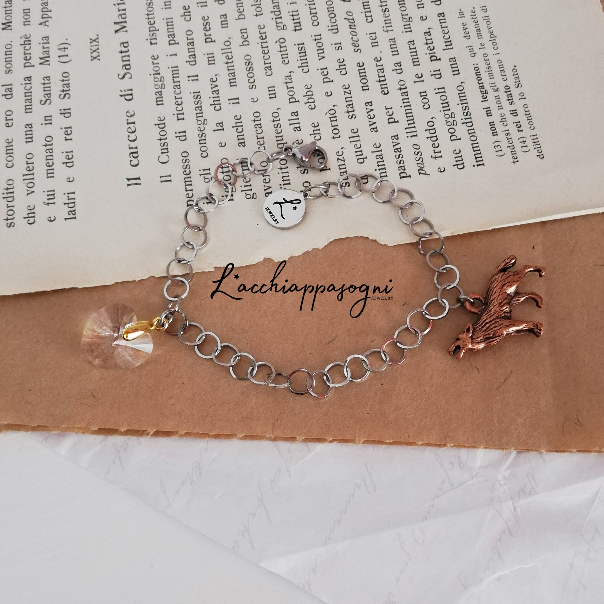 Questo prezioso bracciale è composto da una catenina (lunghezza personalizzabile) in acciaio inox, un cuore PureCrystal Light Shade di 14mm e uno charm a forma di lupo in peltro placcato rame.