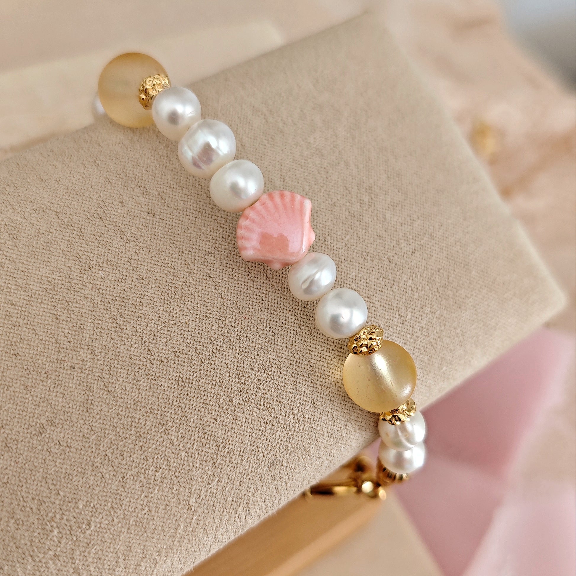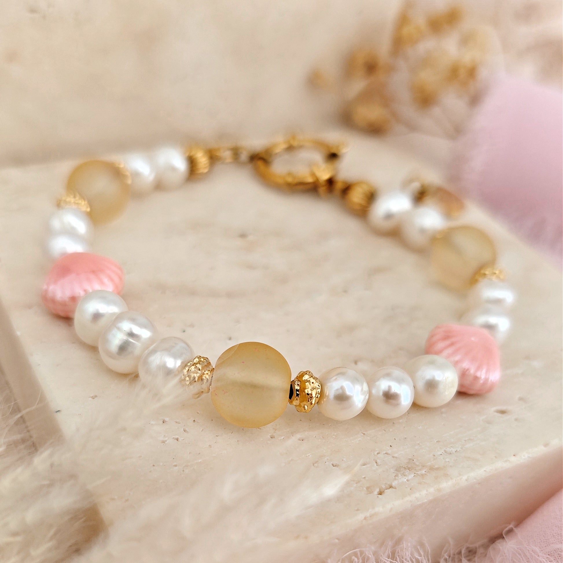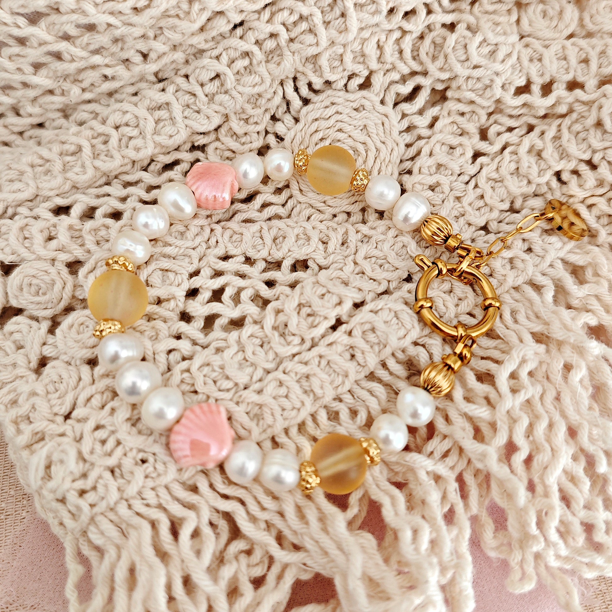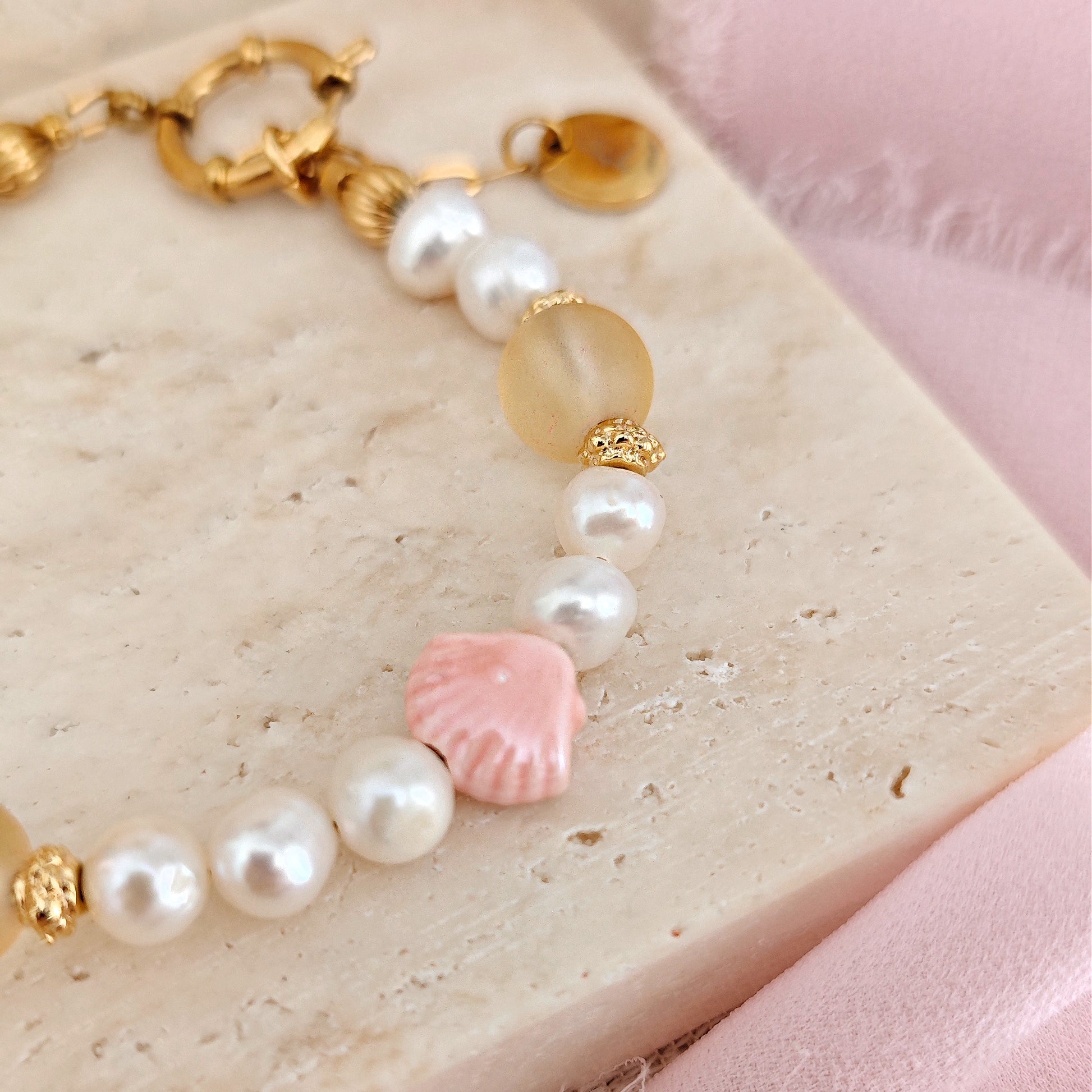 Bracciale "Golden Tide" con perle di fiume e conchiglie in ceramica