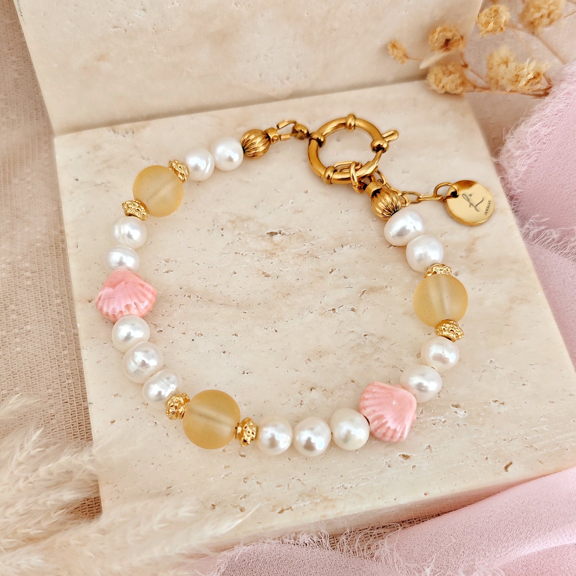 Un bracciale raffinato che unisce la naturalezza delle perle di fiume a tocchi di colore e dettagli artigianali. Golden Tide è composto da perle di fiume, perline in acciaio inox placcato oro 14k, perle in vetro giallo opaco e perline in ceramica rosa a forma di conchiglia.