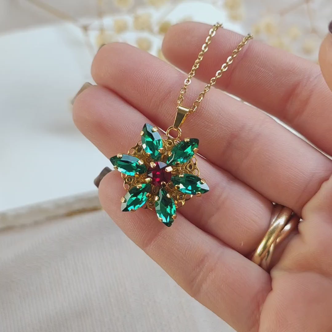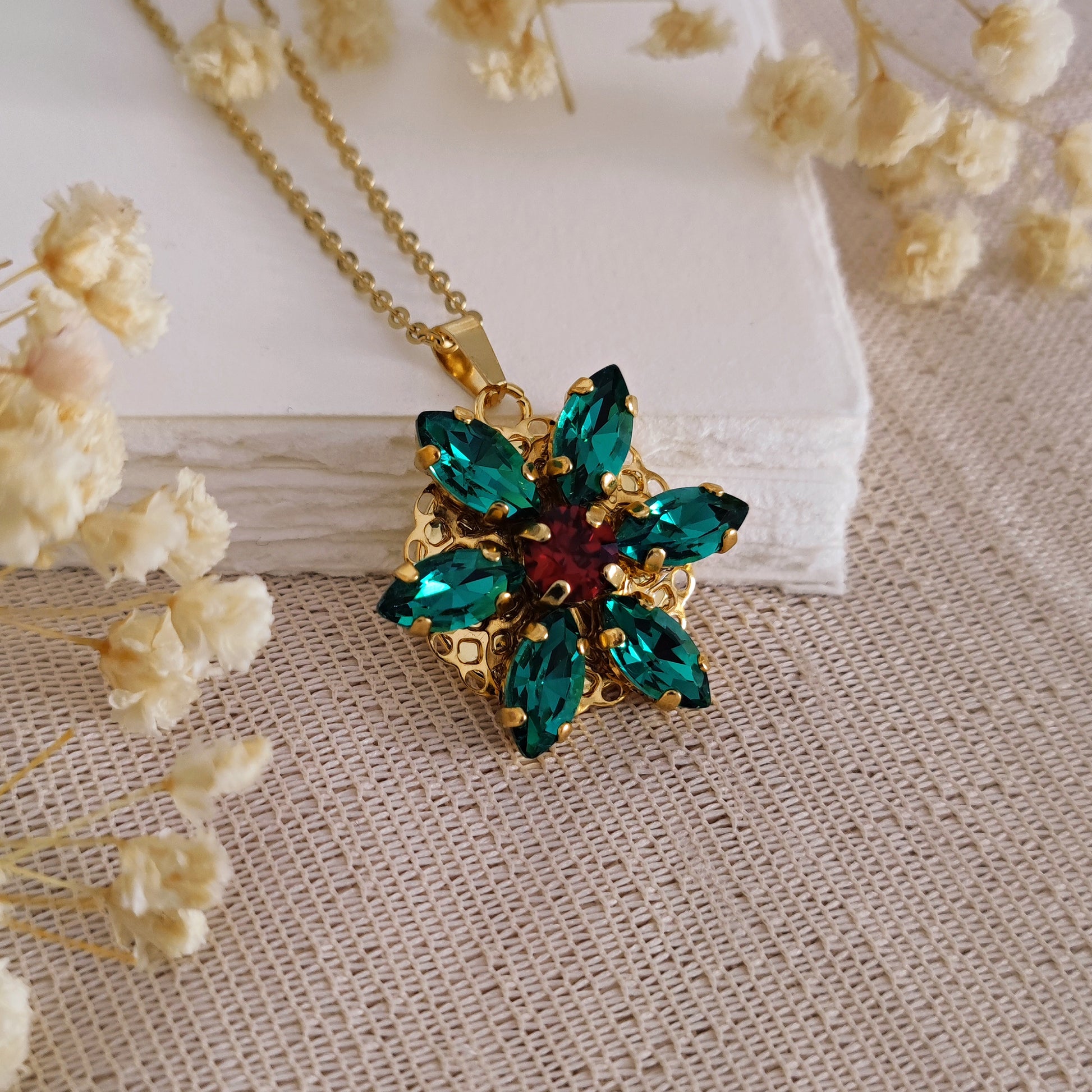 Le navette in cristallo Aurora Light Emerald e il cristallo Red Siam poggiano su una base filigranata floreale in ottone placcato oro 14k dalla finitura brillante.