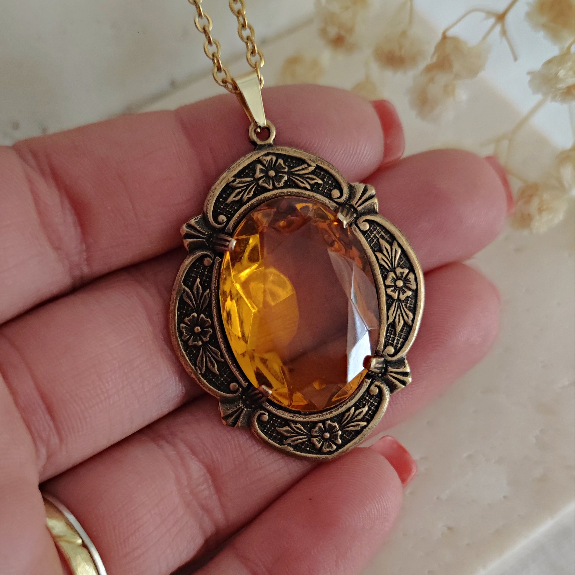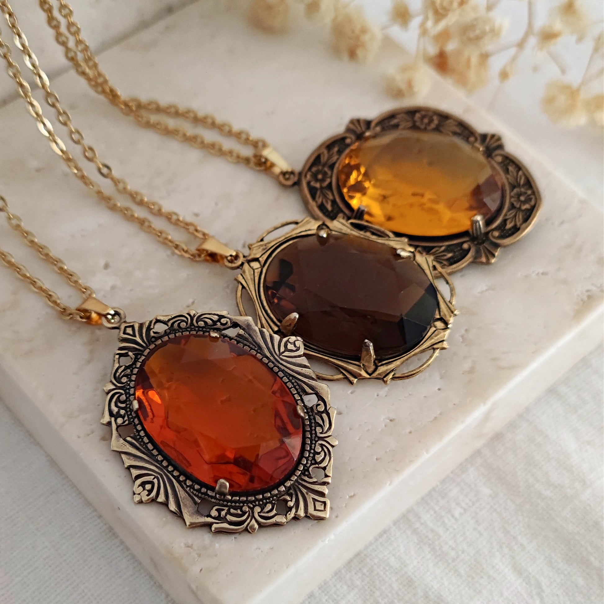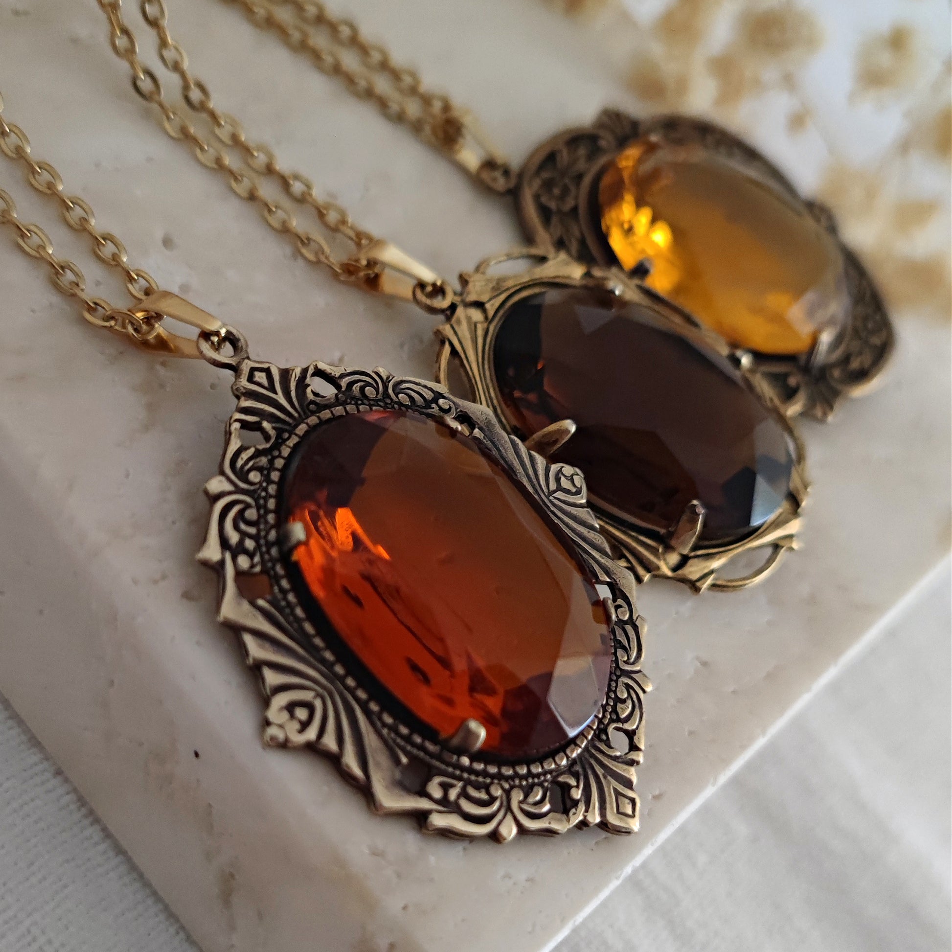 3) la versione Madeira Topaz, realizzata con catenina in acciaio inox placcato oro anticato, base in ottone anticato e cristallo sfaccettato in vetro Czech color arancio intenso.