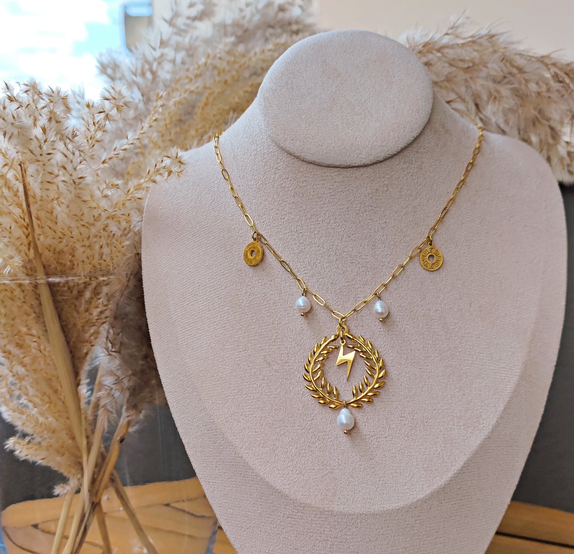 La collana è composta da un ciondolo principale che misura 4,5cm, a forma di corona d'alloro da cui pende una perla di fiume, e al cui interno è collocato un fulmine, simbolo di Zeus. Lungo la catena dondolano due perle di fiume e due ciondoli a forma di greche.