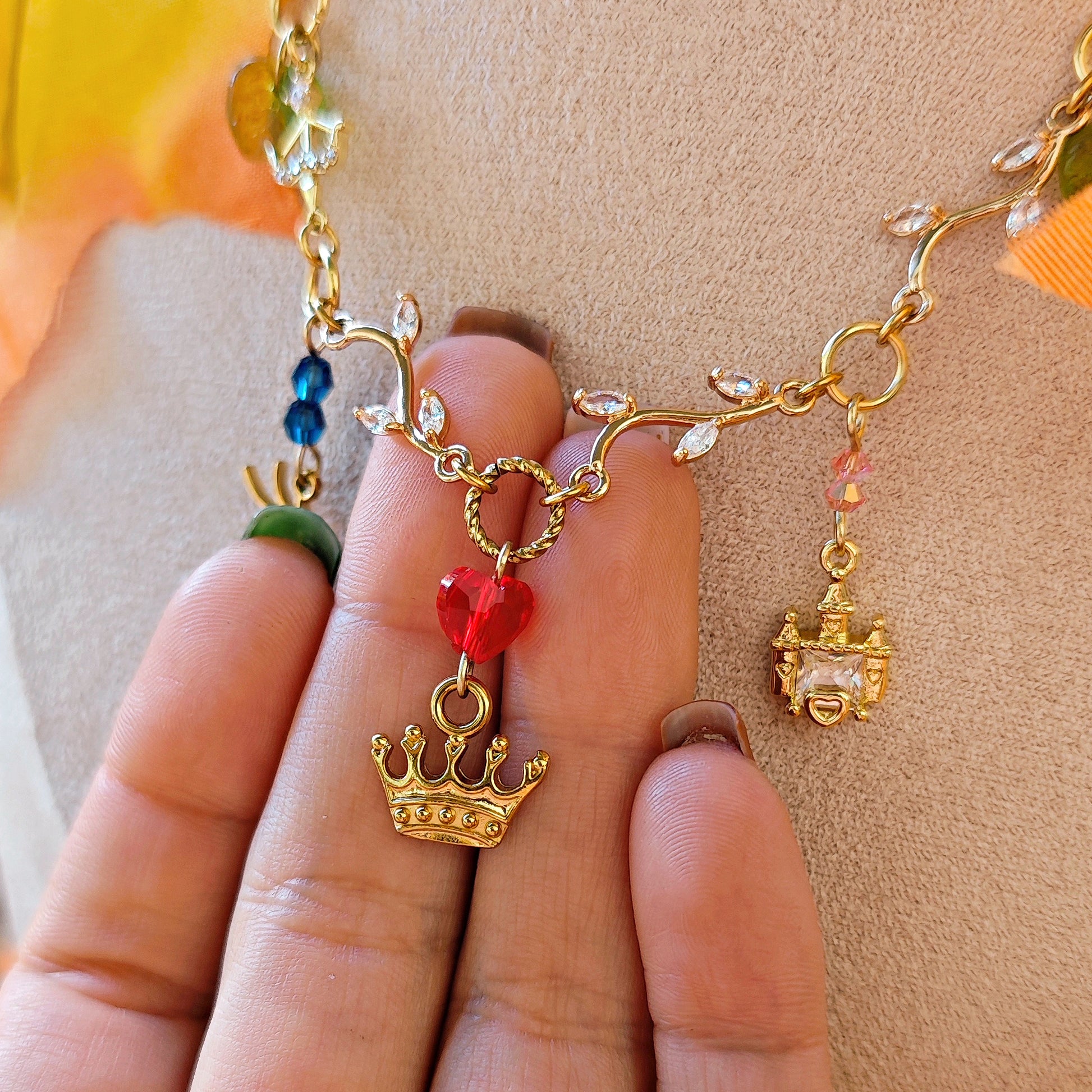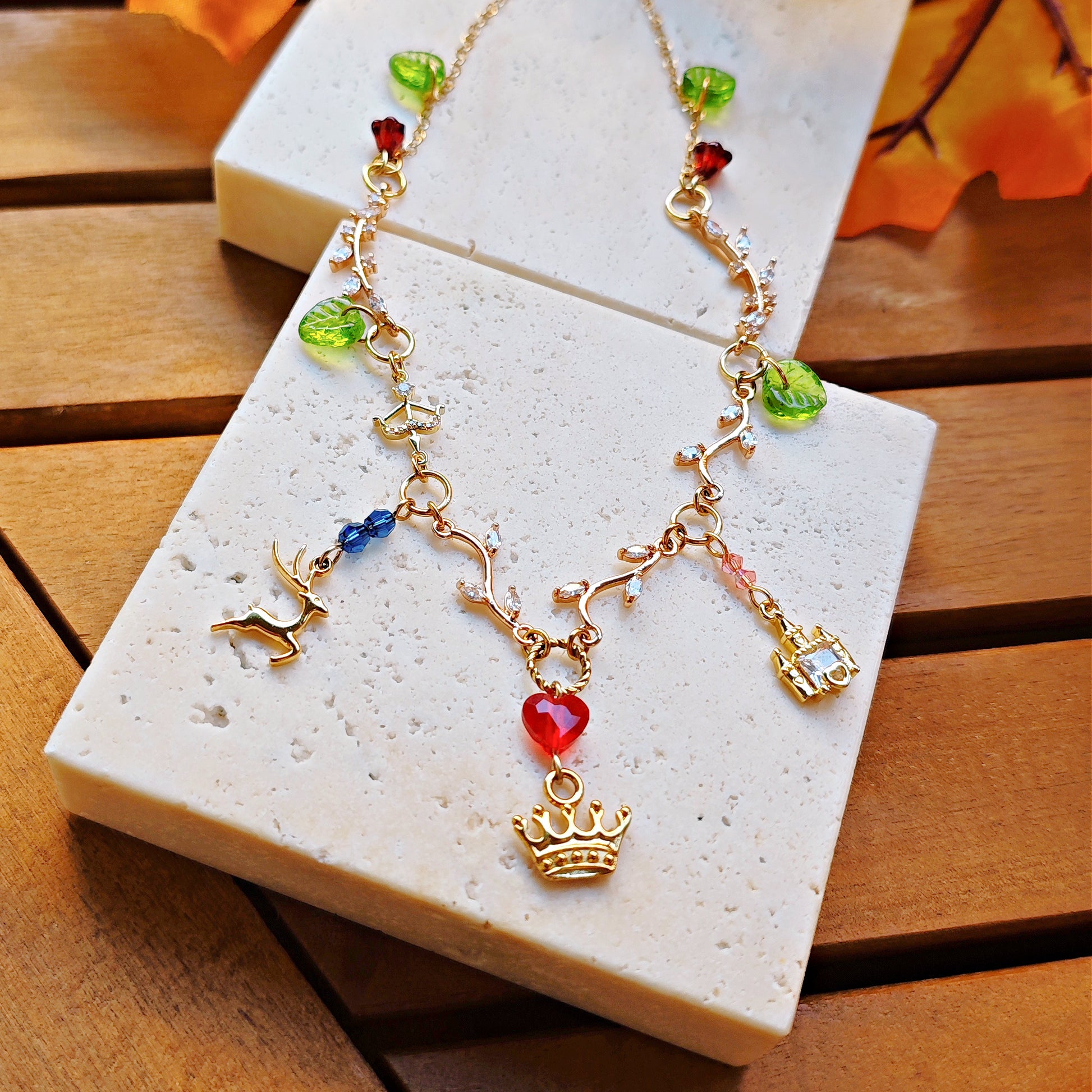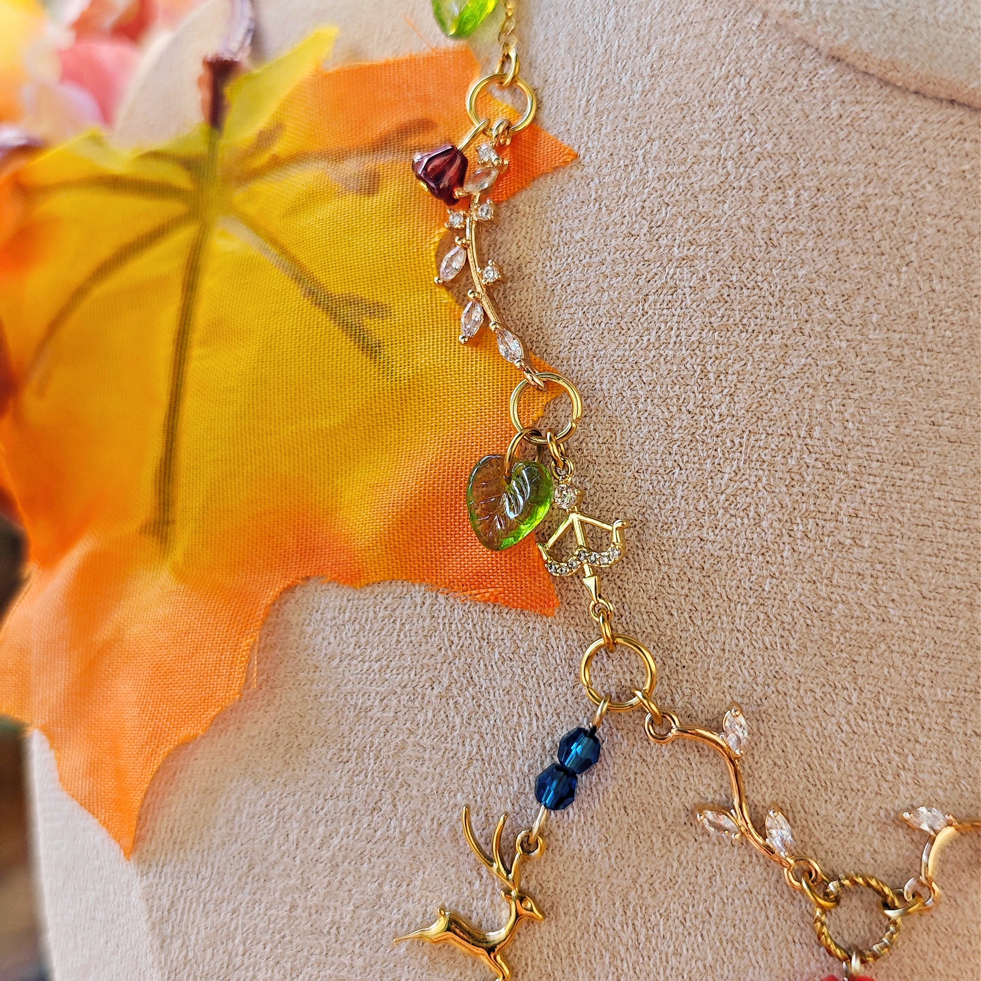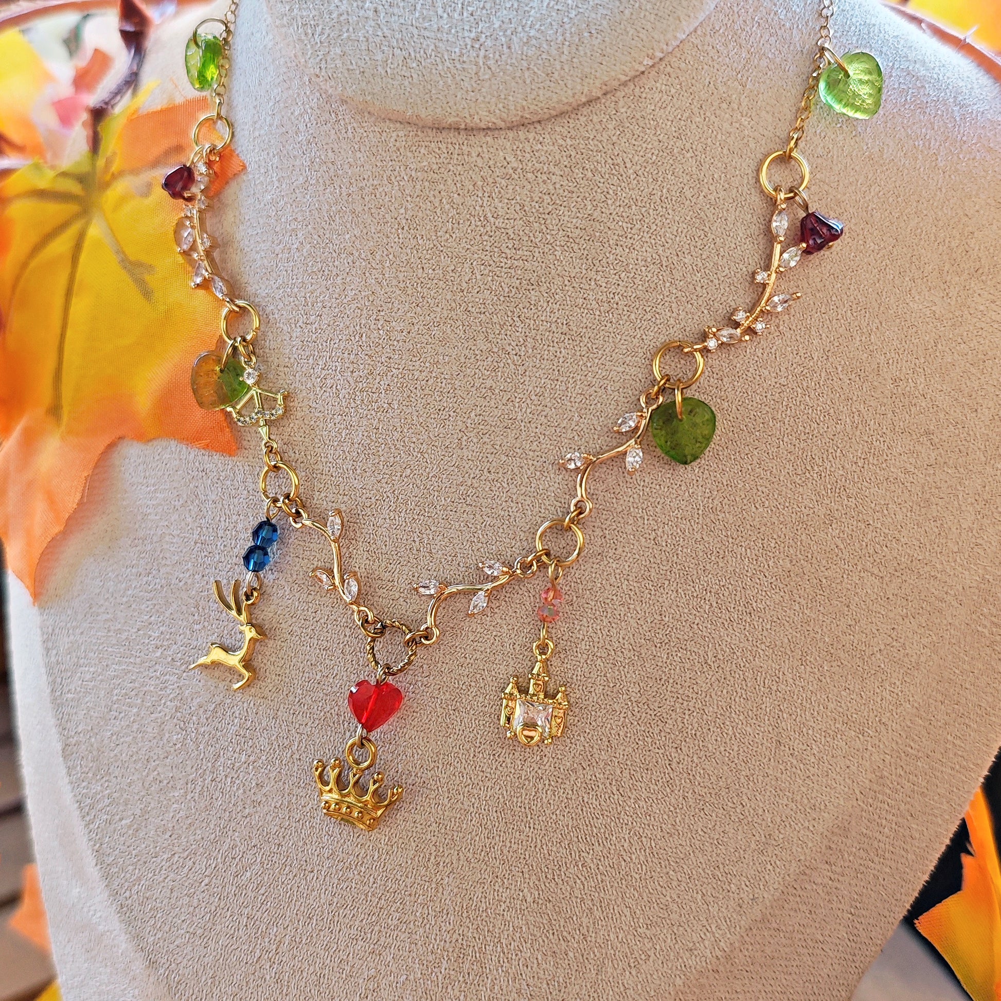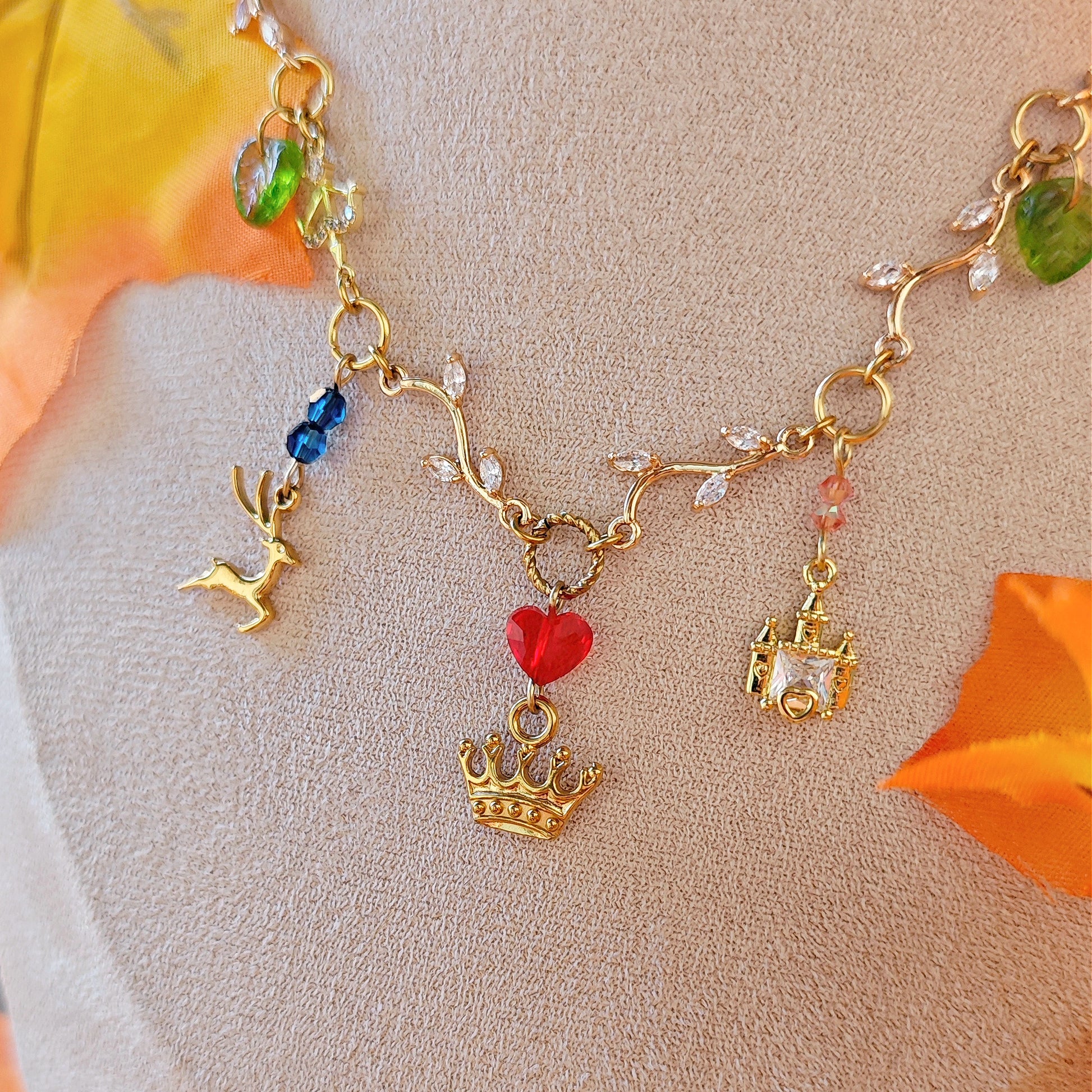 Una collana che racconta la fiaba dei Fratelli Grimm Fratellino e Sorellina, dove il bosco diventa rifugio, incanto e magia. I rami dorati intrecciati di foglie di cristallo ci guidano alla scoperta della storia, tra foglie olivine, fiori rossi dondolanti e perline dai toni delicati, come petali sparsi lungo un sentiero segreto. I ciondoli — un capriolo con perline blu che richiamano la fonte magica che ha trasformato Fratellino nella sua forma animale, un castello, e una corona sormontata da un cuore rosso di cristallo — evocano i simboli della fiaba: amore fraterno, coraggio e il bene che trionfa sul male. Ogni scintillio è un sussurro del bosco, un frammento di incanto da indossare.