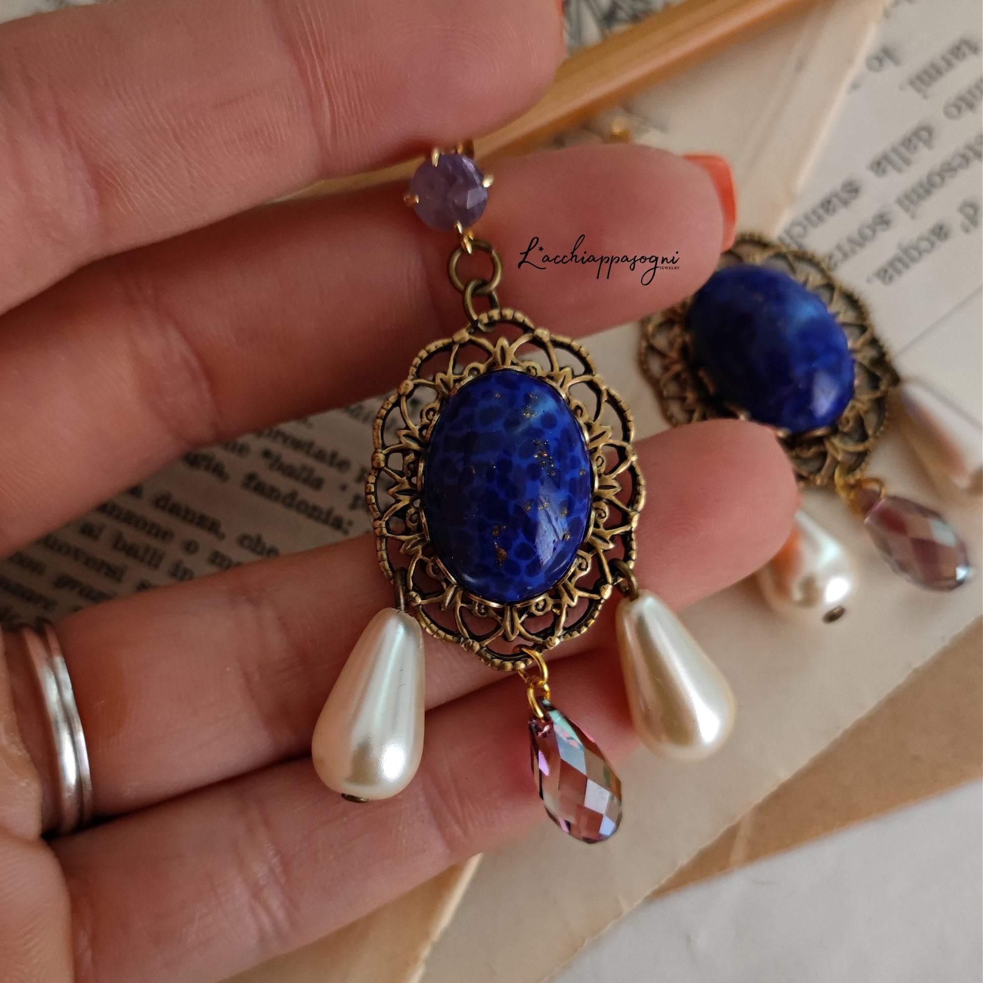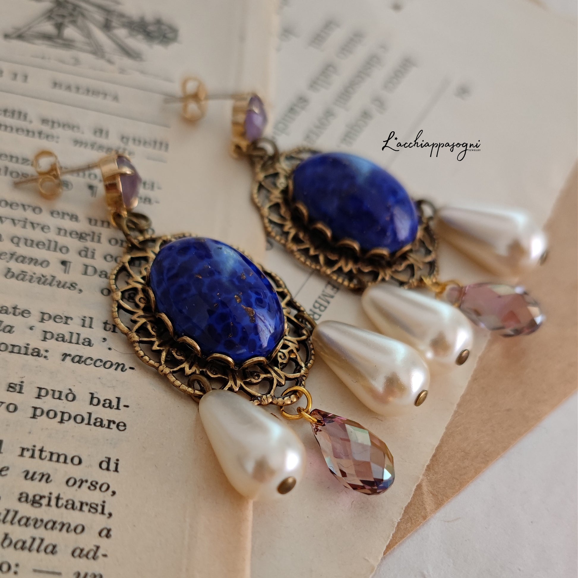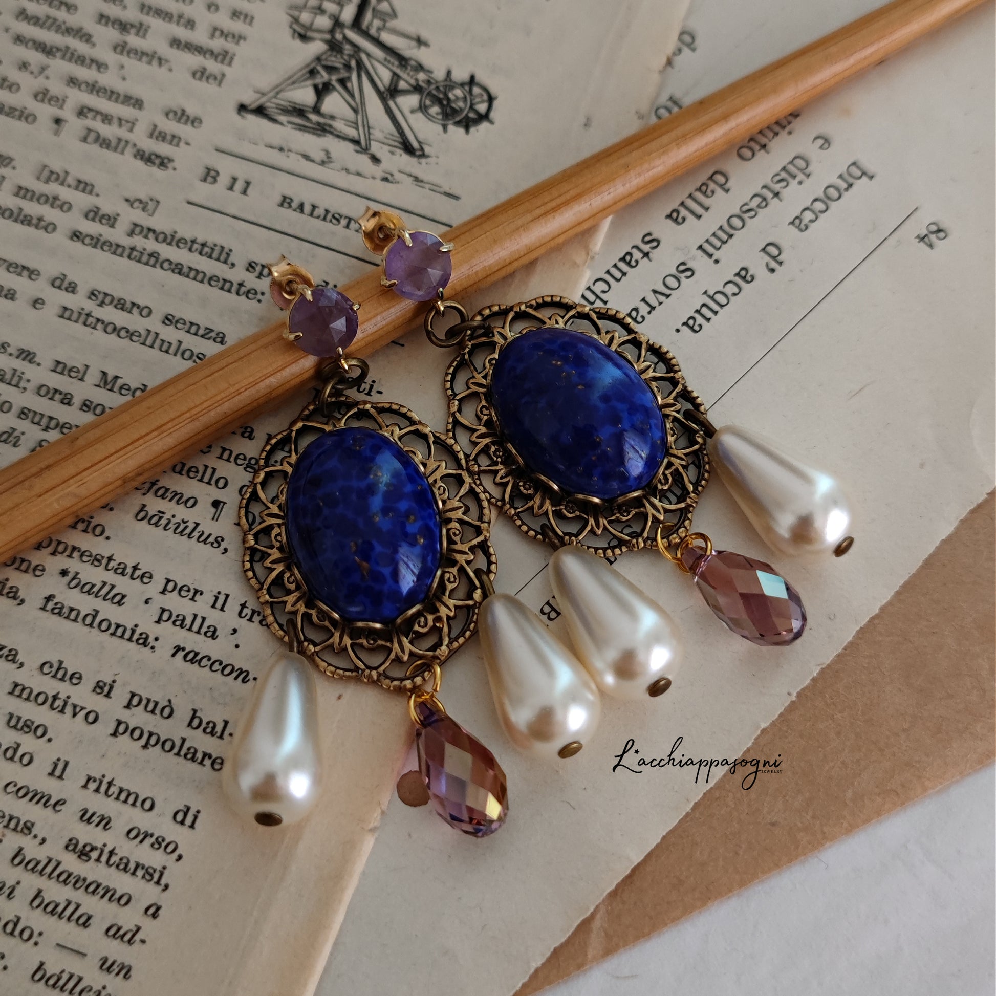 Il design elaborato include componenti di altà qualità per un risultato davvero regale: perni in ottone placcato oro 14k con piccoli cabochon in vera ametista, filigrane e basi coronate in ottone anticato, cabochon in vetro czech blu imitazione del Lapislazuli, gocce in cristallo Swarovski Amethyst e perle Swarovski a goccia.