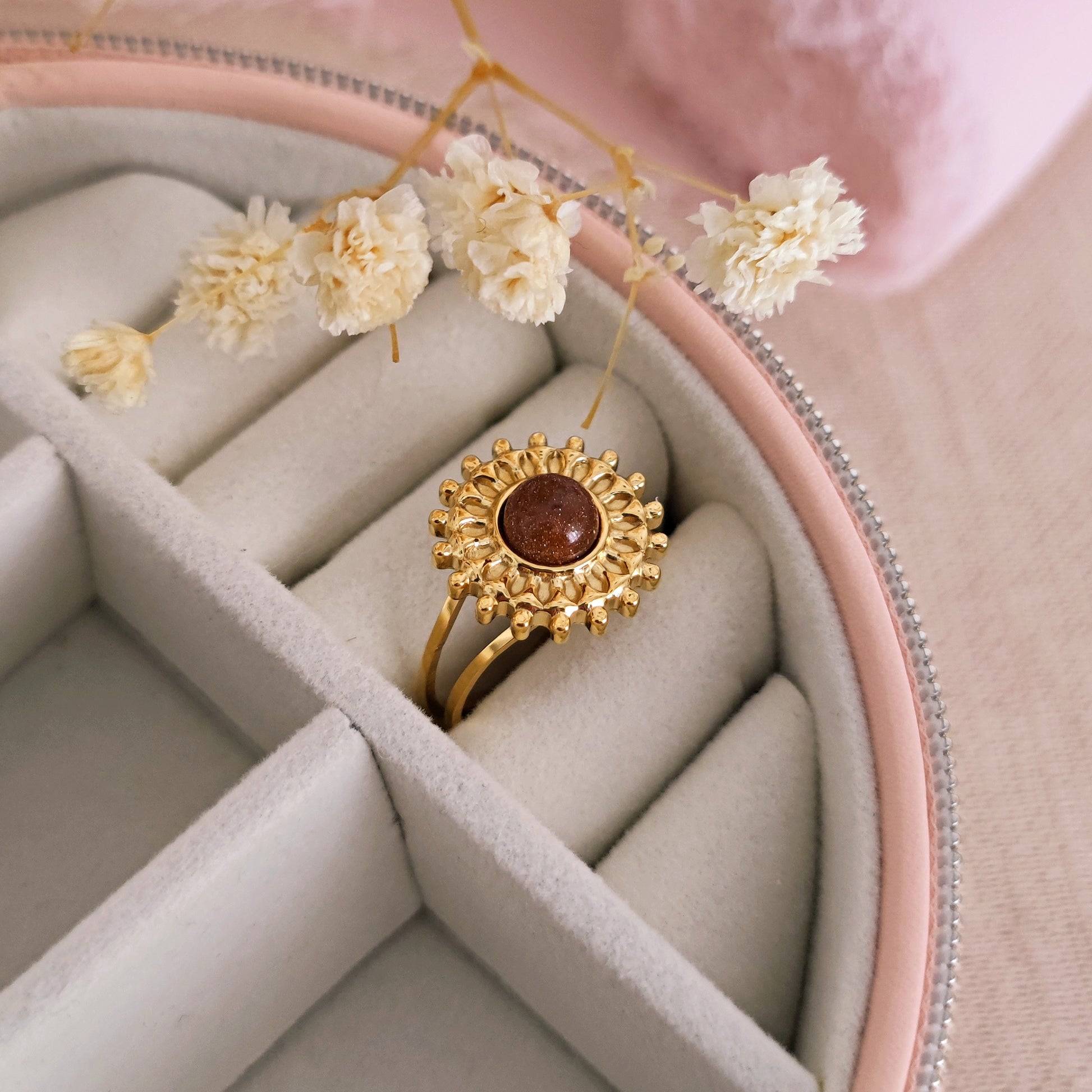 Una placchetta di circa 14mm che ricorda la forma di sole texturizzato accoglie uno splendido cabochon di Pietra del Sole di 6mm.