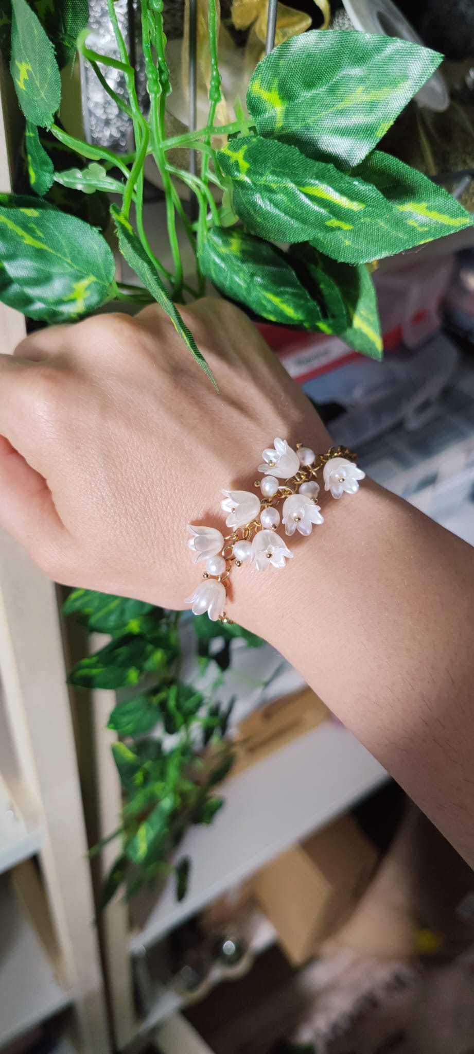 • 4 bracciali damigelle da 20 cm con campanule bianche in resina, perle d'acqua dolce irregolari e catenina in acciaio inox placcato oro 14k (22€ cad.)