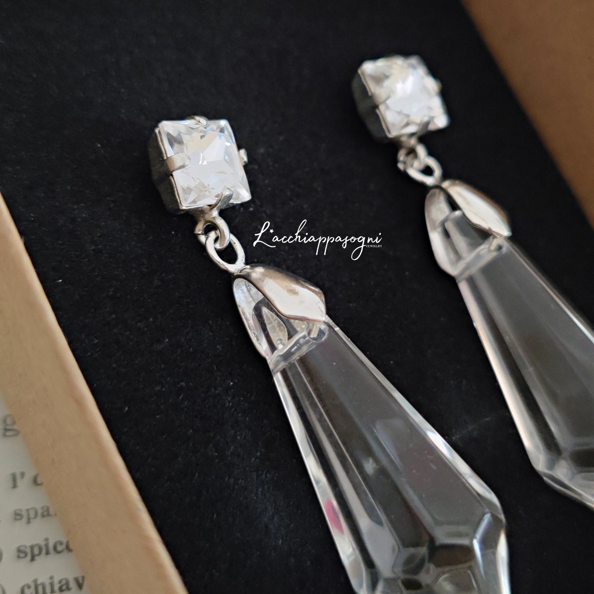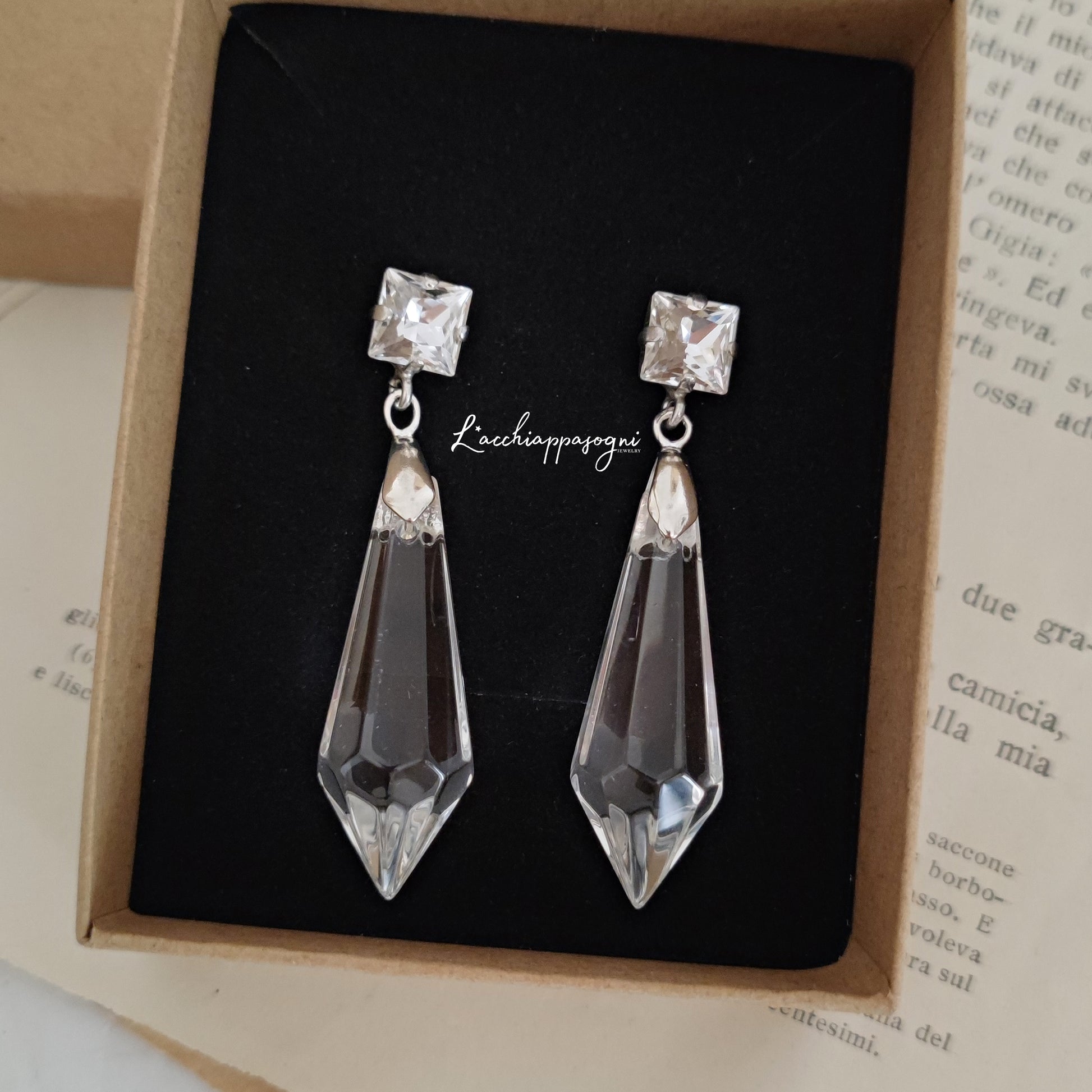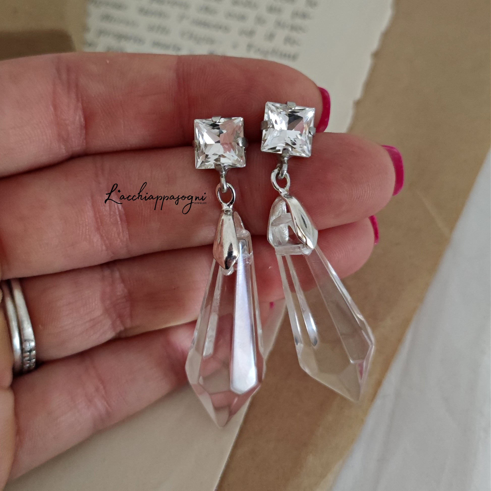 • materiali: orecchini a lobo in ottone placcato rodio, ganci portapendenti in ottone placcato argento, gocce a prisma in vetro cristallo trasparente, cabochons quadrati in cristallo Swarovski crystal AB