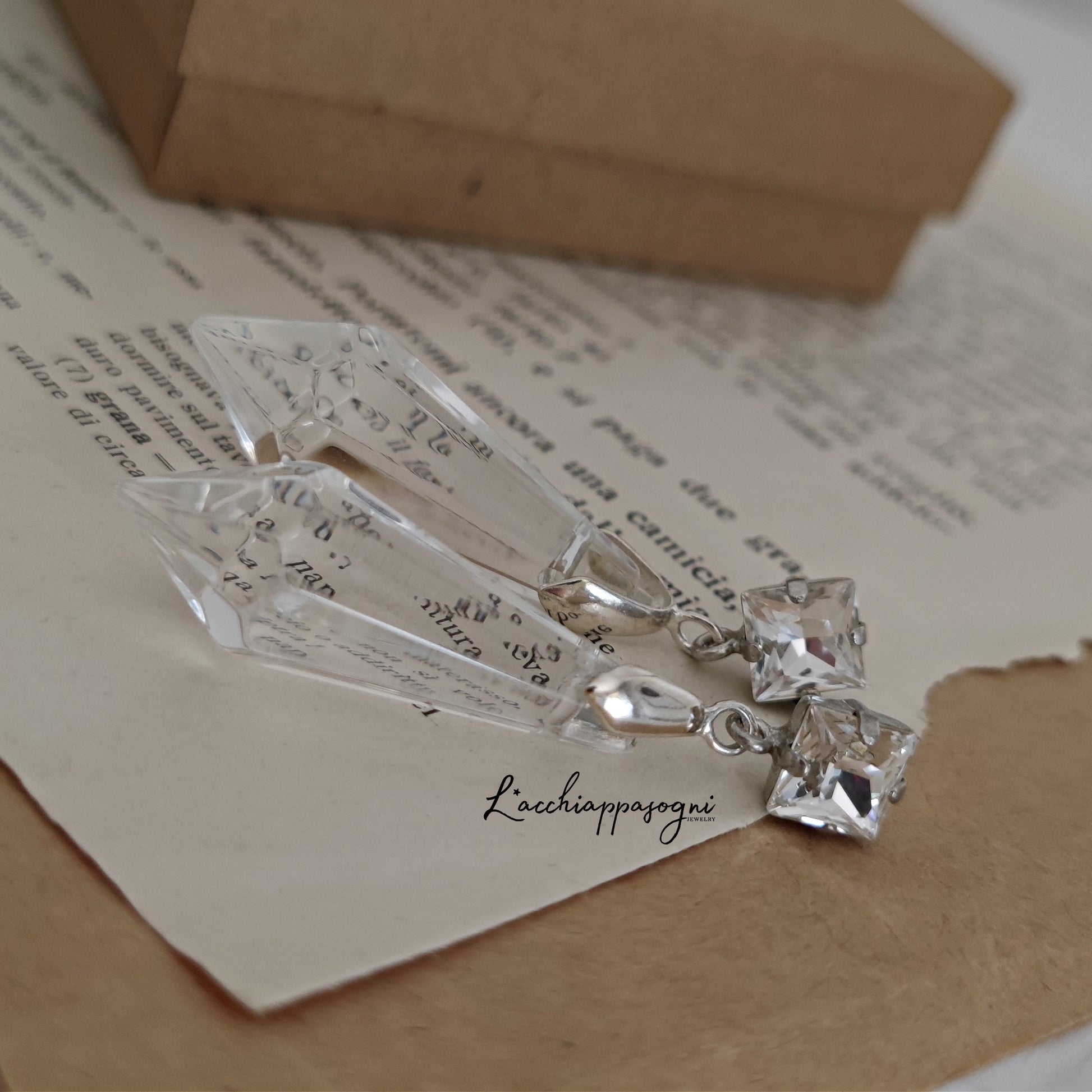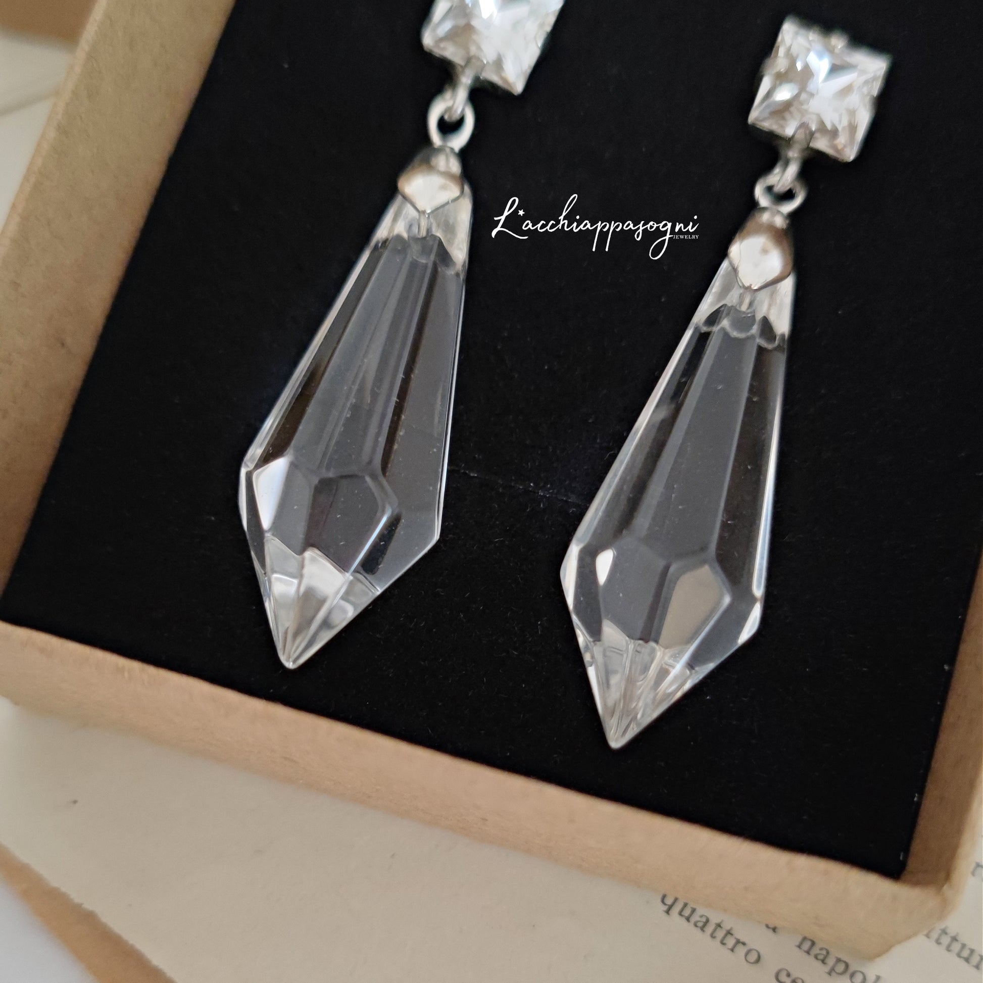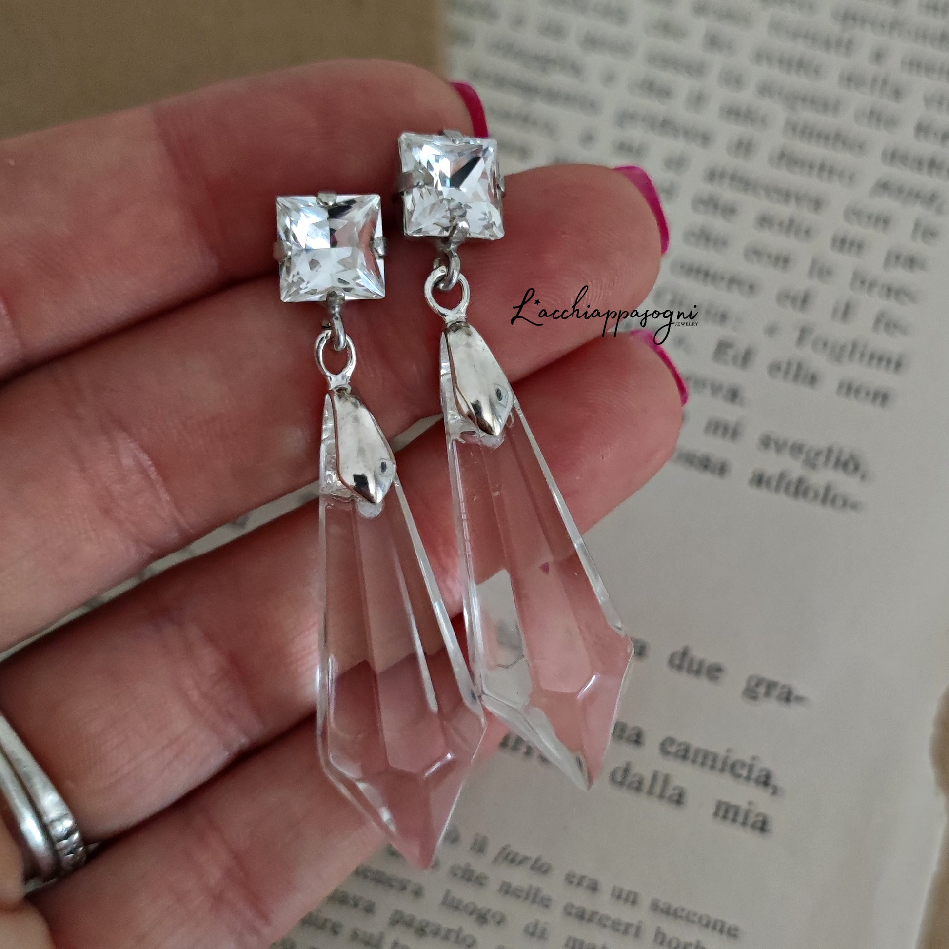 • materiali: orecchini a lobo in ottone placcato rodio, ganci portapendenti in ottone placcato argento, gocce a prisma in vetro cristallo trasparente, cabochons quadrati in cristallo Swarovski crystal AB