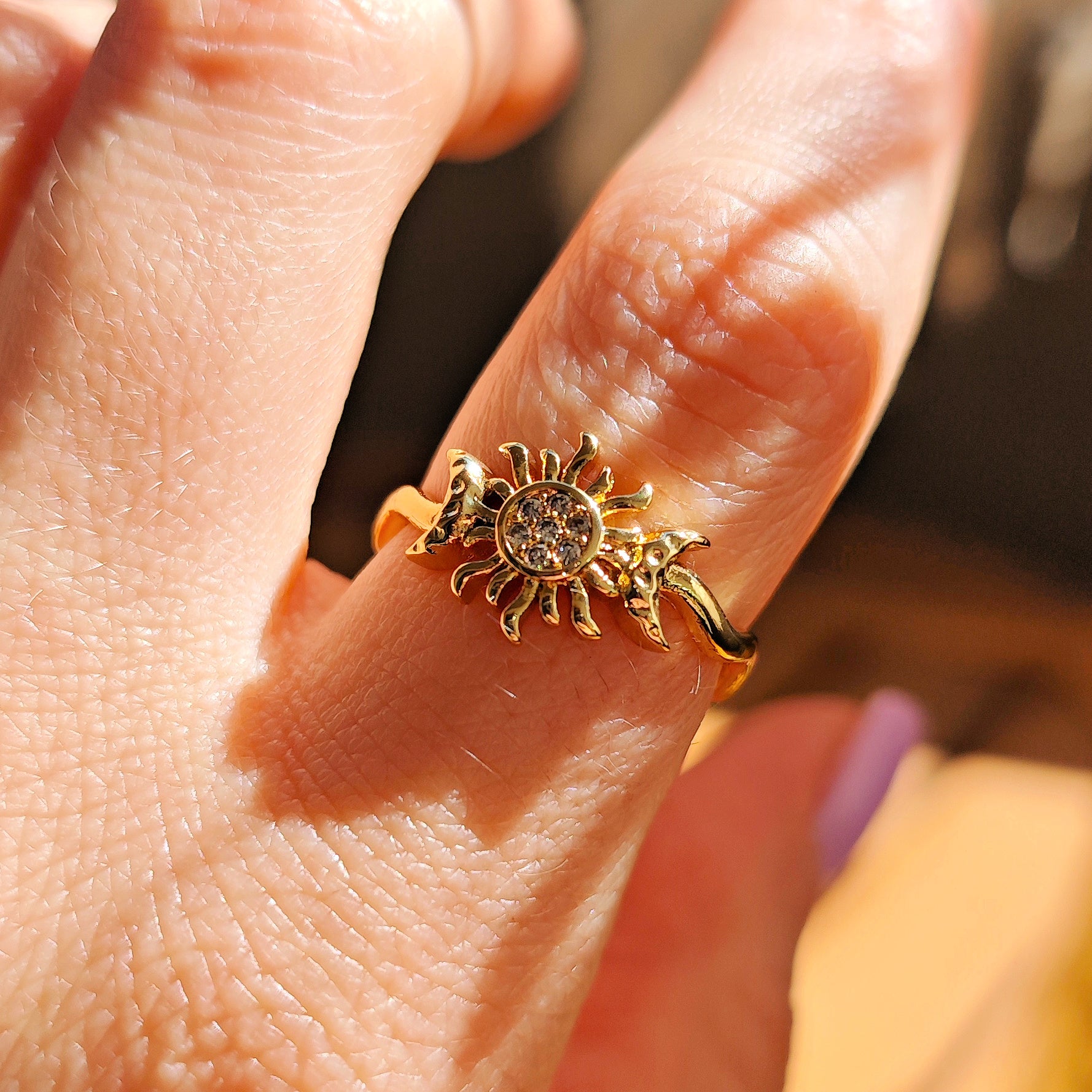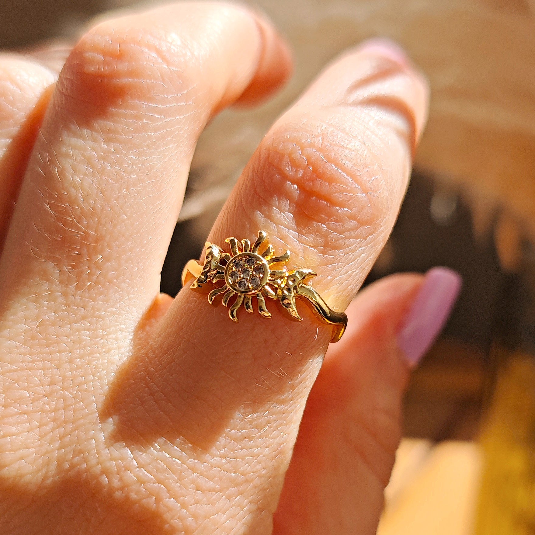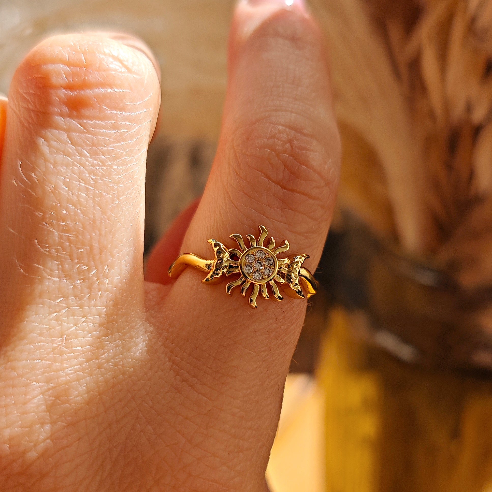 Questo splendido anello con sole centrale e due mezzelune è ispirato ai due gemelli Apollo, dio del Sole e delle Arti, e Artemide, dea della caccia associata al culto lunare.