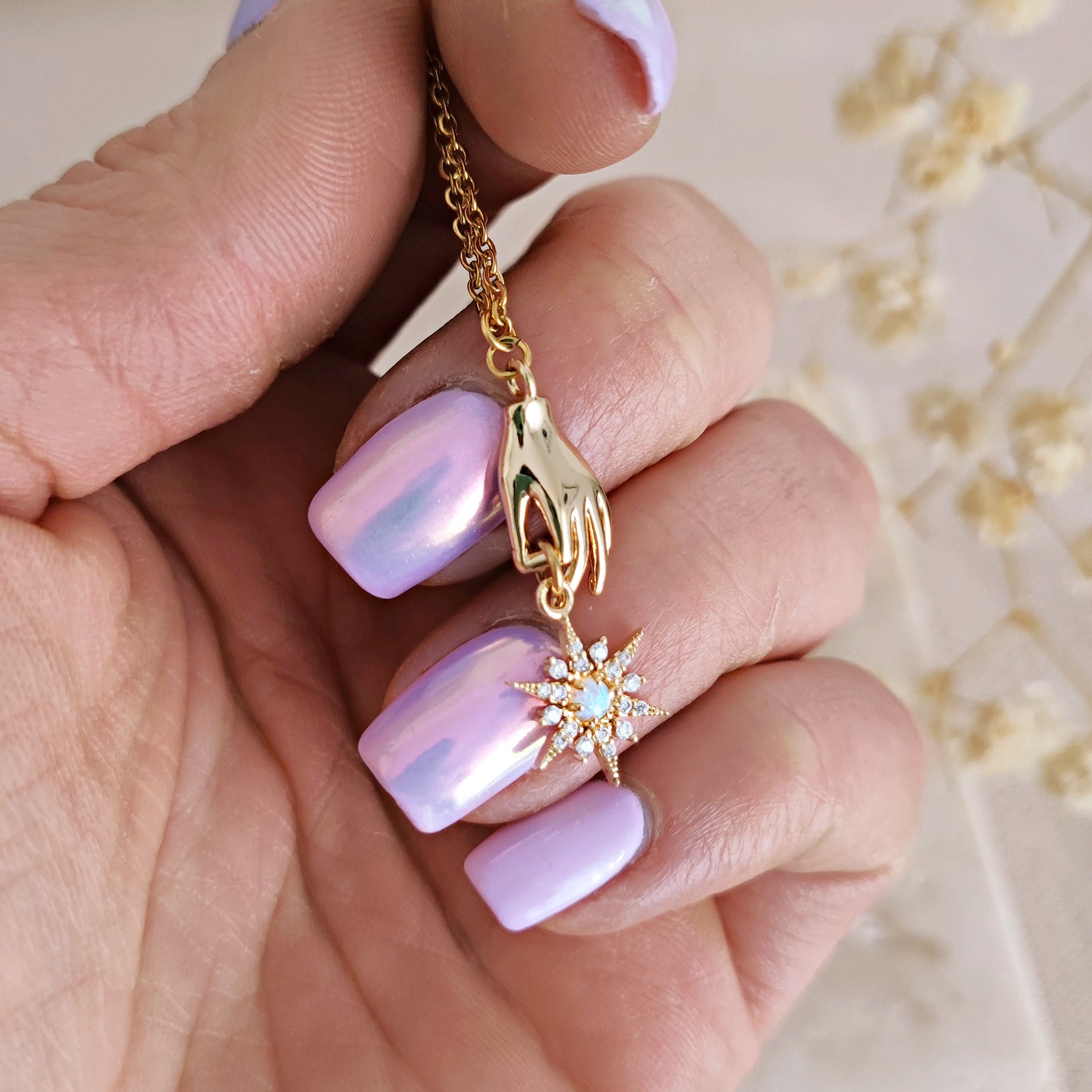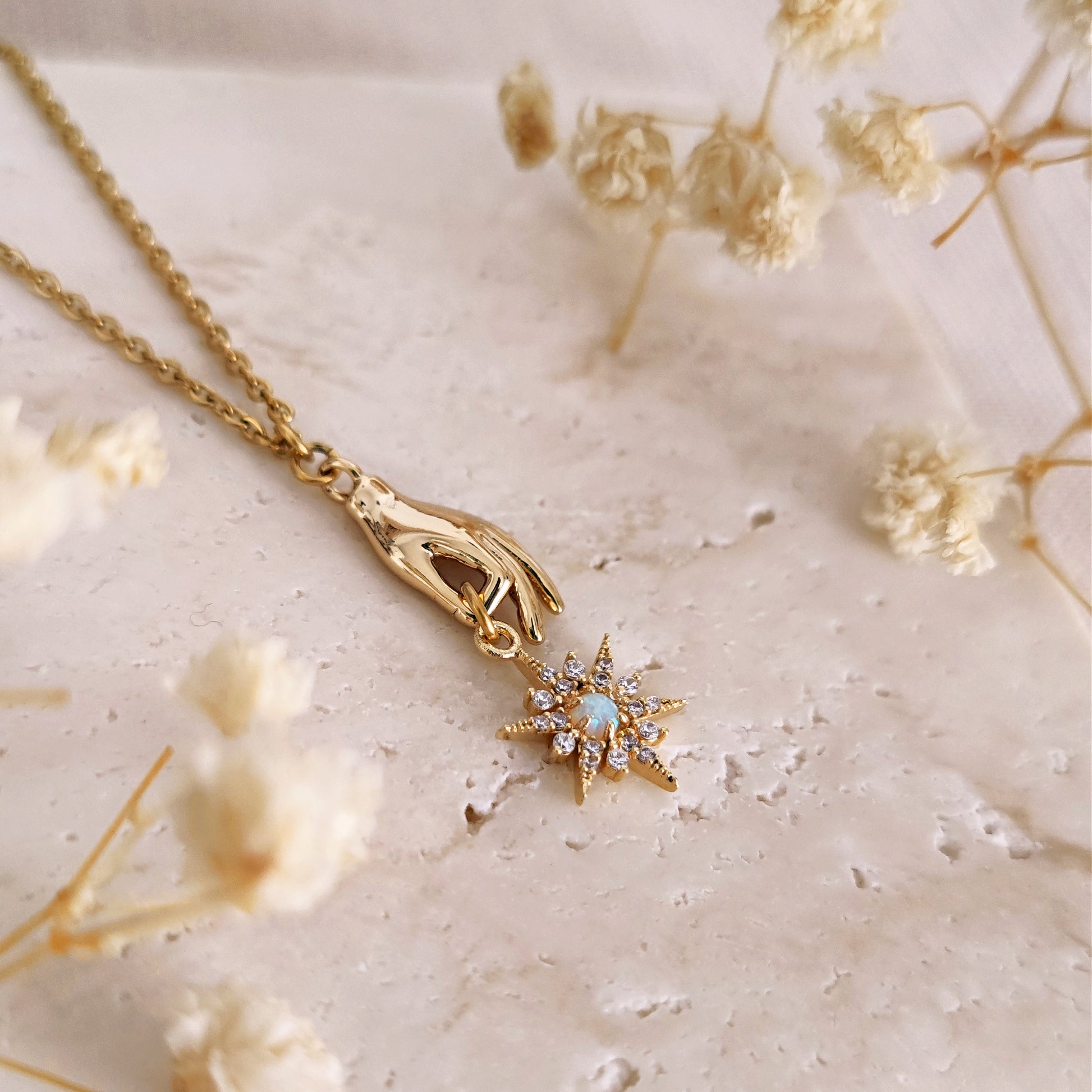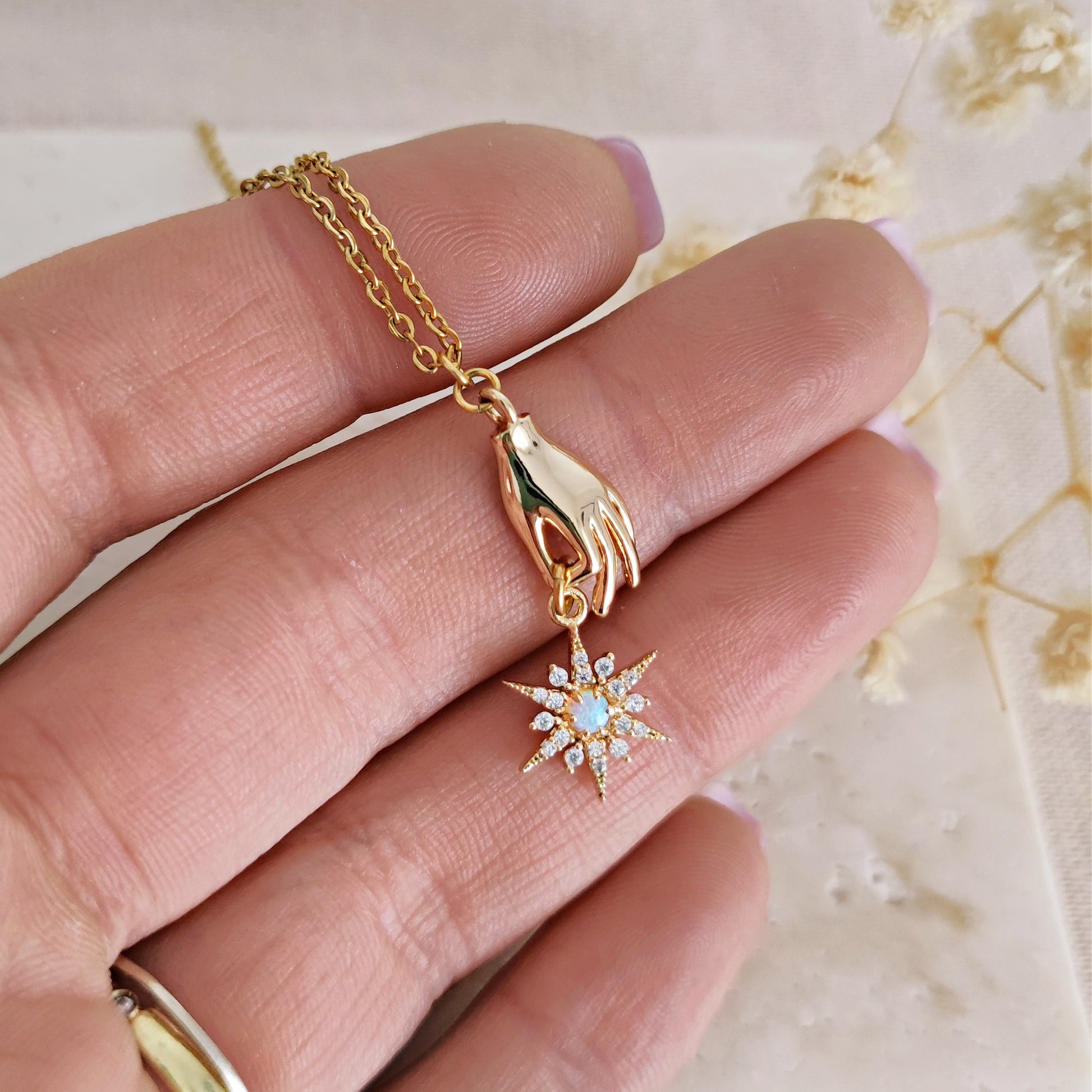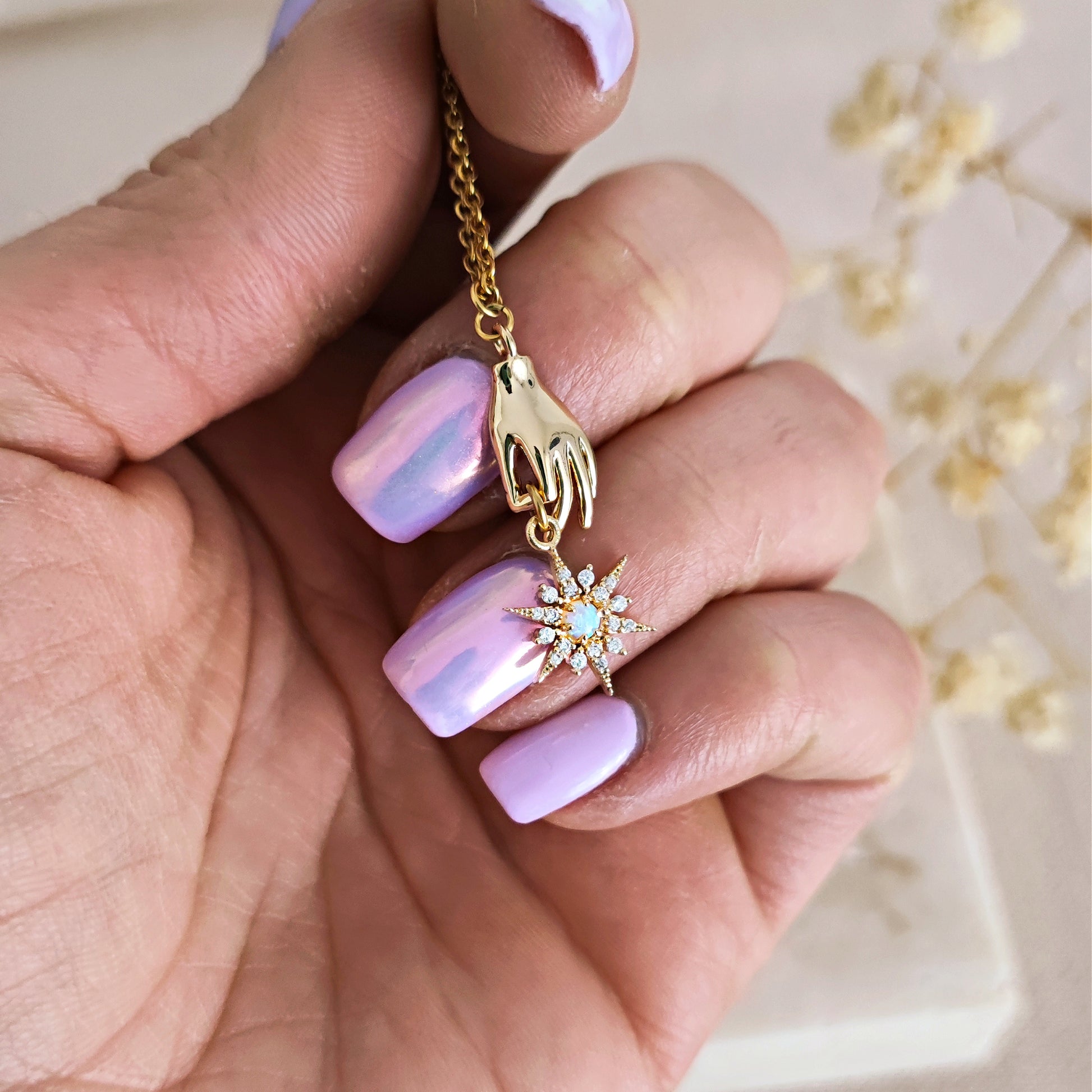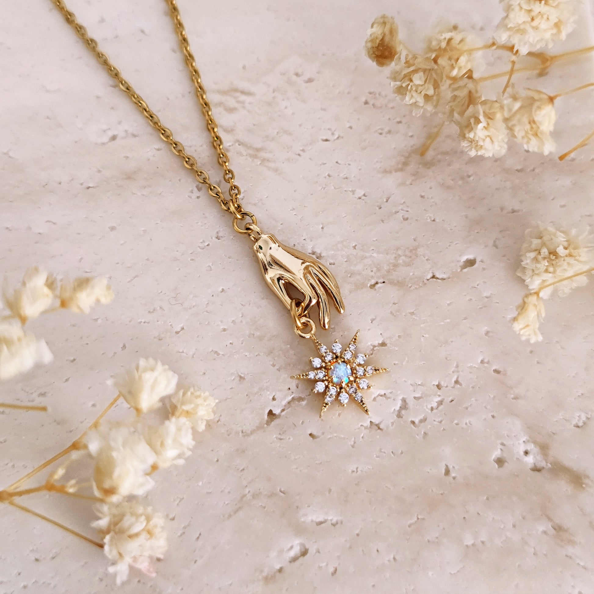 Questa delicata collana dorata con mano mistica e stella con Opale è perfetta per tutti coloro che amano il mondo mistico e magico!