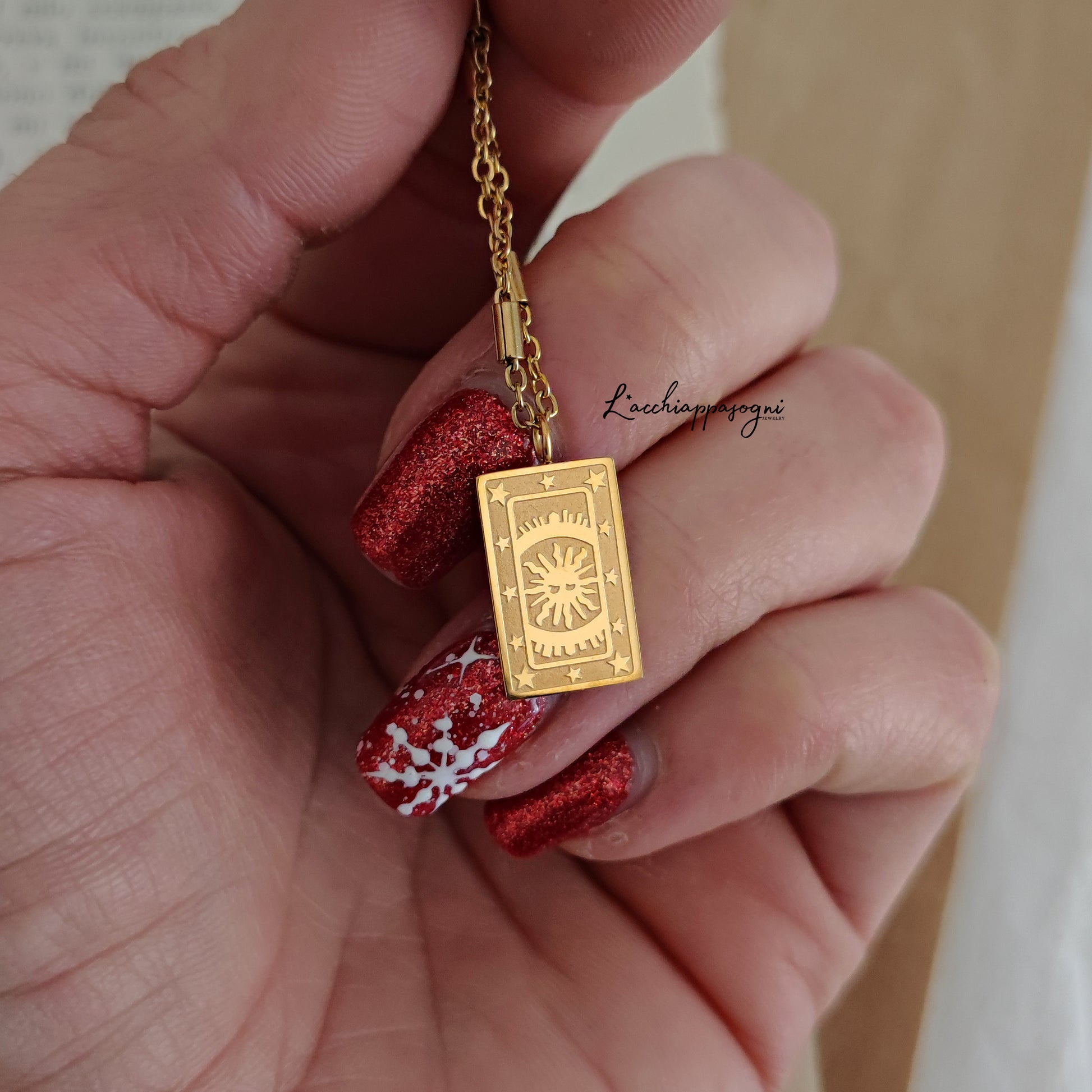 La collana "Mystic Tarot" è realizzata in acciaio inox placcato oro 14k, con un piccolo pendente a forma di carta dei Tarocchi "sole e stelle" in acciaio inox placcato oro 14k.