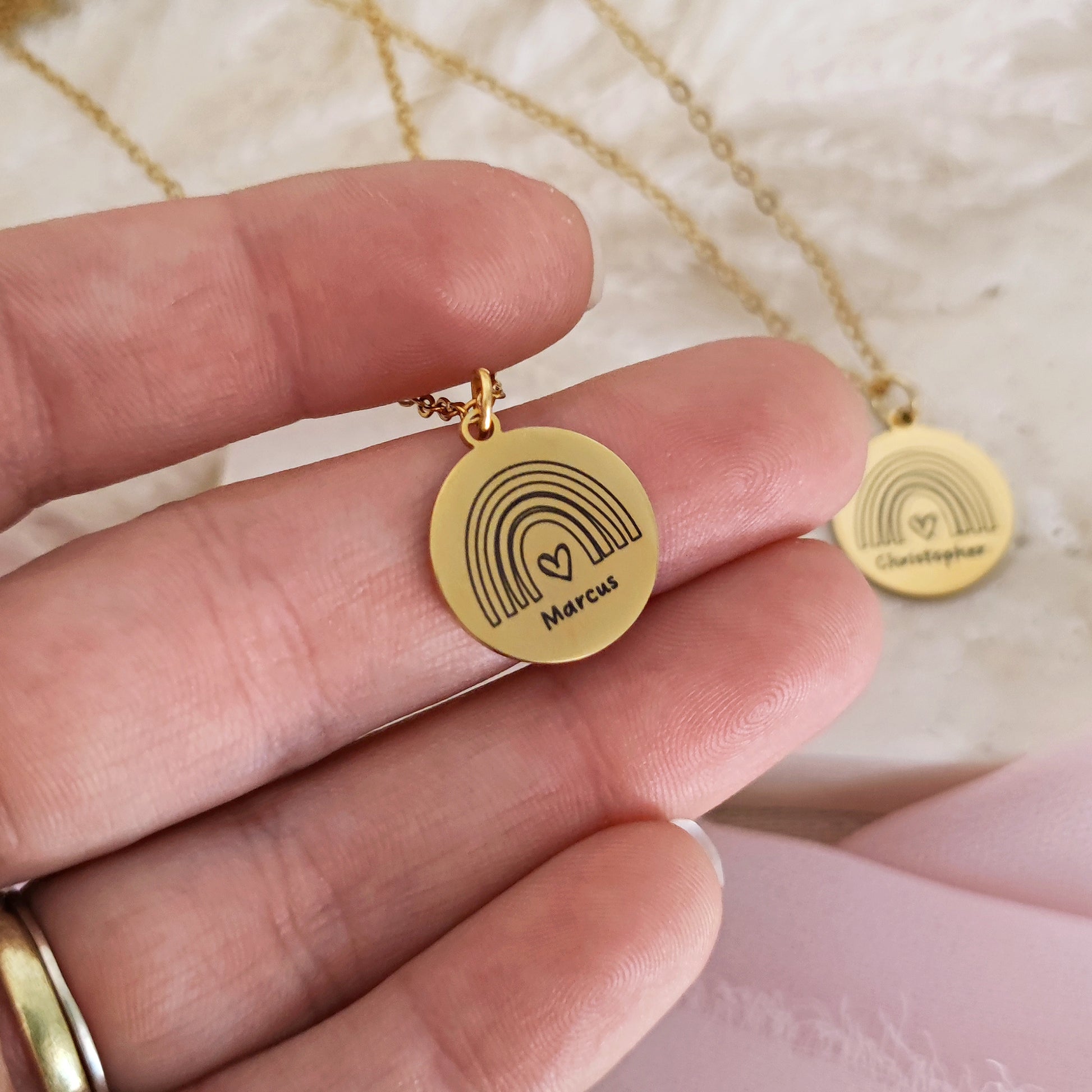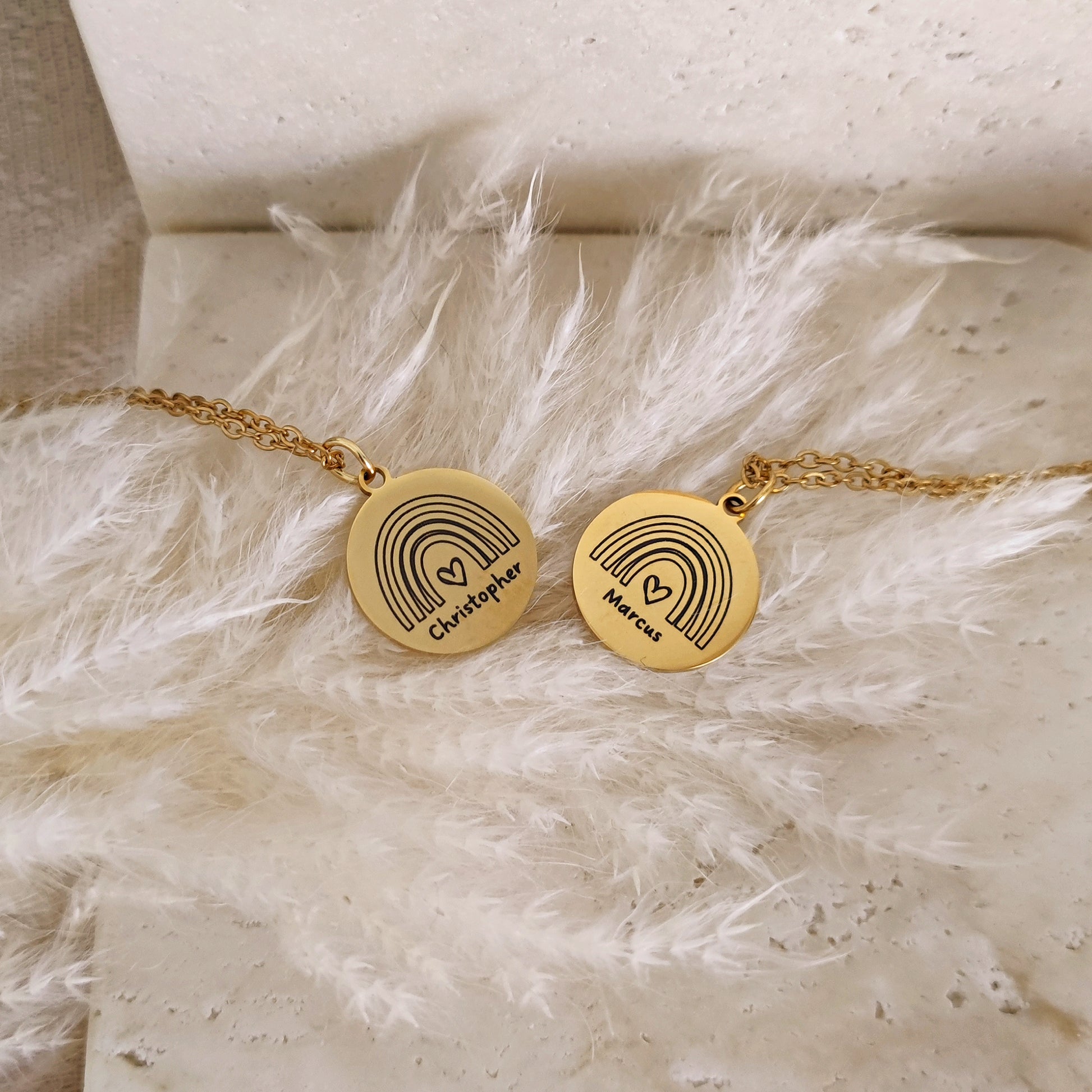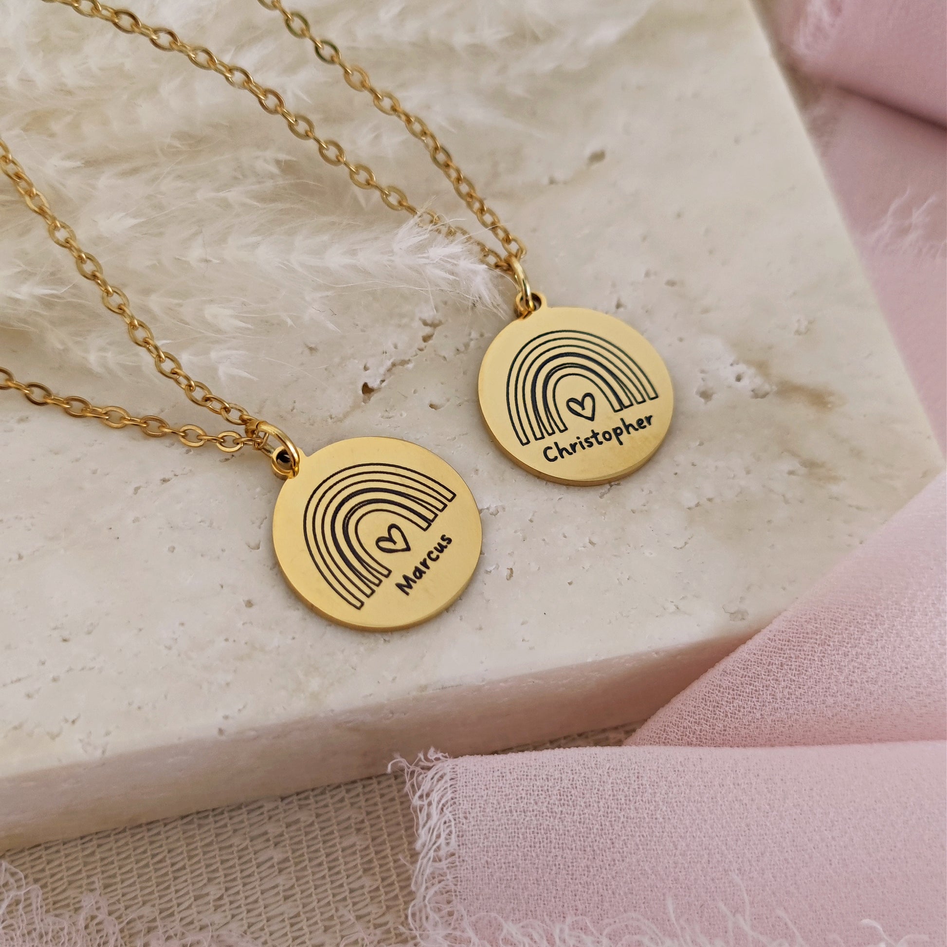 Interamente realizzate in acciaio inox per garantire qualità e durata, le collane presentano l'arcobaleno simbolo della comunità LQBTQ+ con cuoricino incisi a laser Diodo nel mio studio Lab, con nomi personalizzabili.