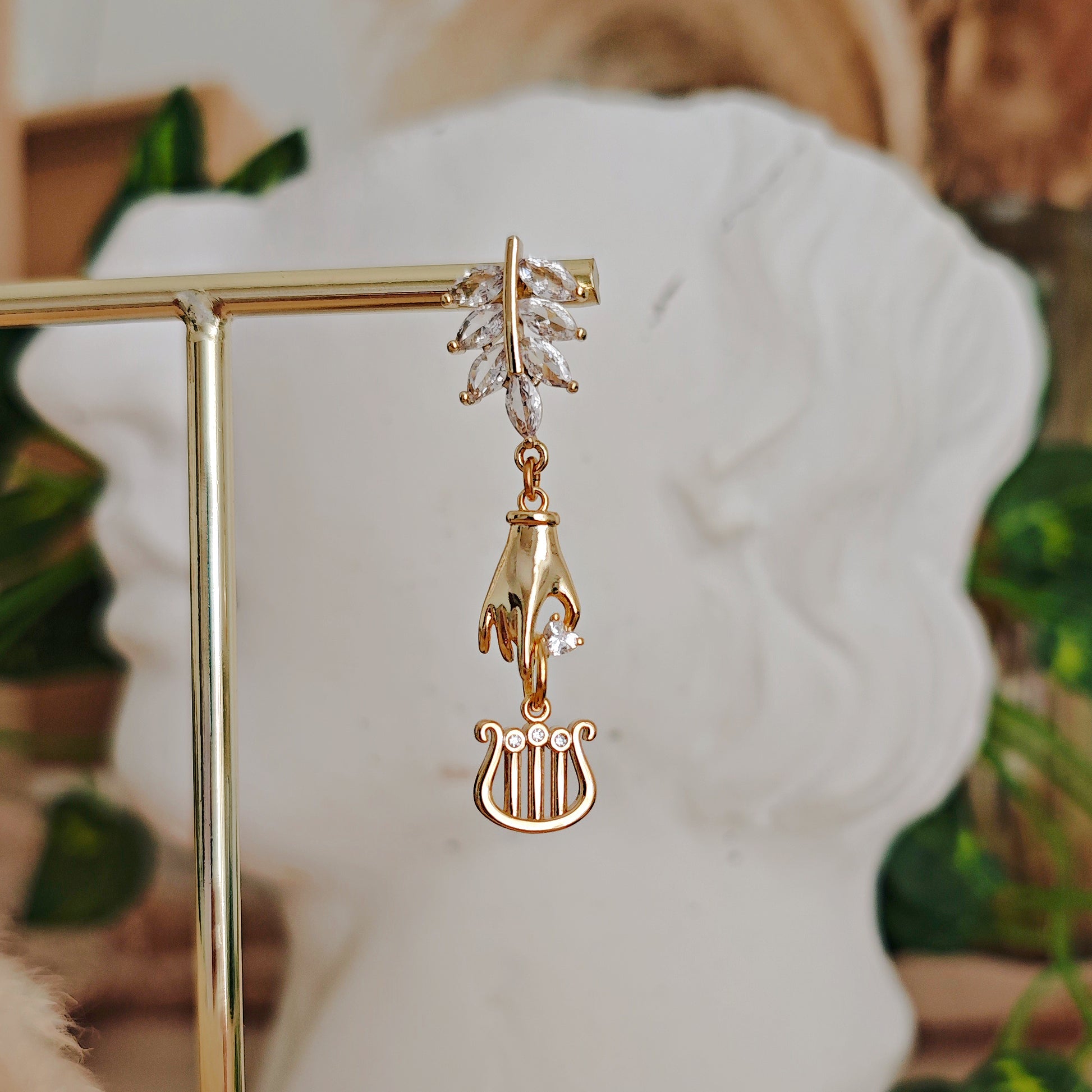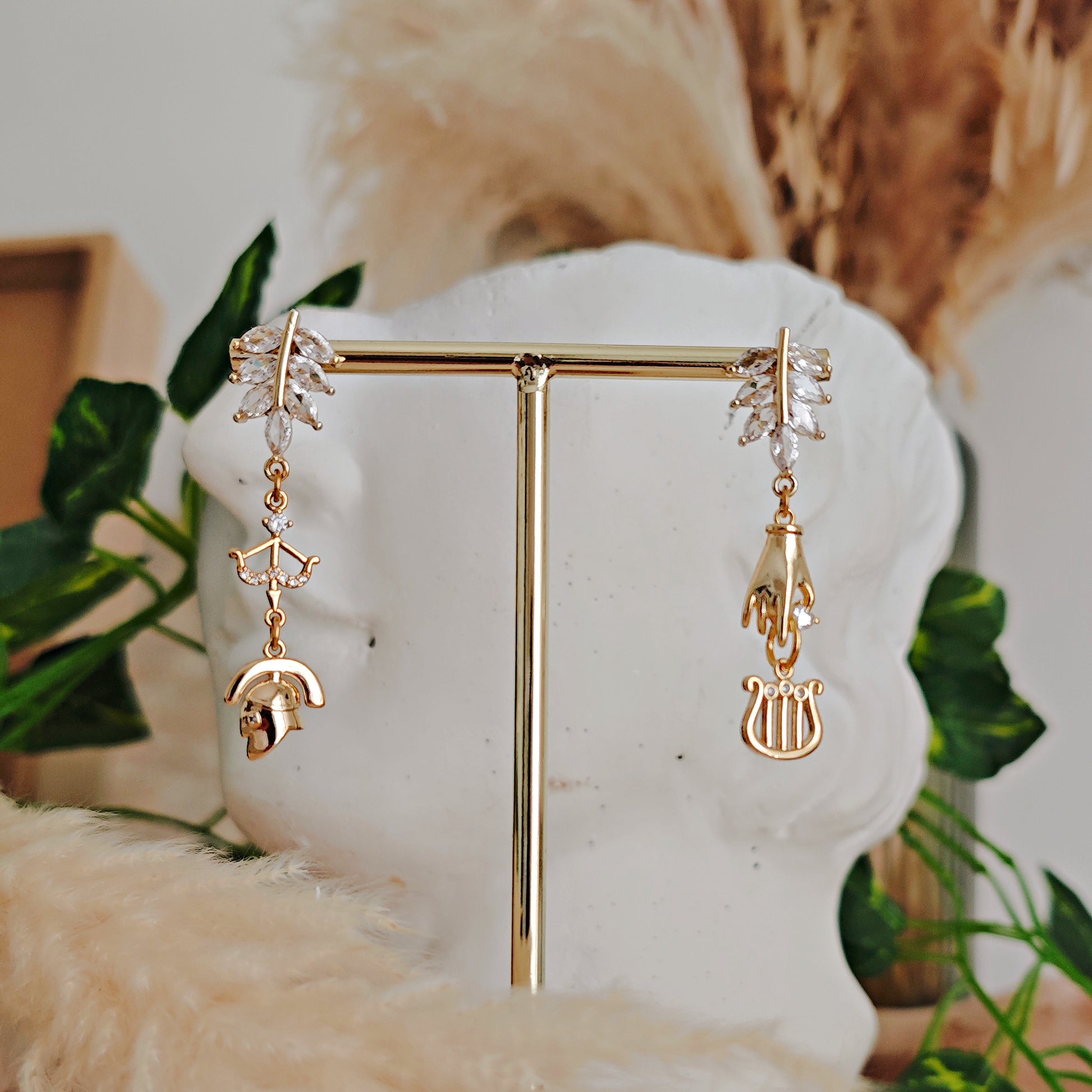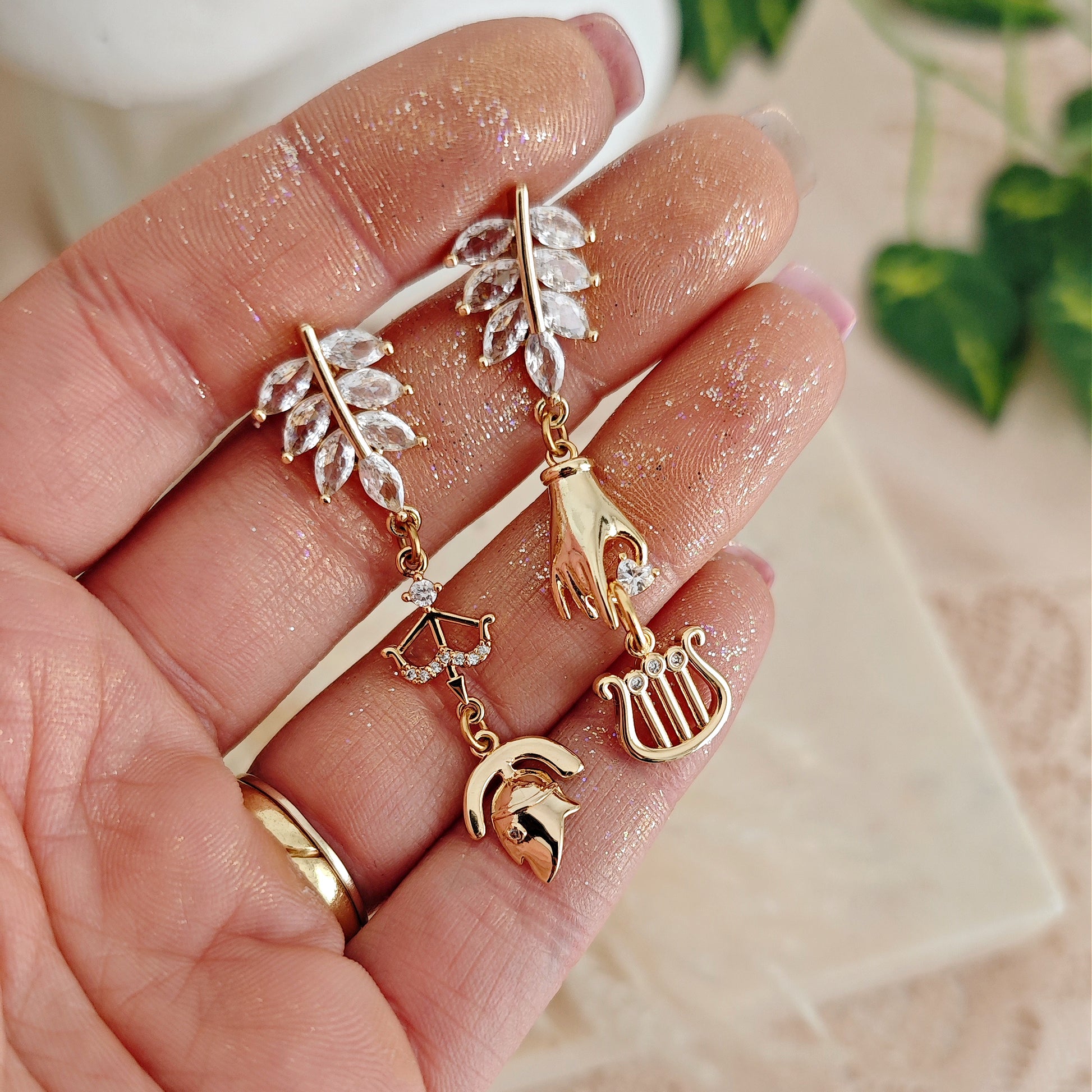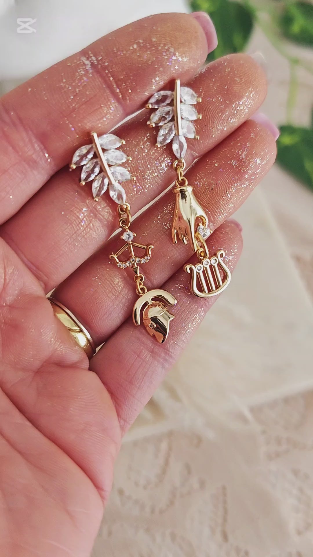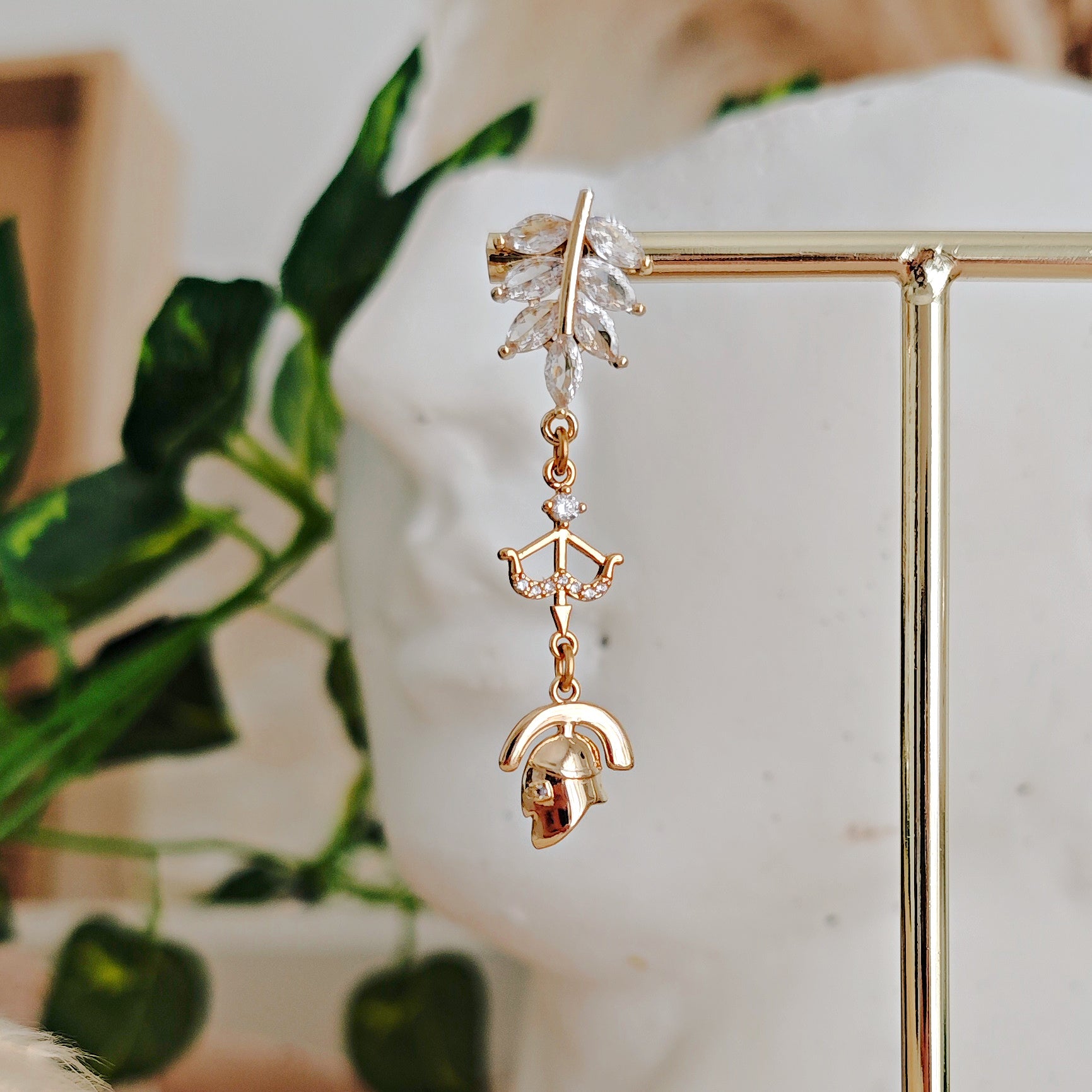 Con una simbologia che riprende uno dei retelling più amati di sempre su questo amore proibito, straziante e puro, gli orecchini sono composti da splendidi perni a forma di rami con foglie di cristalli cubic zirconia, arco e freccia con l'elmo di Achille da un lato e una mano che sorregge un piccolo cuore di cristallo con una lira dall'altro.