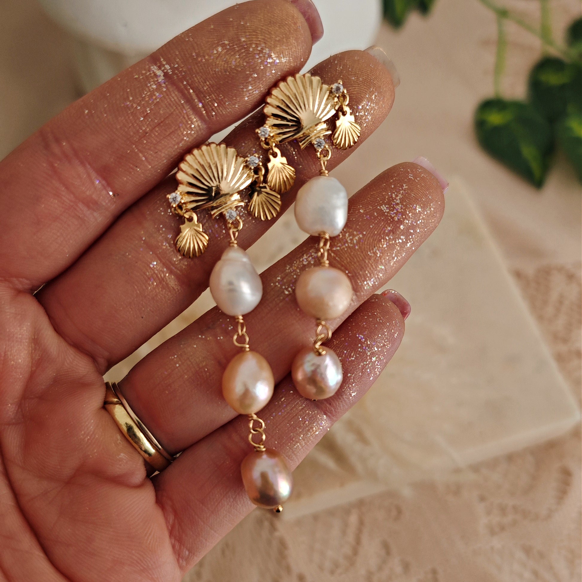Tutto negli orecchini pendenti "Aphrodite, the Beauty" richiama la bellezza, la sensualità, l'inarrivabile perfezione della Dea Afrodite, dea della bellezza, dell'amore, della passione e del piacere. Nata dalla spuma del mare e per questo legata ad esso in modo indissolubile, è qui celebrata con questi orecchini dai cui perni a forma di conchiglia pendono perle di fiume di tre bellissime tonalità.