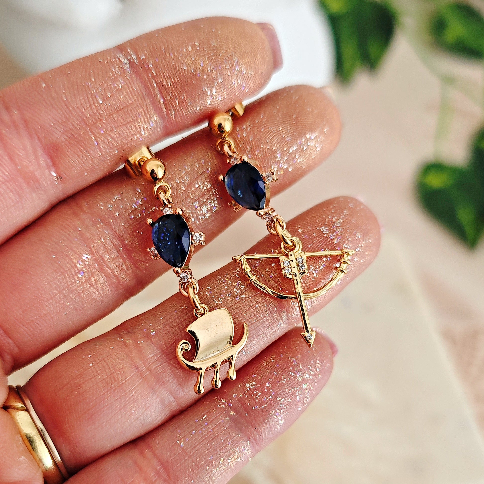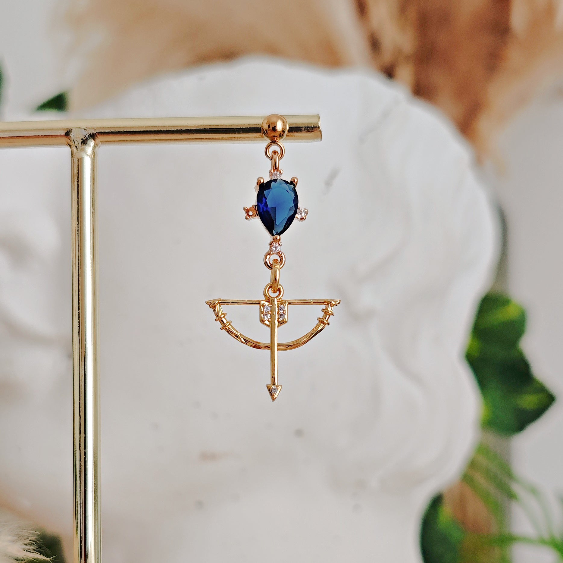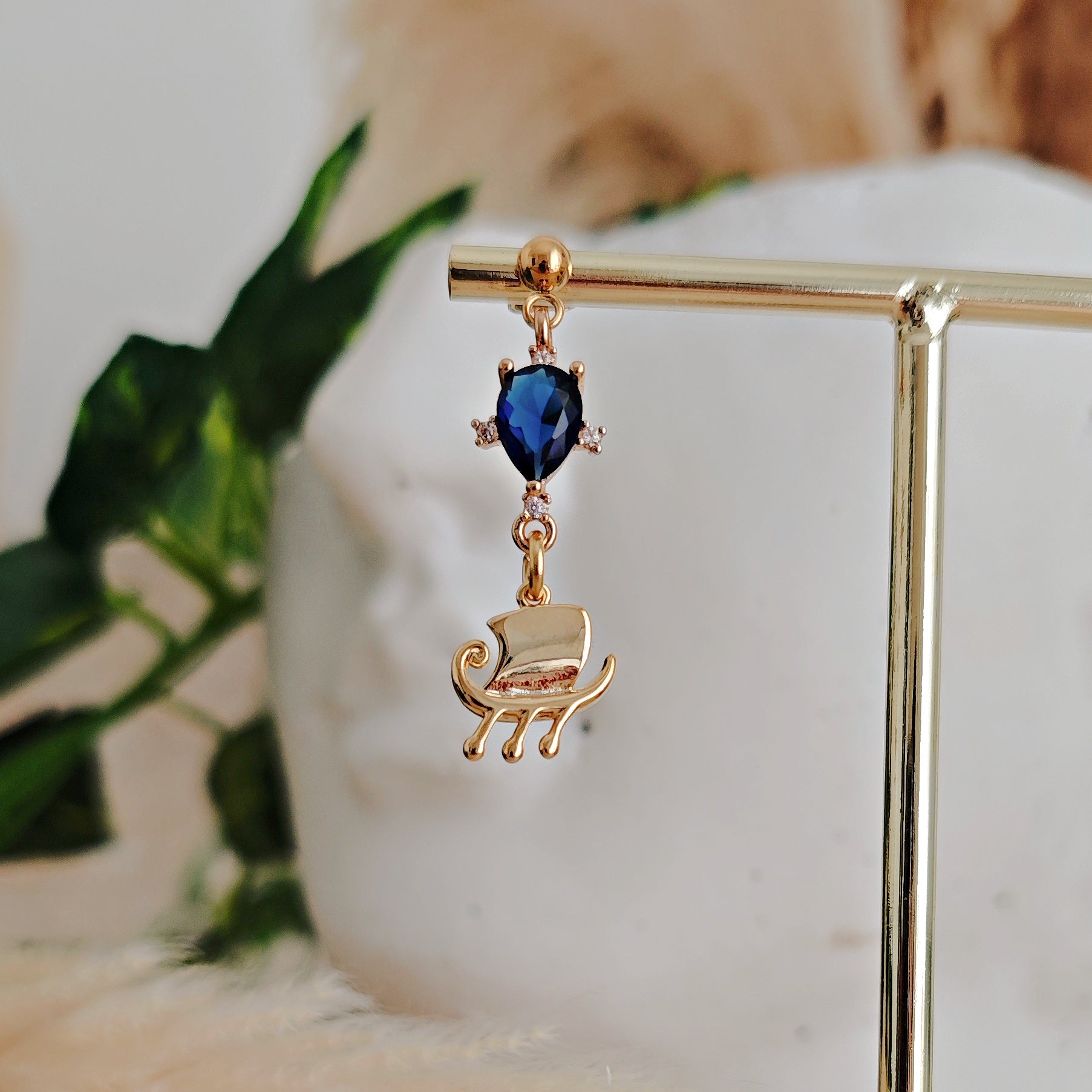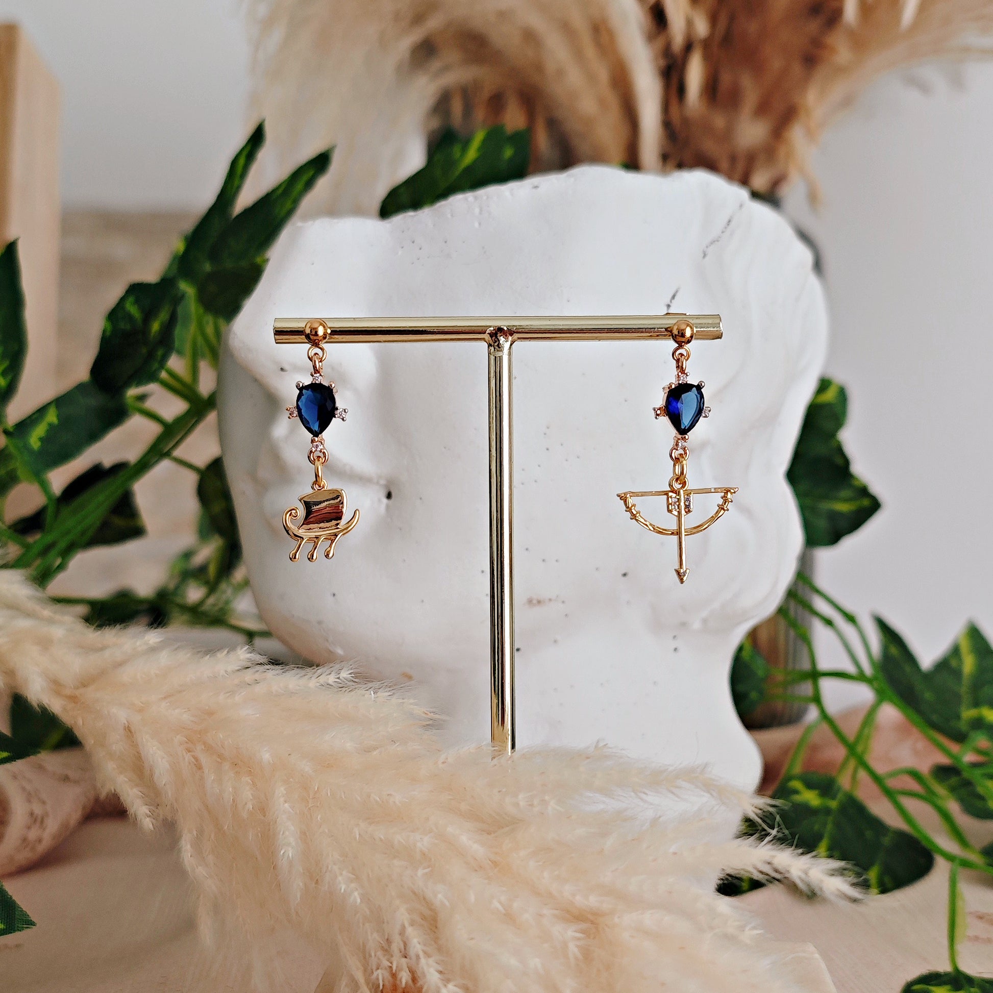 Dai perni a sfera in acciaio inox placcato oro 14k pendono due connettori in cristallo blu a simboleggiare il suo viaggio per mare, una nave e un arco con freccia.